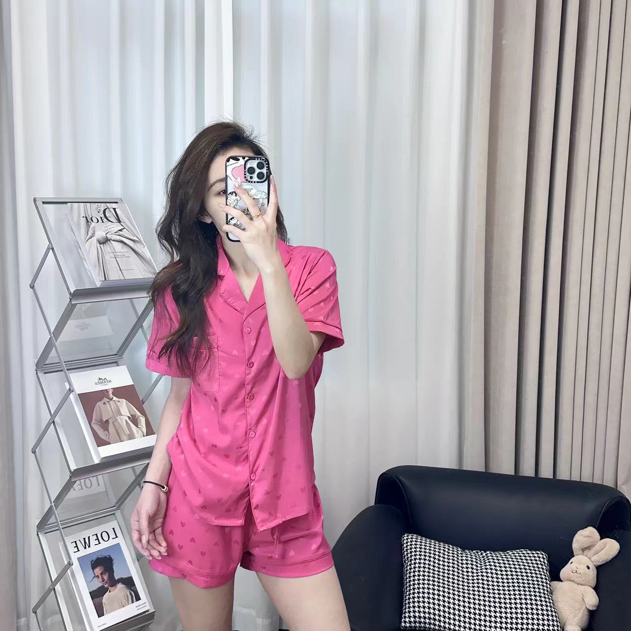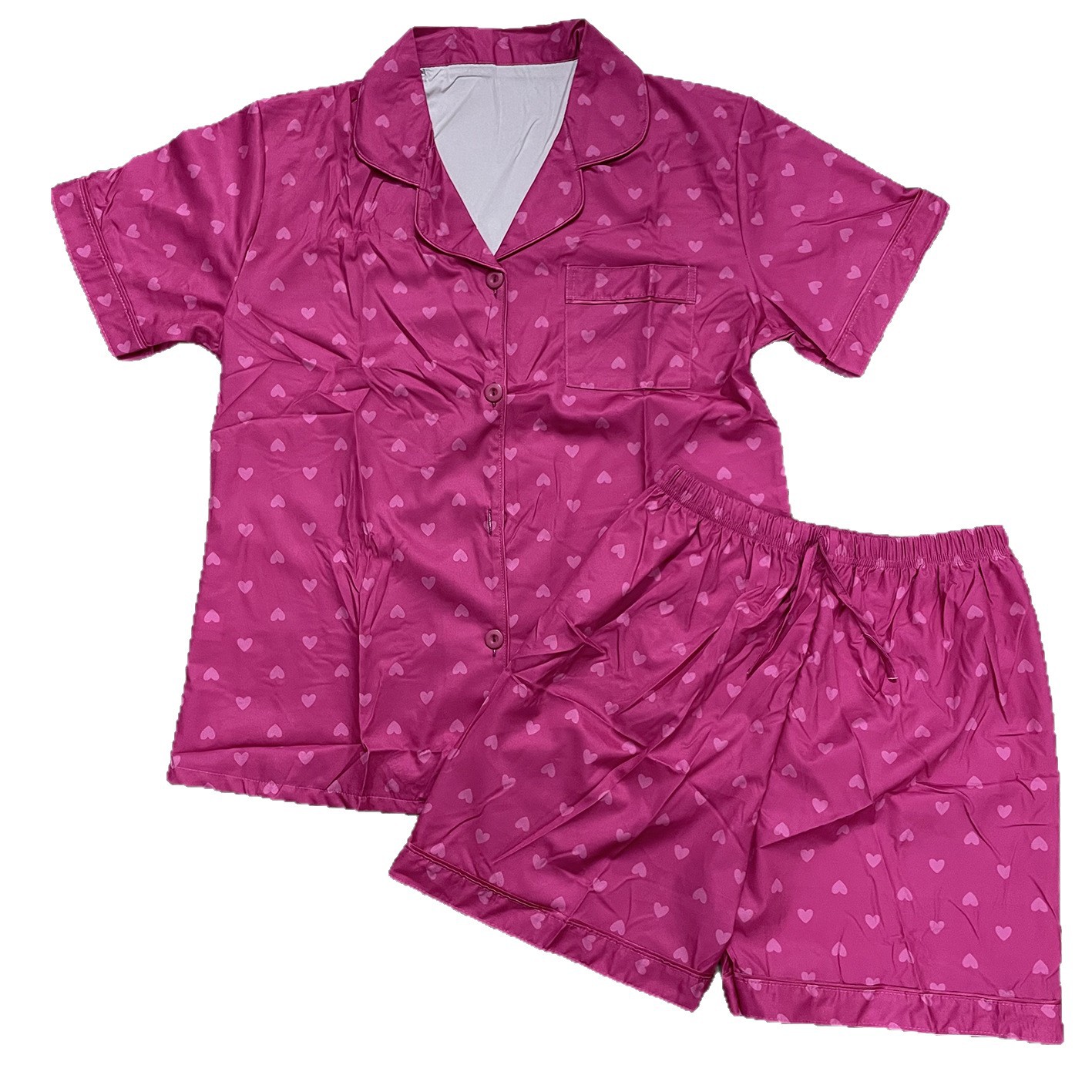 한국식 라이트 럭셔리 로즈 레드 작은 사랑 인쇄 잠옷 세트 여성 여름 반팔 반바지 홈 옷 투피스 얇은 세트