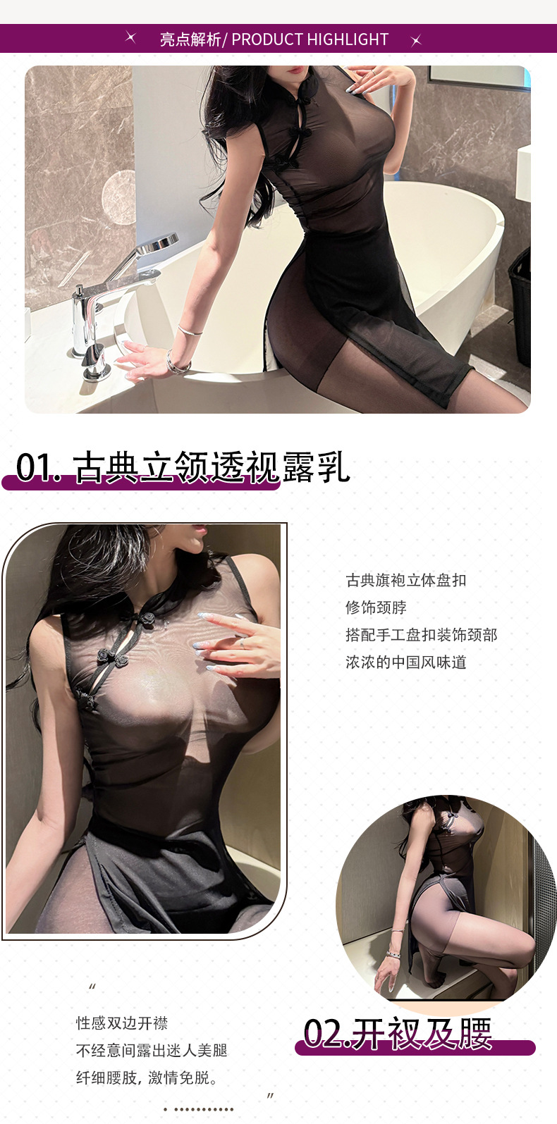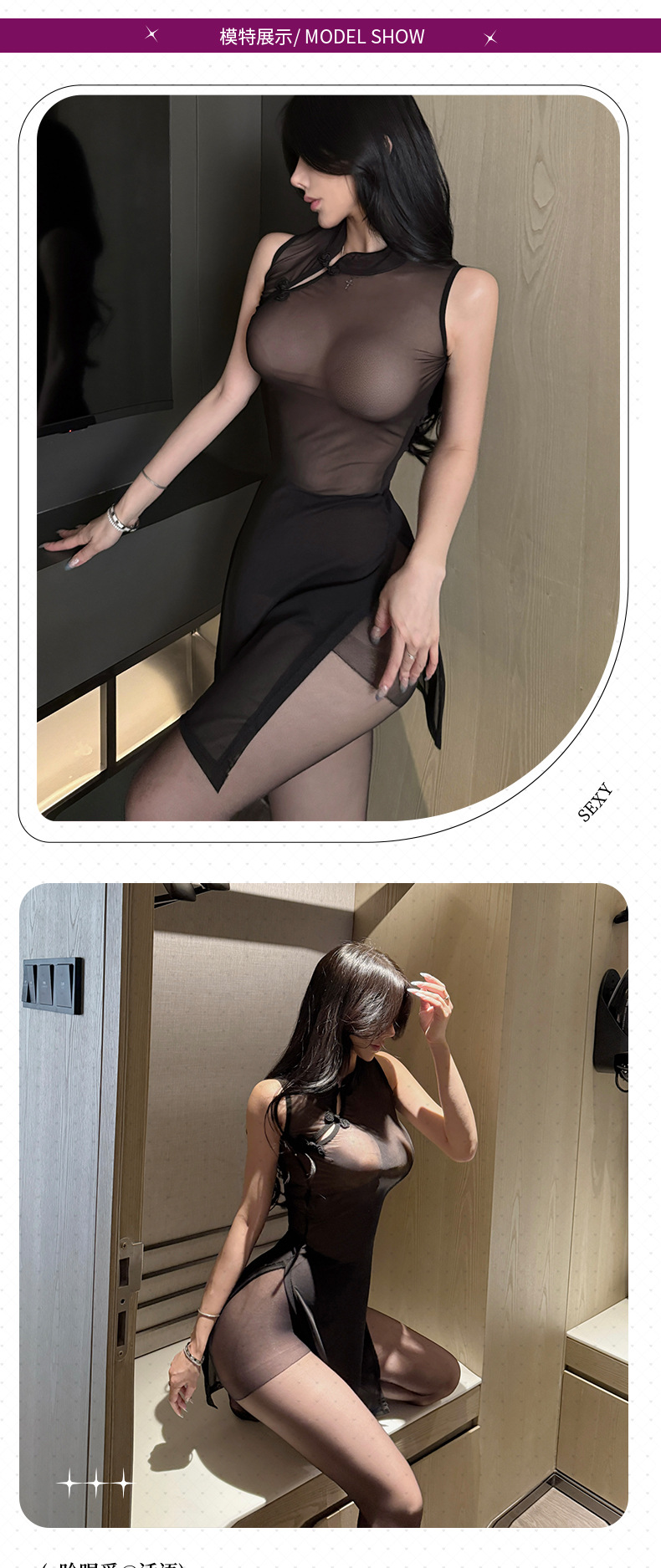 4476 섹시 시스루 치파오 + S3 블랙 플랫 스타킹