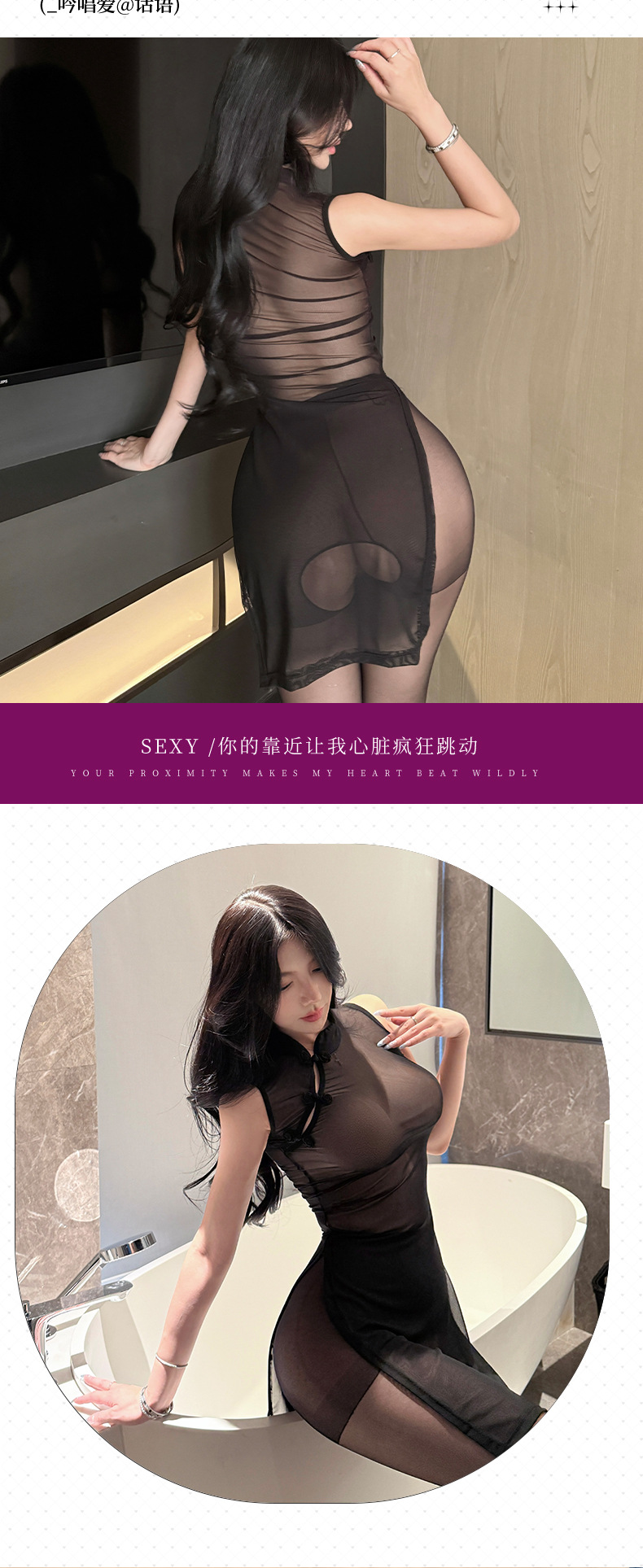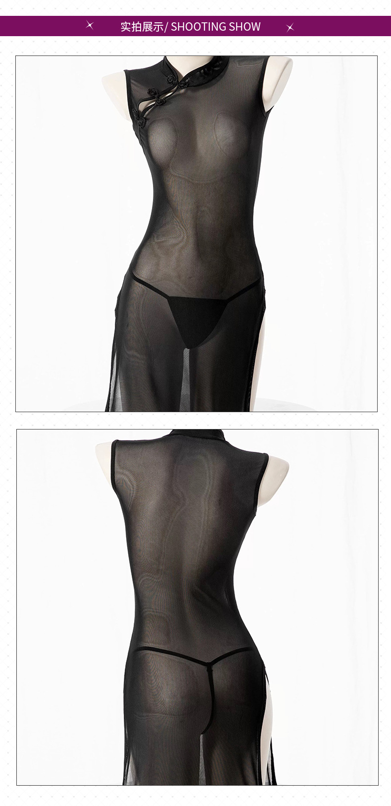 Guiyun 섹시한 속옷 섹시한 복고풍 치파오 드레스 속이 빈 가슴 메쉬 시스루 잠옷 유혹 qqny 여성