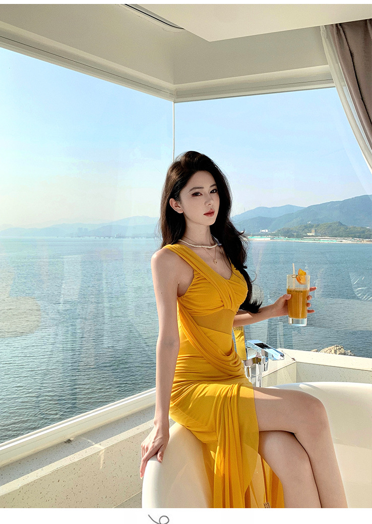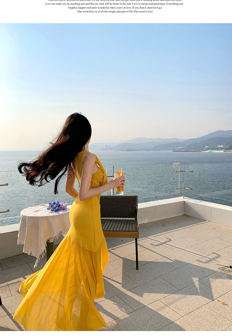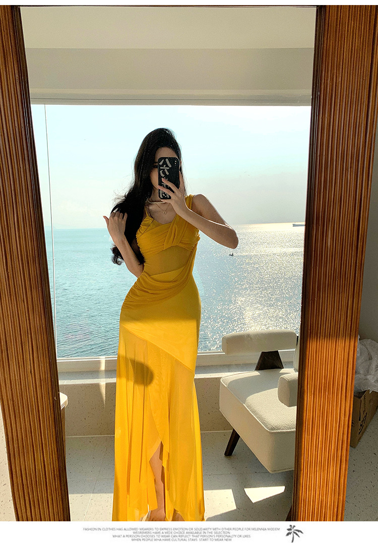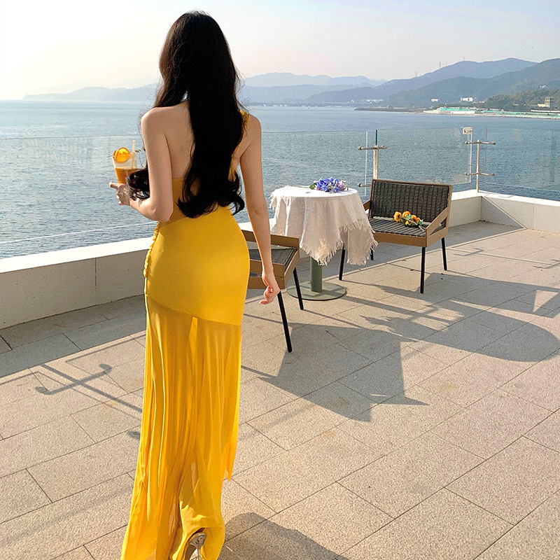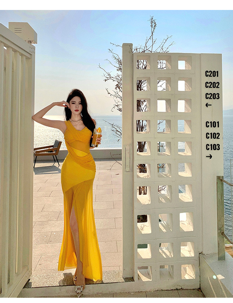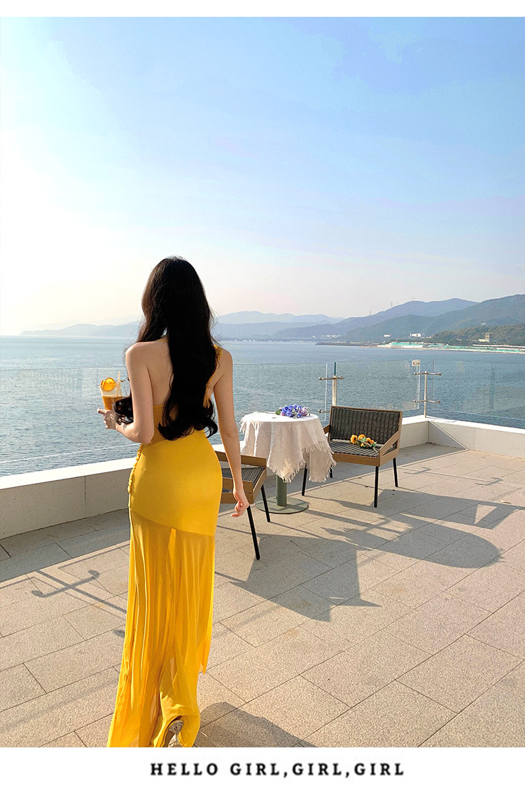 태국 여행 및 휴가 사진 촬영 비치 드레스 순수한 욕망 섹시한 메쉬 오프 숄더 서스펜더 드레스 슬림핏 힙 커버 롱 스커트