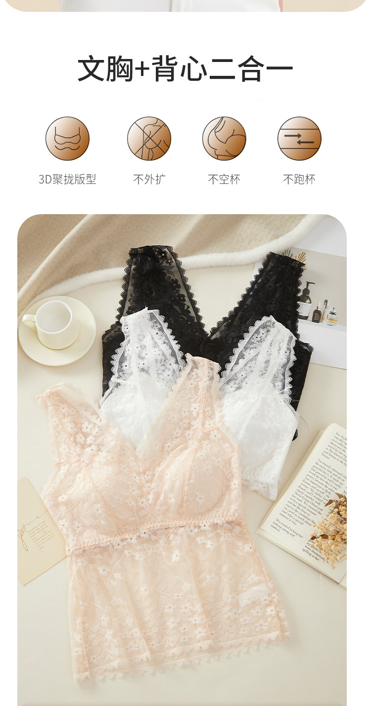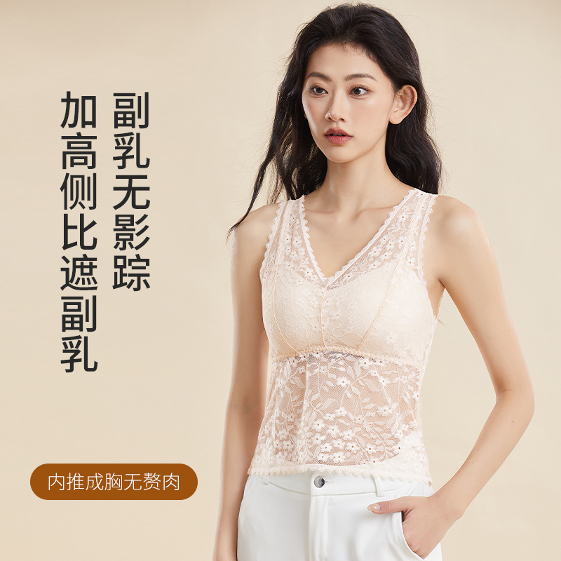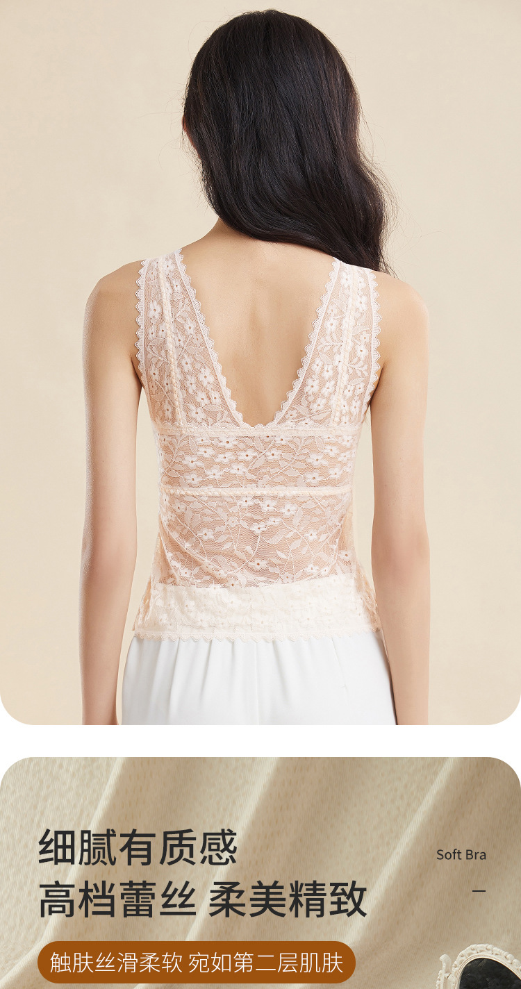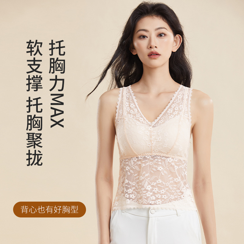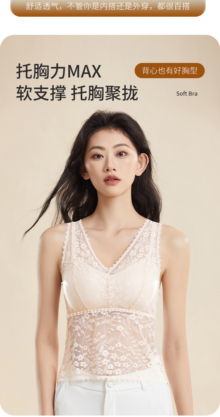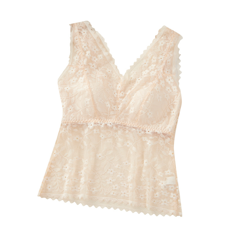 여름 필수품, 얇고 섹시한 레이스 브이넥 브라프리 올인원 고정컵 가슴 서포트 캐미솔
