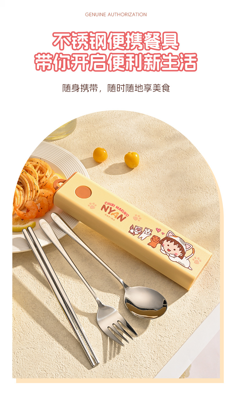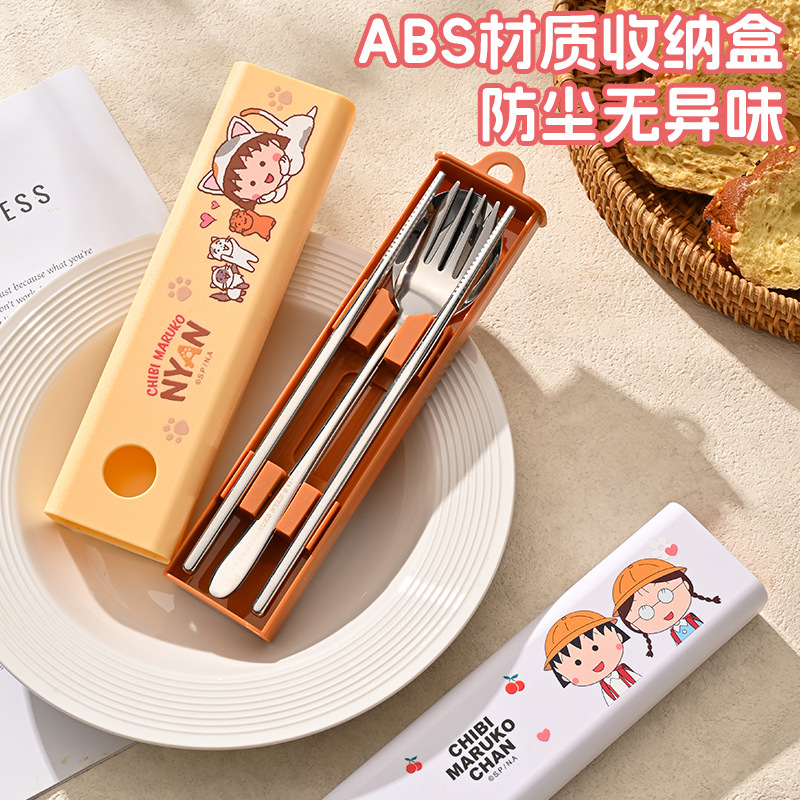 정품 체리 마루코짱 304 스테인레스 스틸 휴대용 식기 학생 테이크아웃 3피스 포크 스푼 젓가락 세트