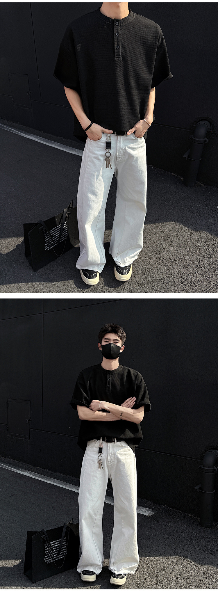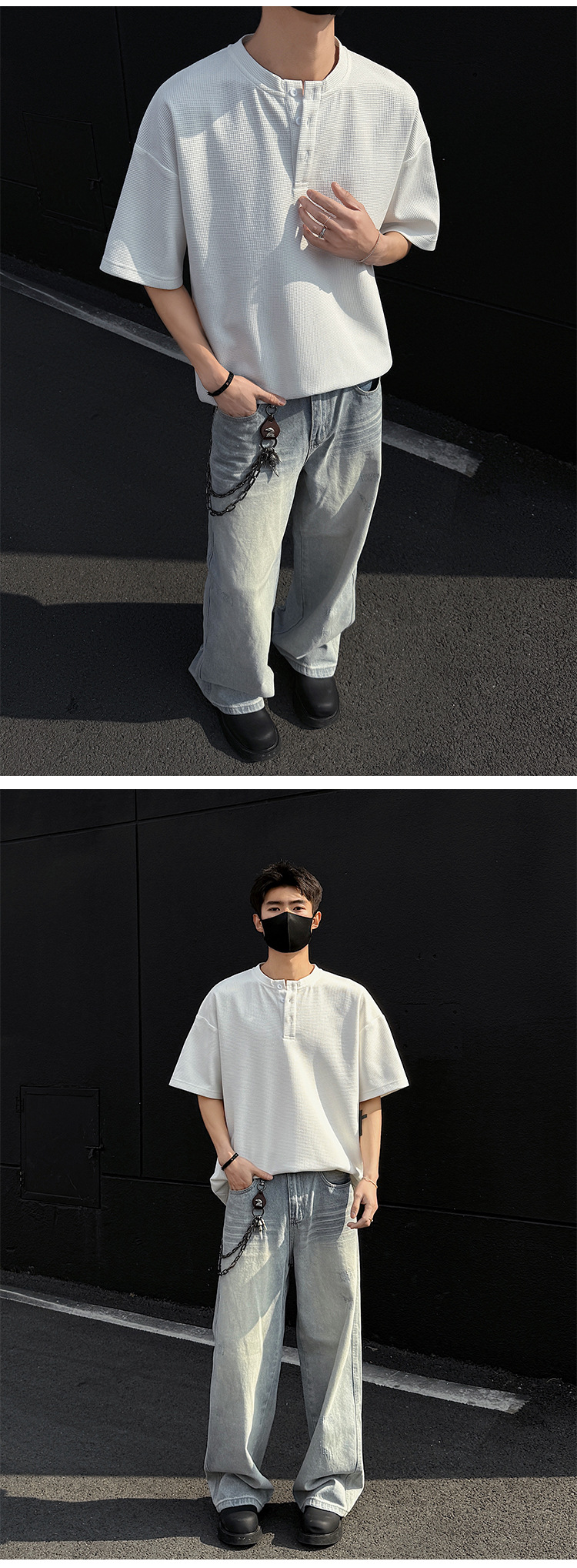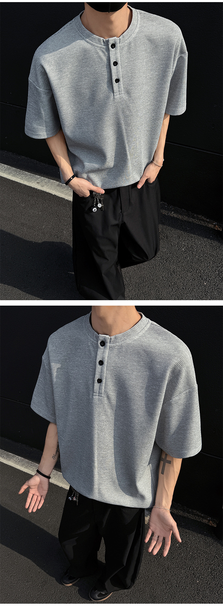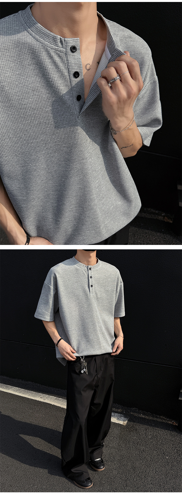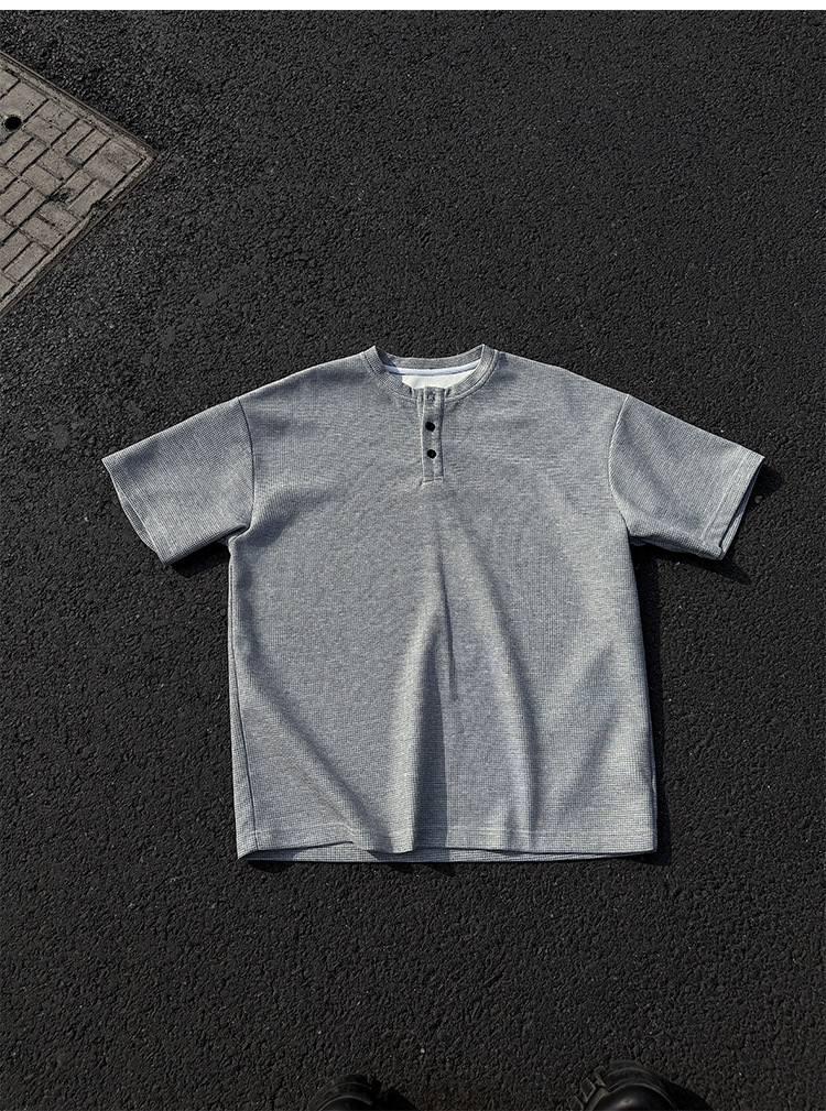 와플 반 지퍼 티셔츠 남자의 반소매 여름 유행과 잘 생긴 남자의 여름 미국 헨리 셔츠 반소매 티셔츠