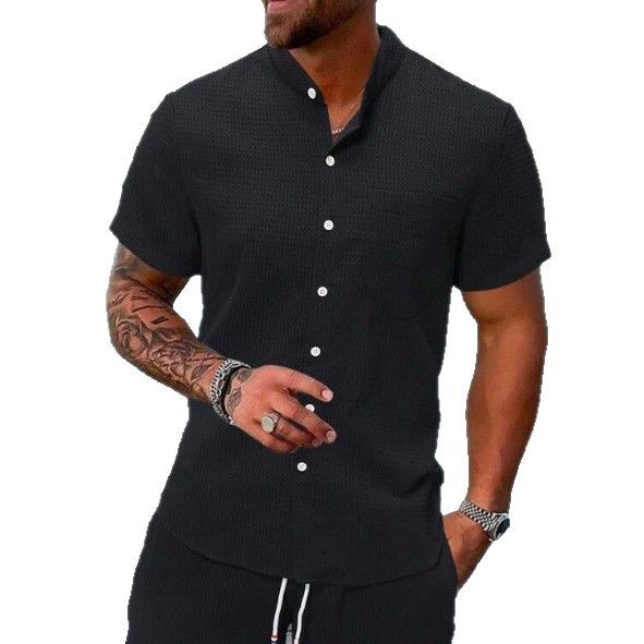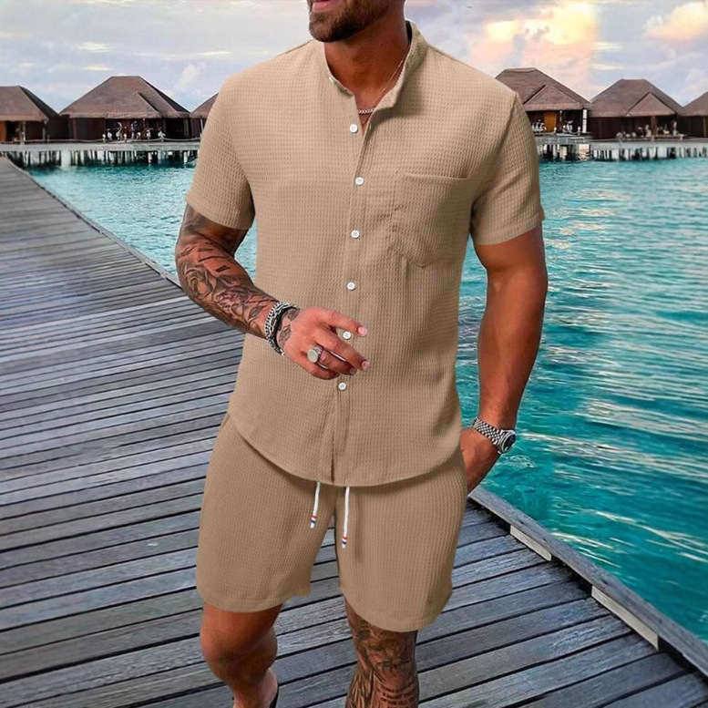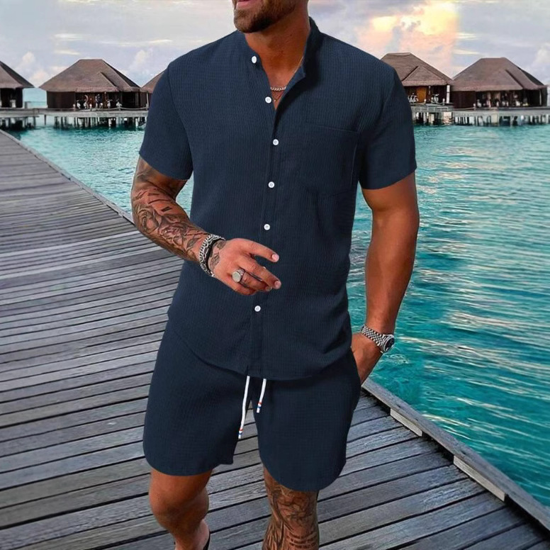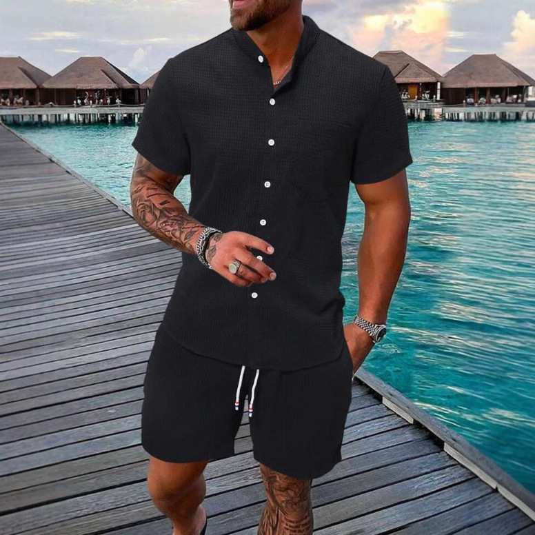 여름 아마존 캐주얼 2피스 남성용 심플 솔리드 컬러 질감 반소매 셔츠 및 반바지 세트
