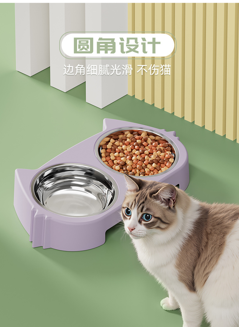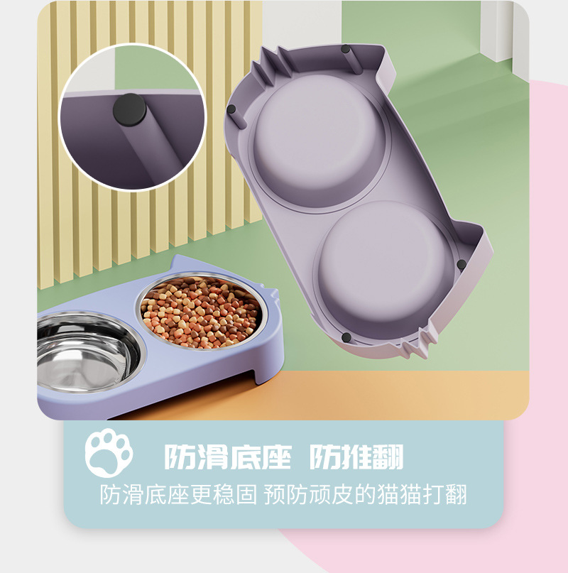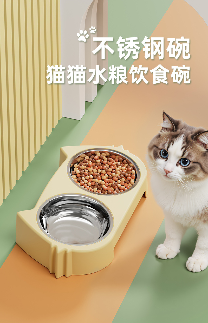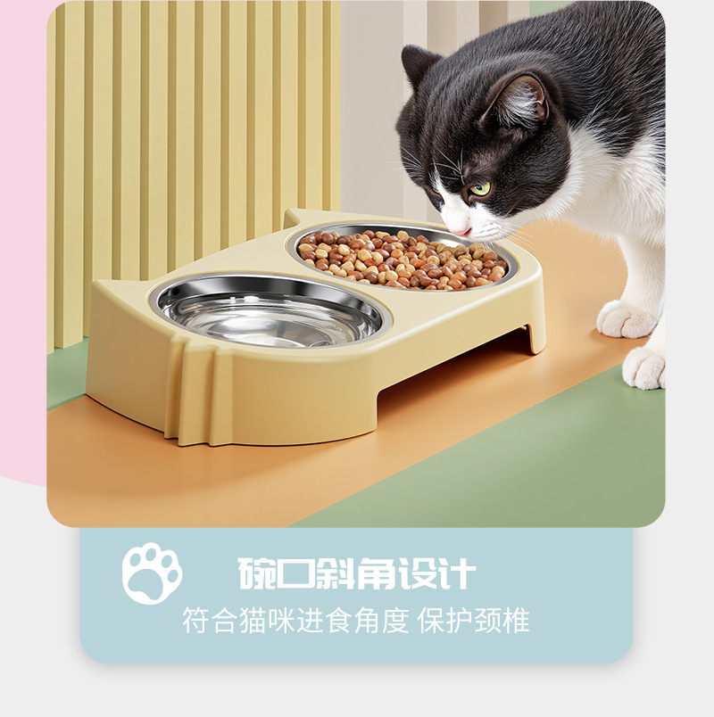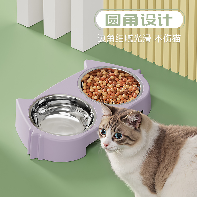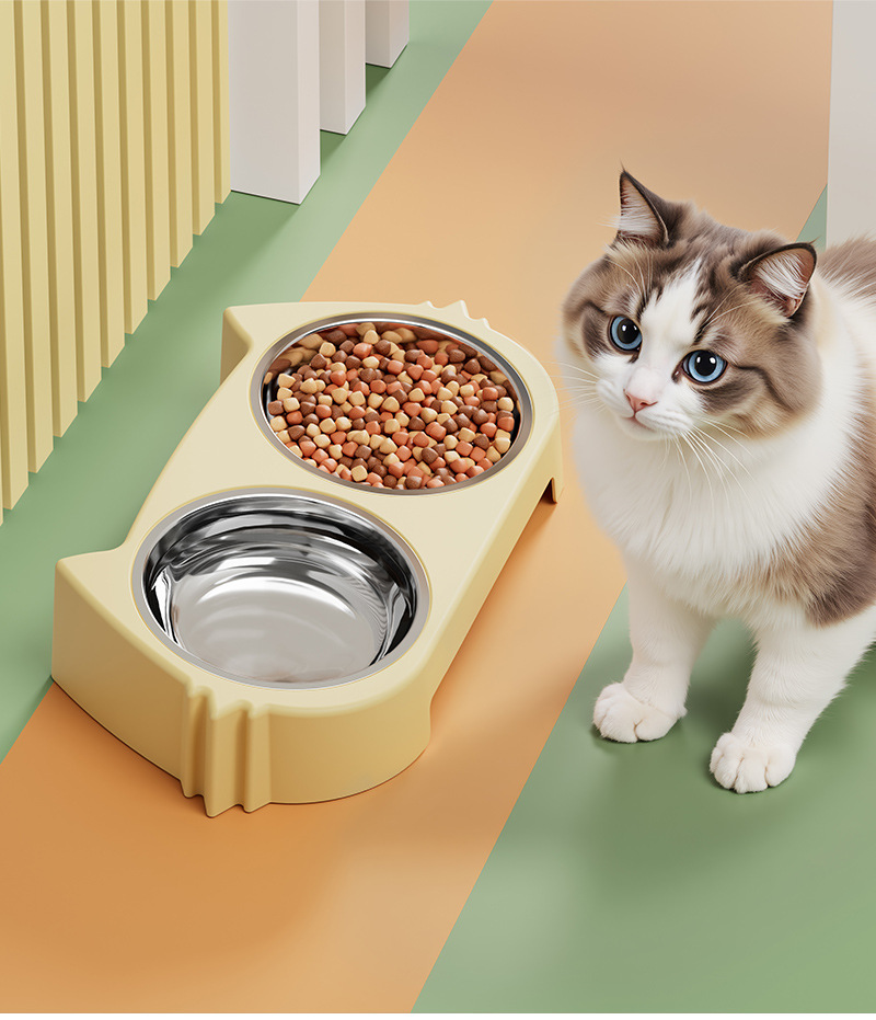 새로운 스테인리스 고양이 그릇, 이중 그릇 일체형 애완동물 그릇, 귀엽고 넘어지지 않는 2-in-1 급식 및 급수 고양이와 강아지 식기