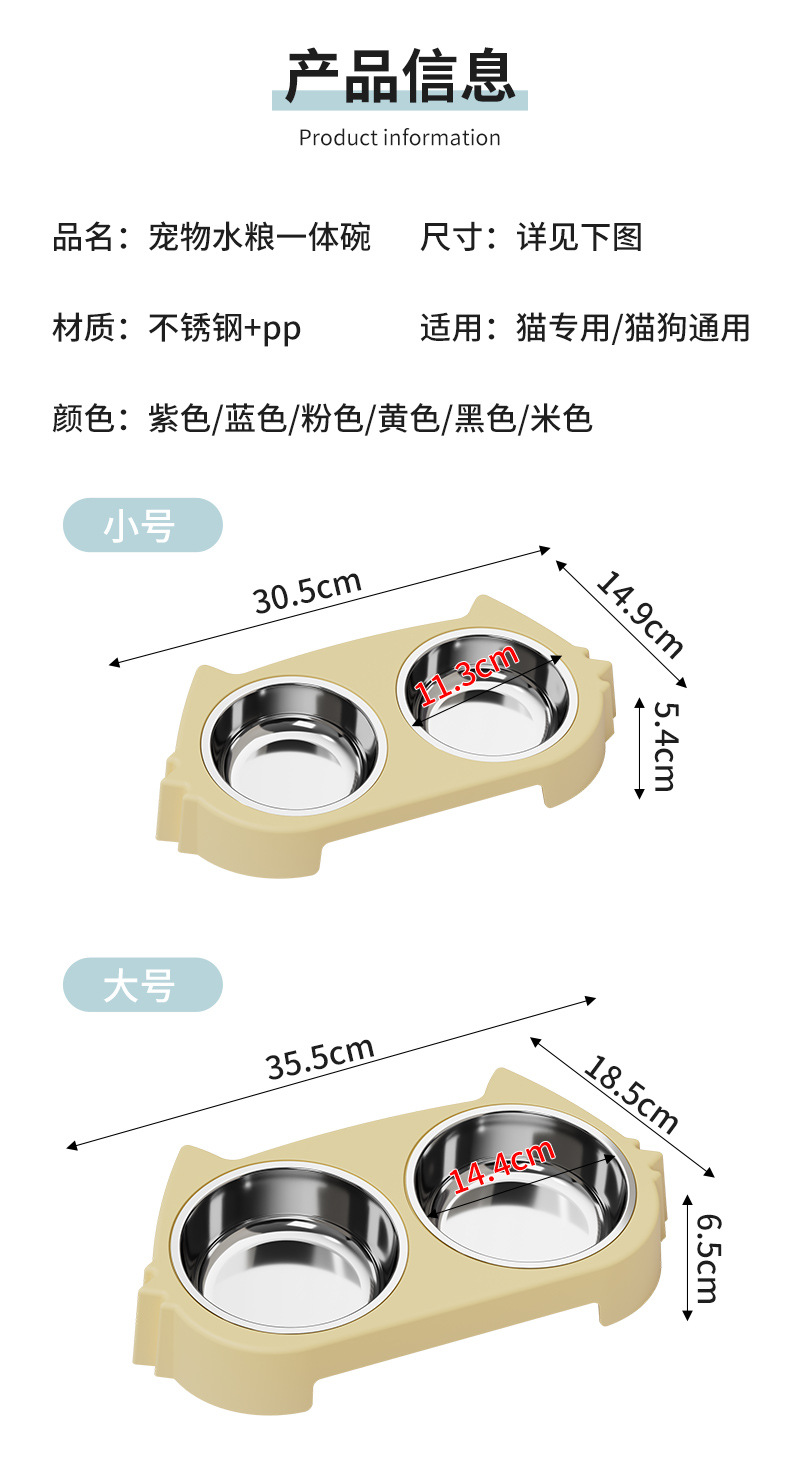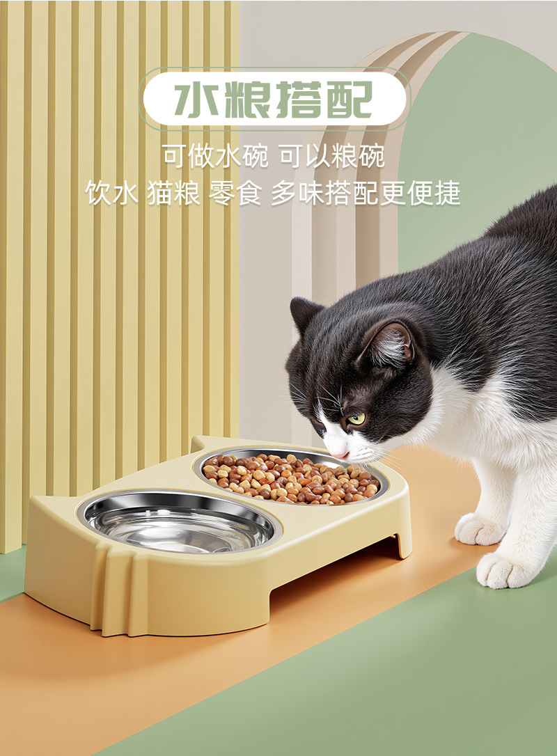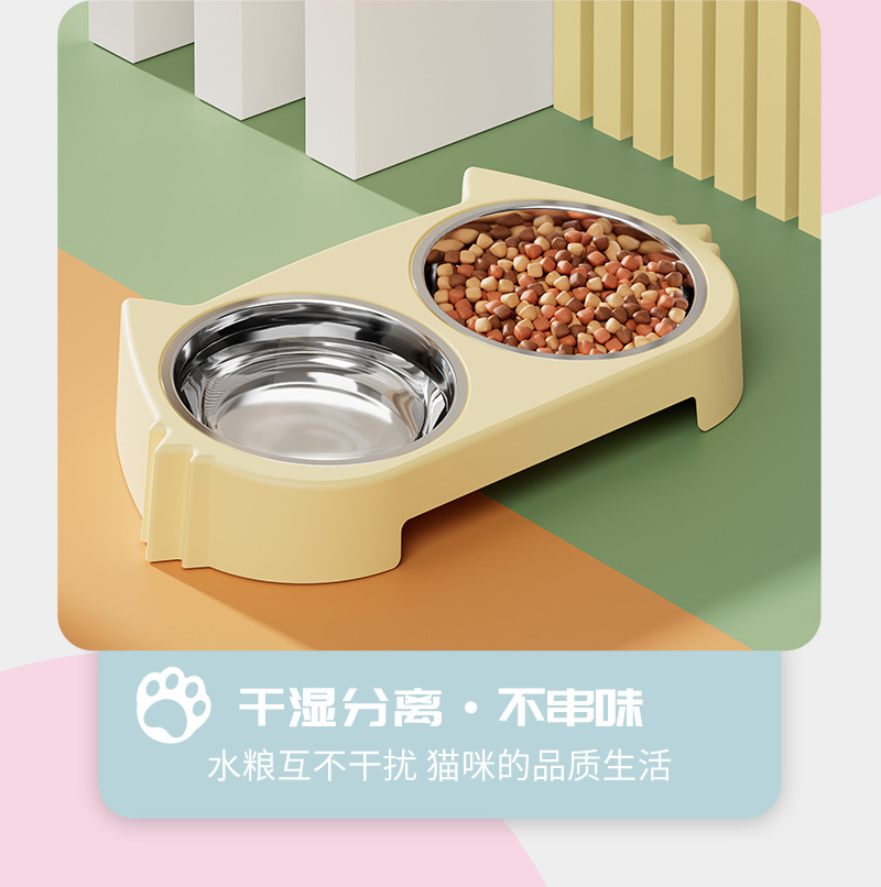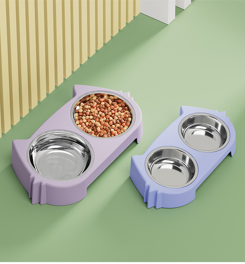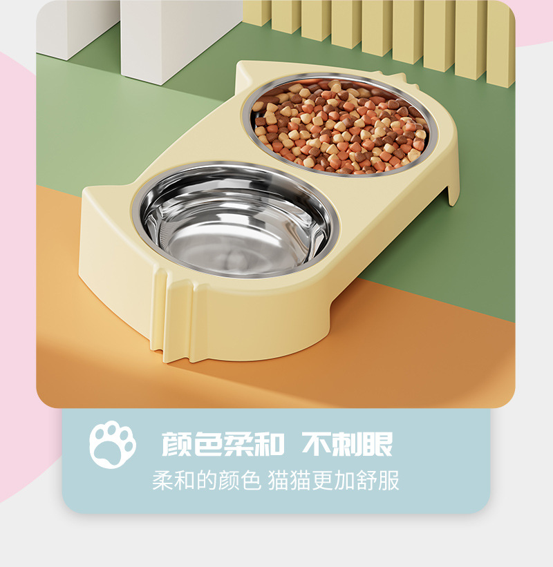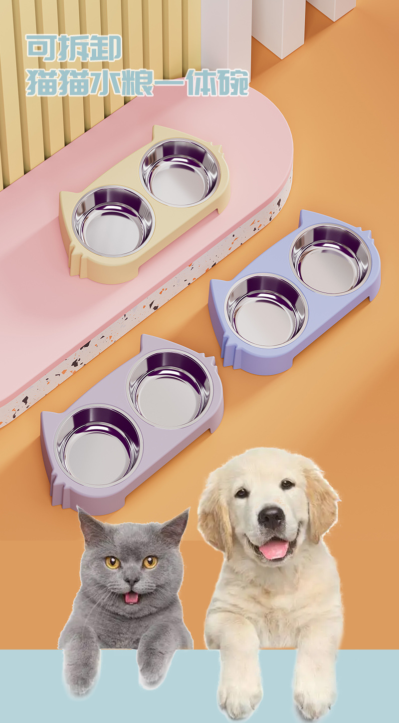 새로운 스테인리스 고양이 그릇, 이중 그릇 일체형 애완동물 그릇, 귀엽고 넘어지지 않는 2-in-1 급식 및 급수 고양이와 강아지 식기
