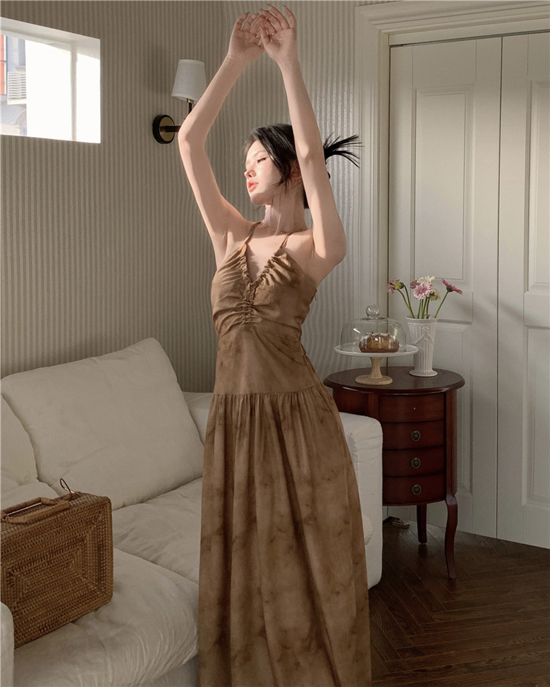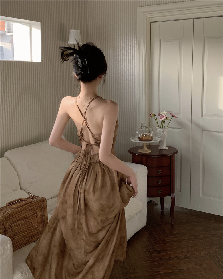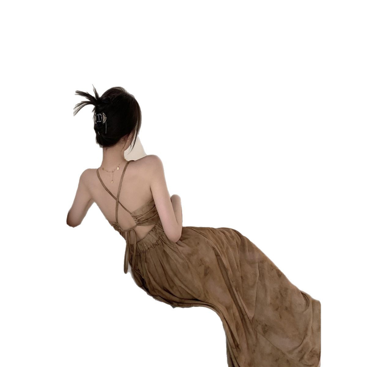2025 새로운 섹시한 백리스 칼라 서스펜더 드레스 여성 여름 허리 주름 중간 길이 스커트 핫 소녀 서스펜더 스커트