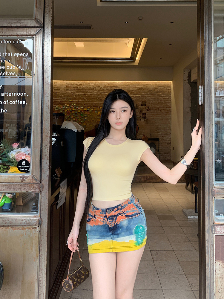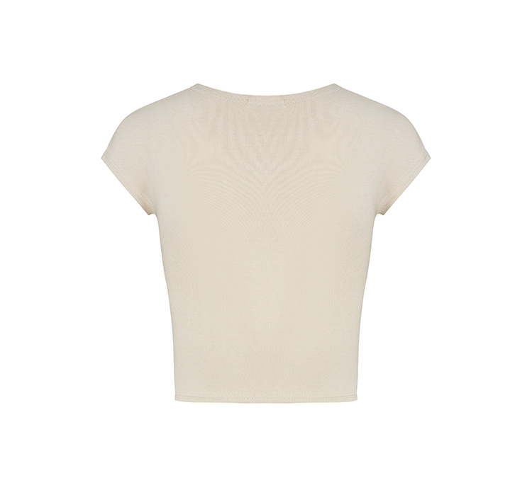 Moxi Queen 여름 몸매 보여주는 반팔 티셔츠 여성 라운드 넥 심플 바닥 솔리드 컬러 쇼트 탑 62169
