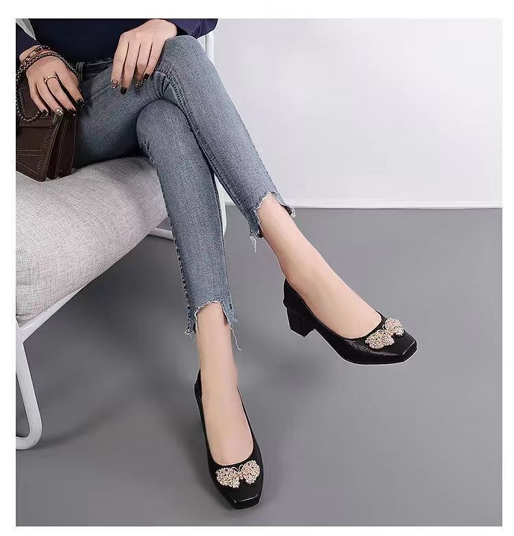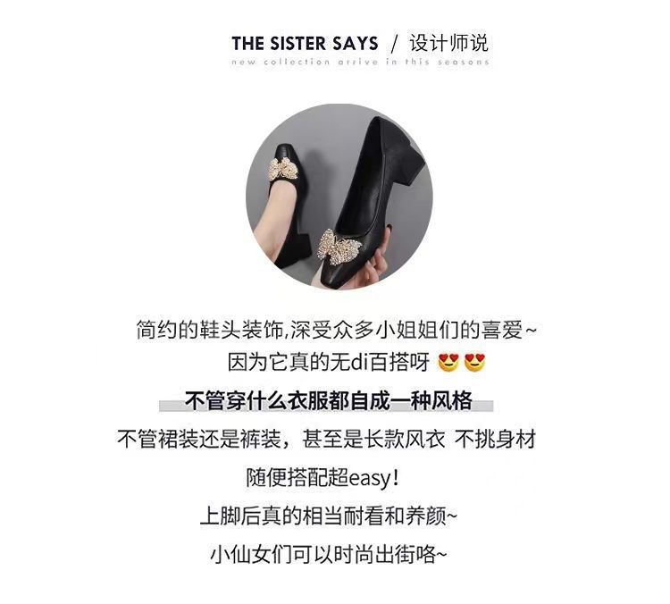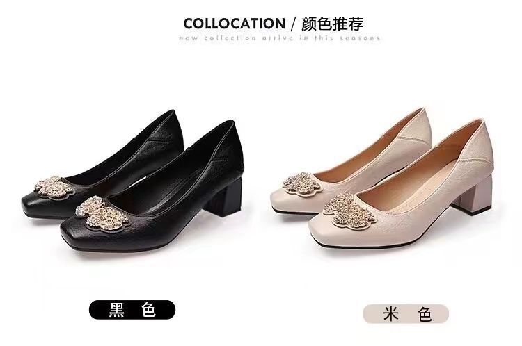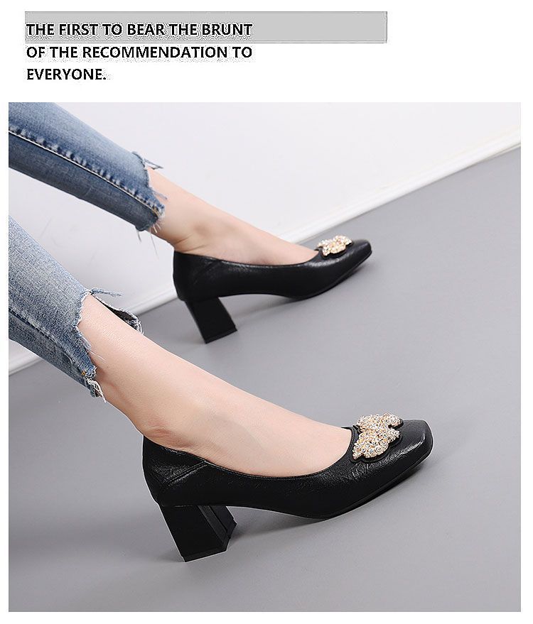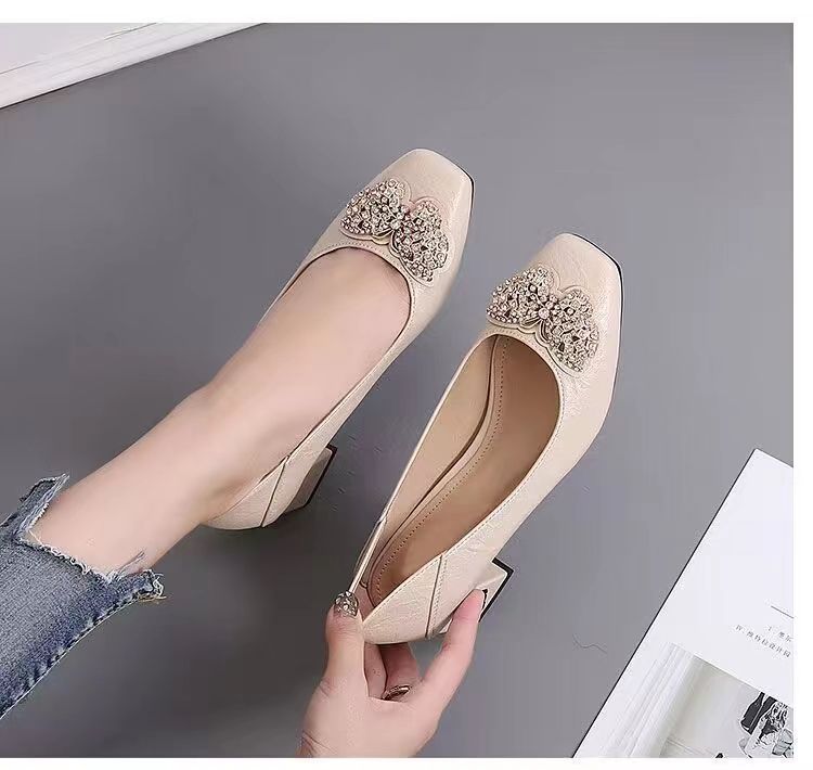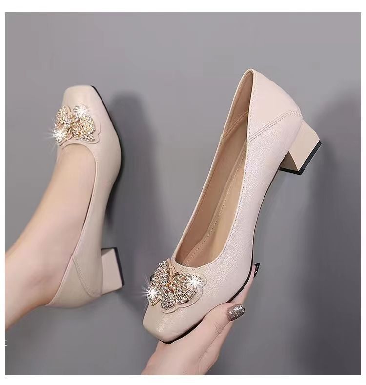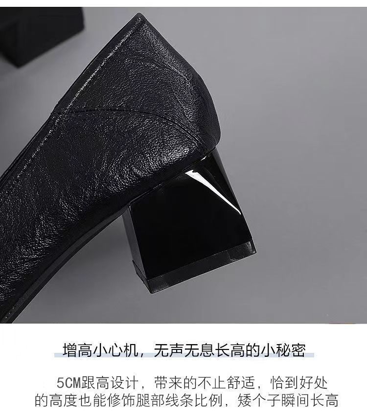 프랑스 스타일 스퀘어 발가락 신발 여성의 2025 년 봄과 가을 새로운 하이힐 여성 두꺼운 힐 얕은 입 가죽 신발 긴 작업 신발