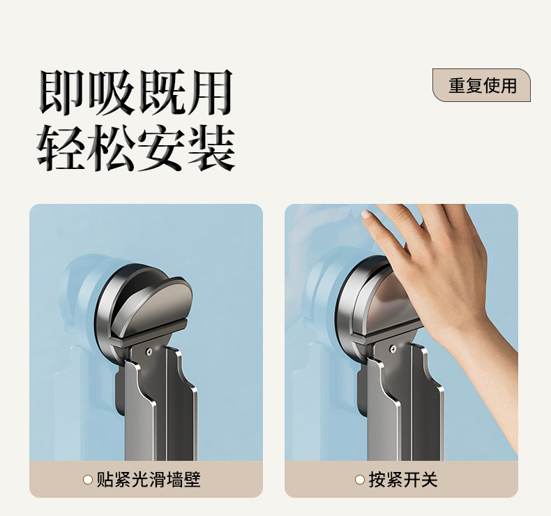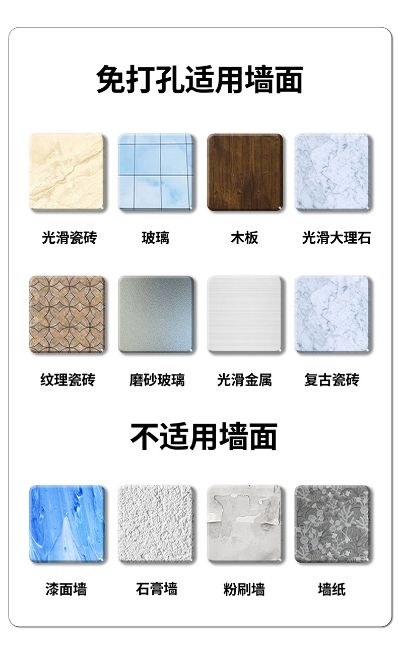 (2)安装请注意,墙面需是平整坚固光滑的玻璃瓷砖等。不可用在粉刷墙,墙纸,石灰墙等不平整不坚固的墙面上。