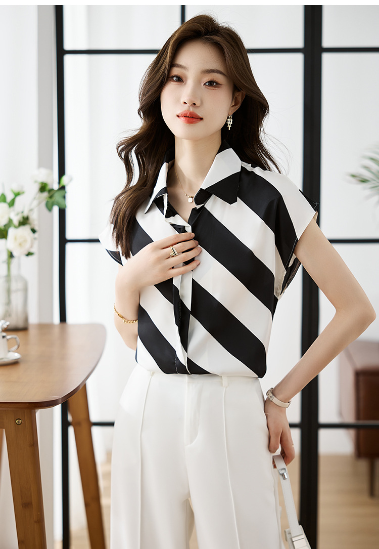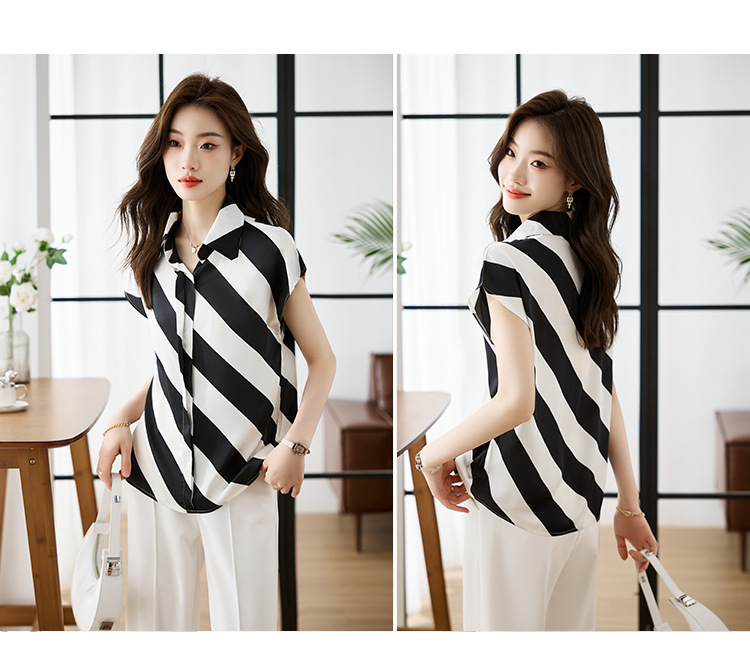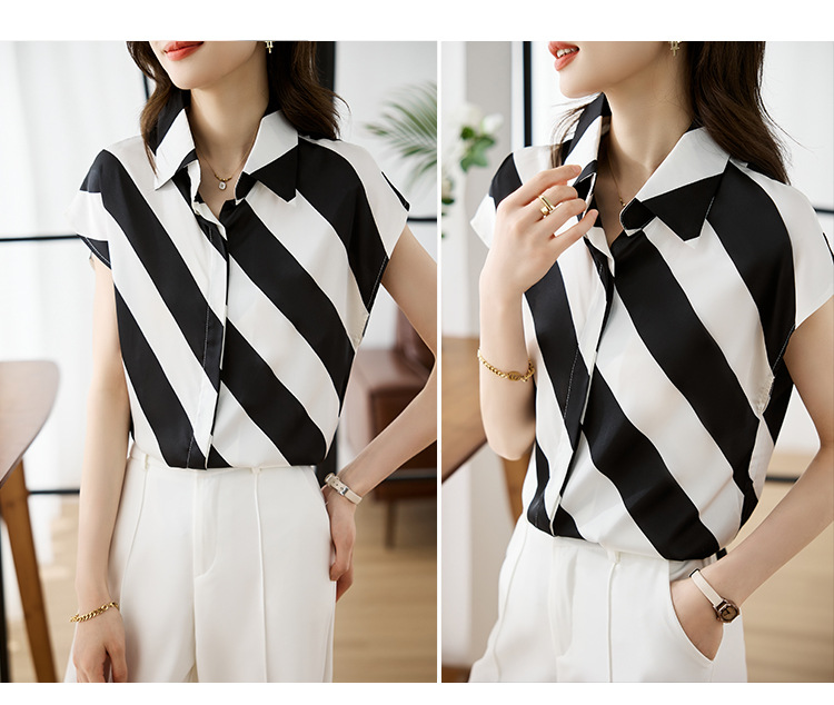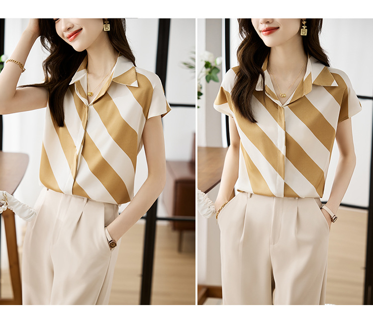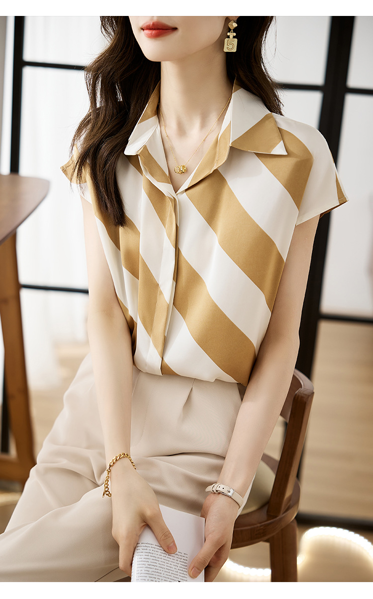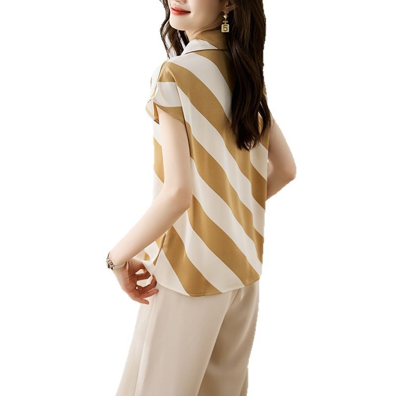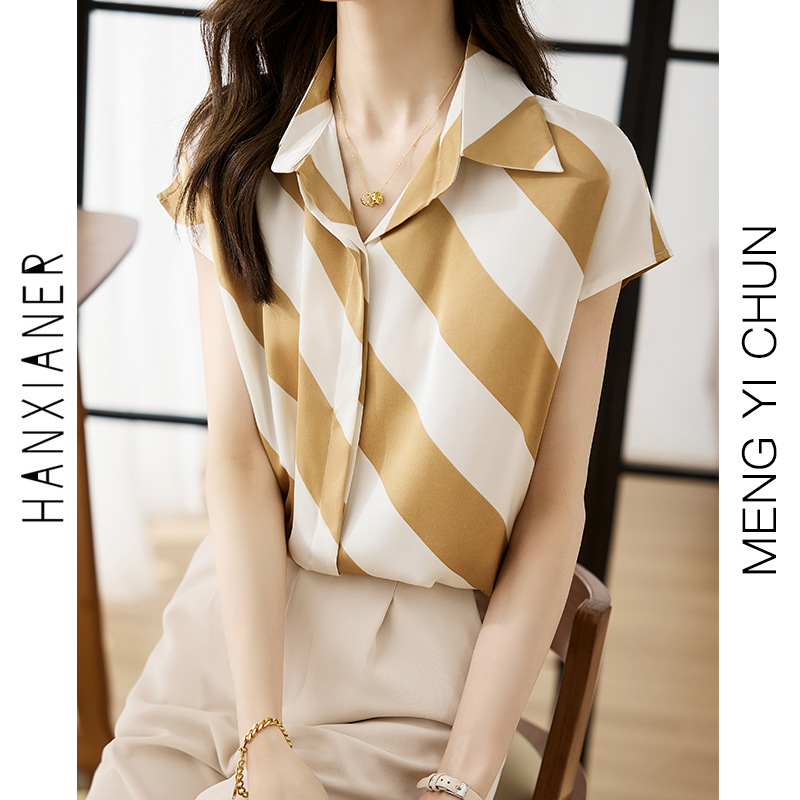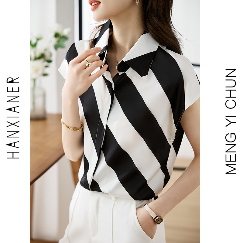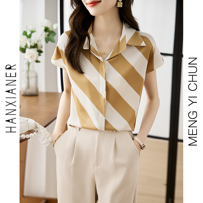 옷깃 반팔 스트라이프 쉬폰 탑 여성 2025 년 여름 새로운 패션 캐주얼 카디건 셔츠베이스 셔츠 조수