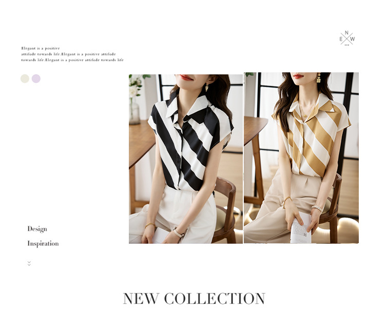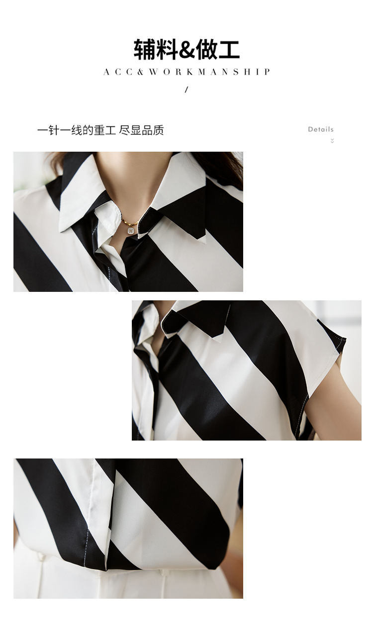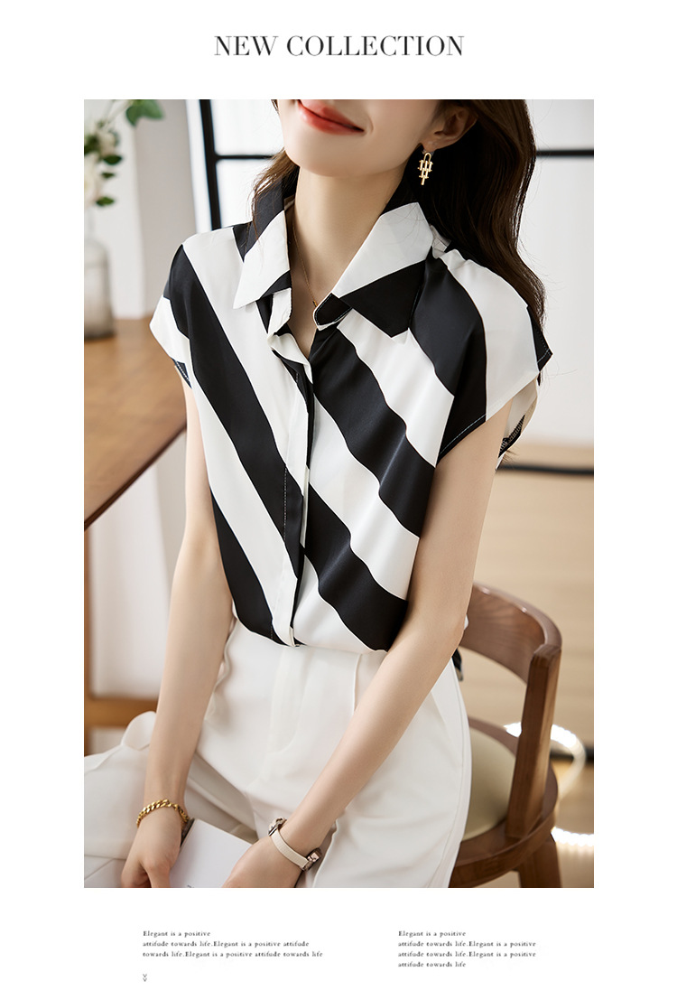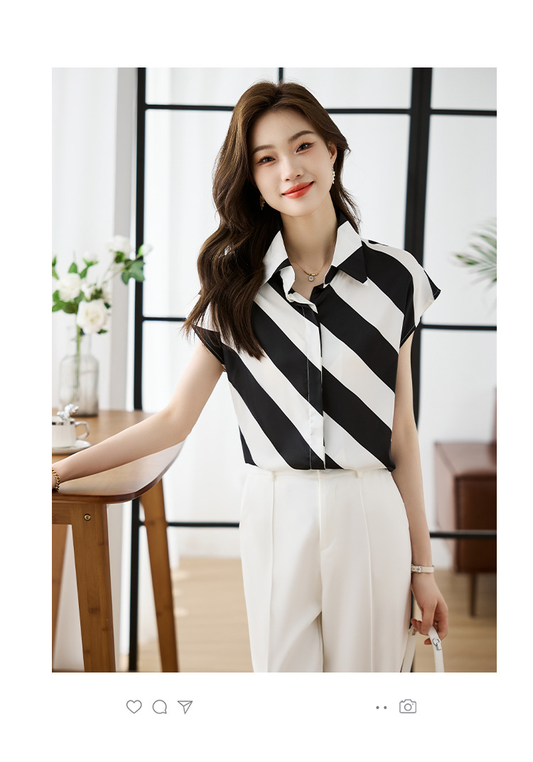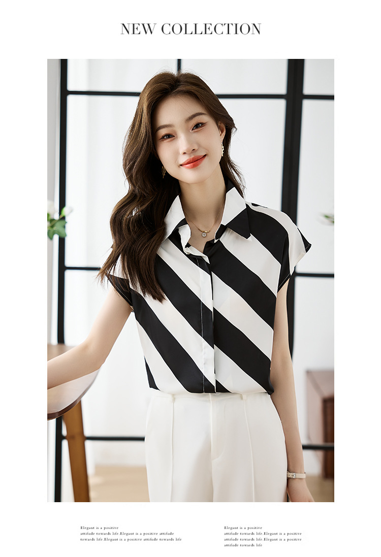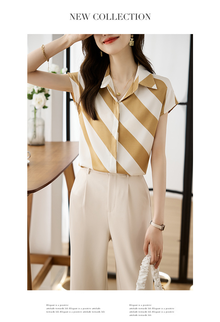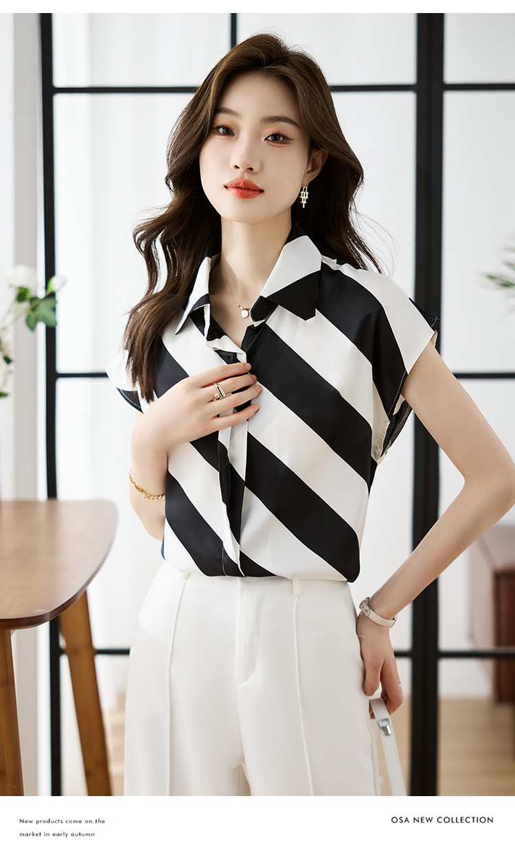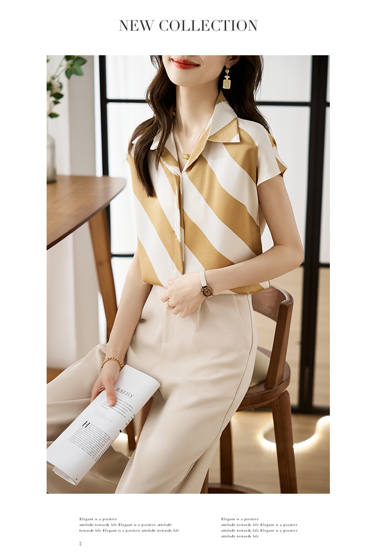옷깃 반팔 스트라이프 쉬폰 탑 여성 2025 년 여름 새로운 패션 캐주얼 카디건 셔츠베이스 셔츠 조수