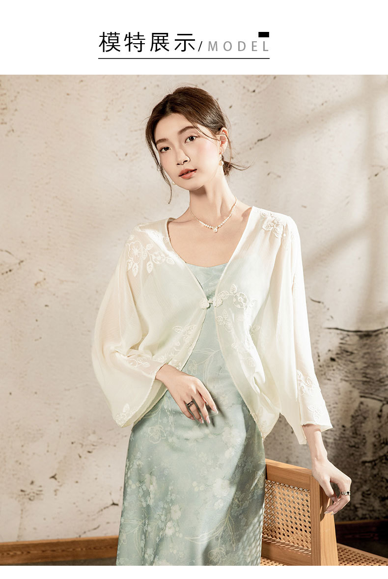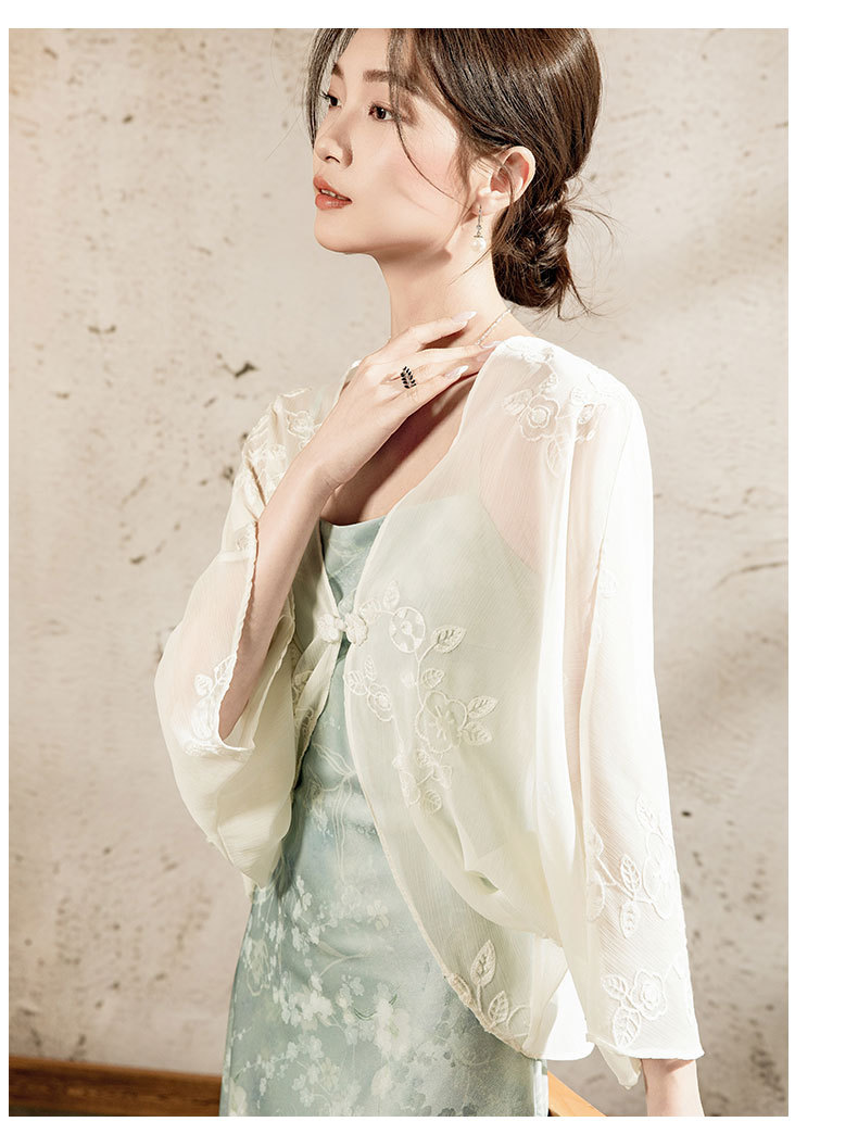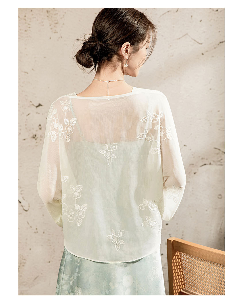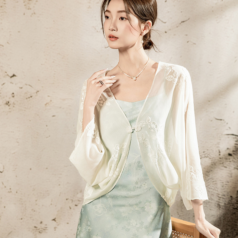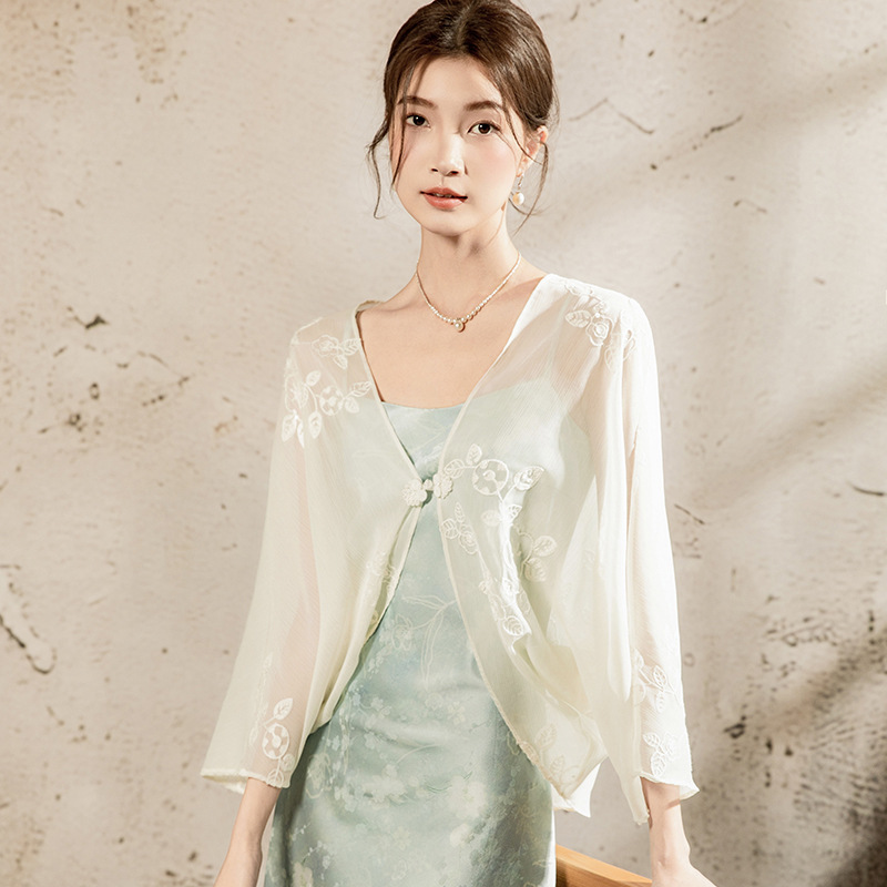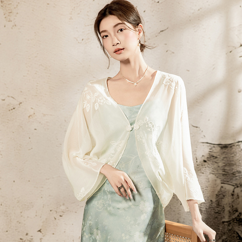 중국 스타일 v 넥 버튼 카디건 배트 슬리브 루즈 2025 봄 여름 자외선 차단 여성 9부 소매 자수 쉬폰 셔츠