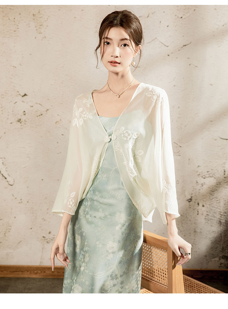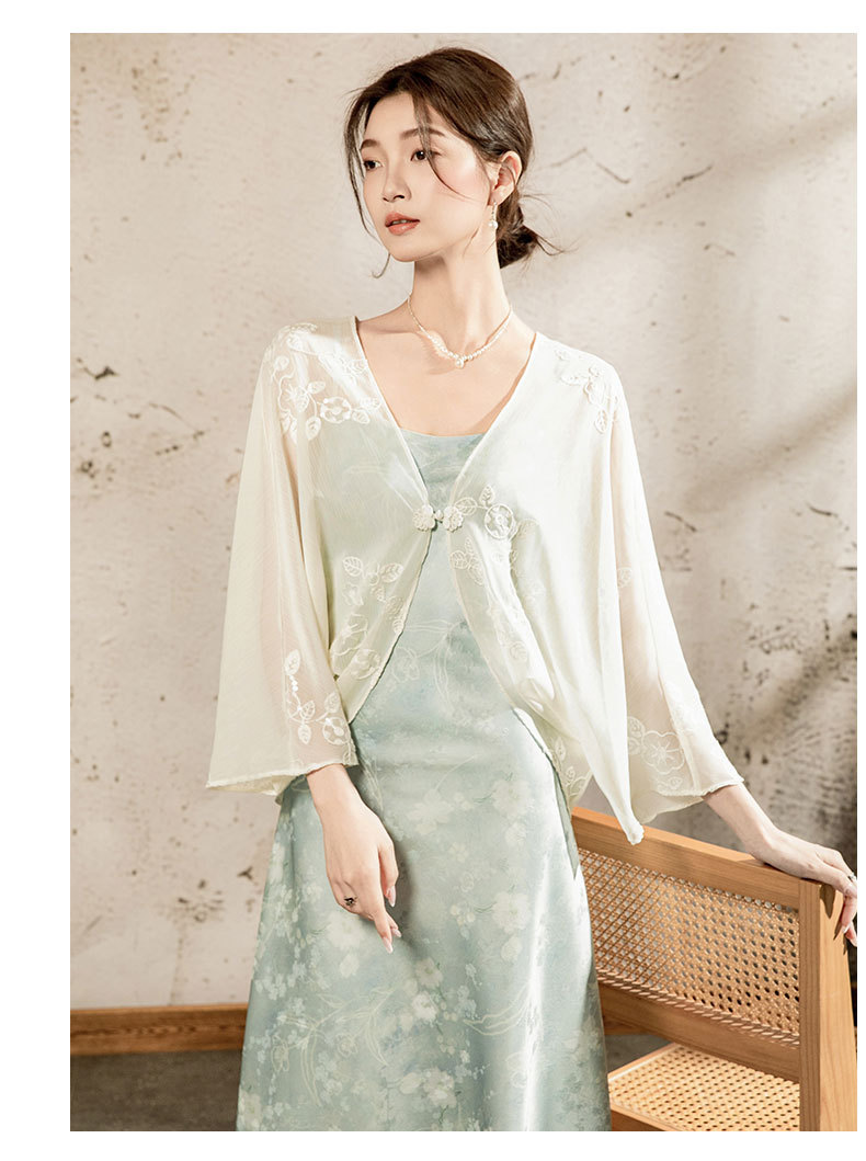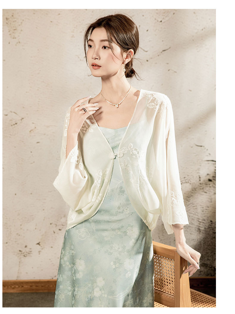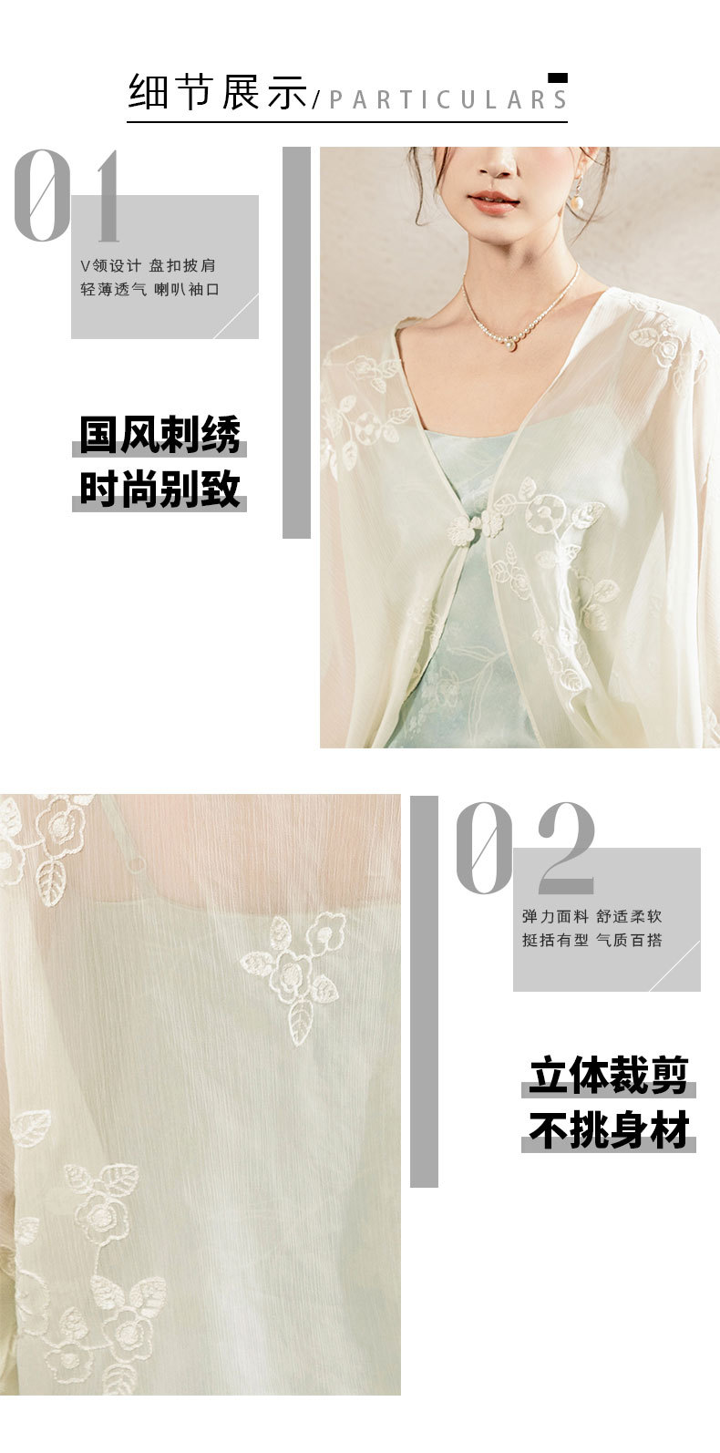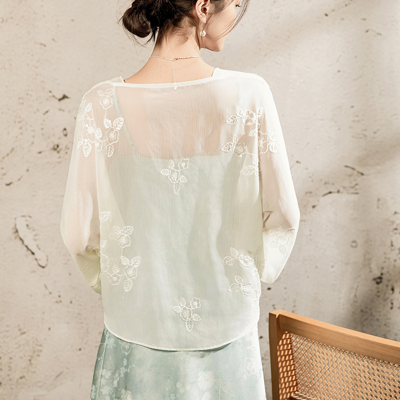 중국 스타일 v 넥 버튼 카디건 배트 슬리브 루즈 2025 봄 여름 자외선 차단 여성 9부 소매 자수 쉬폰 셔츠