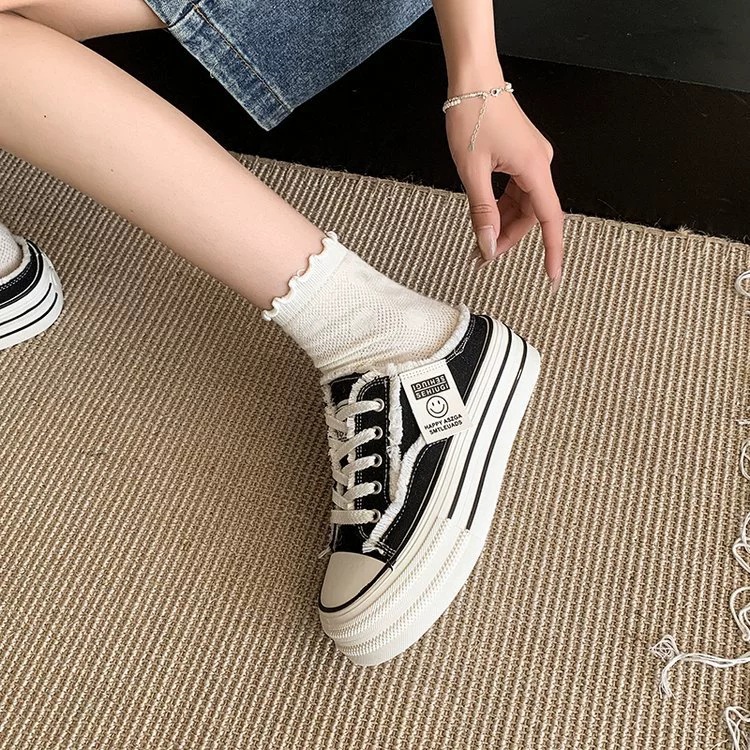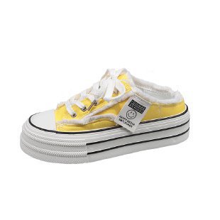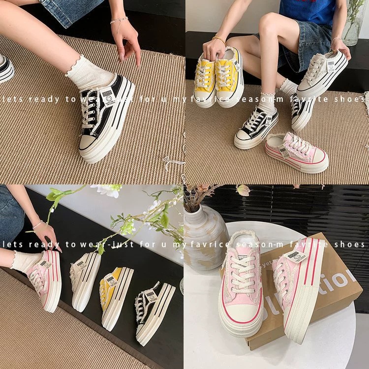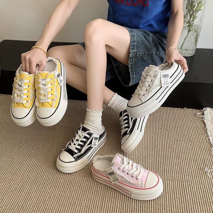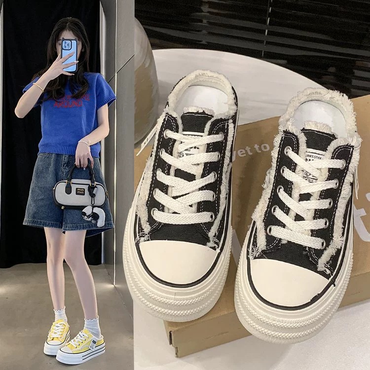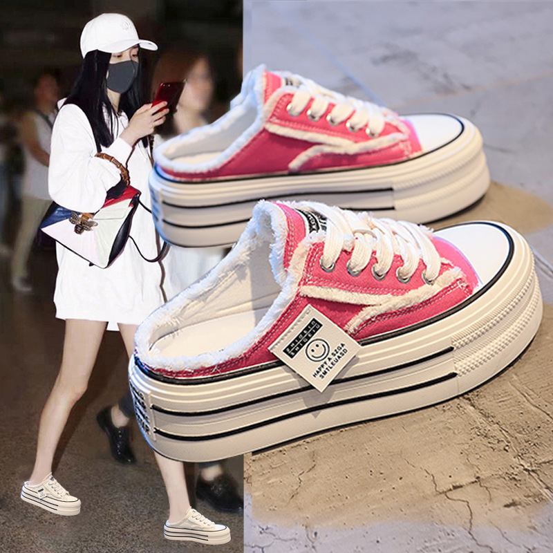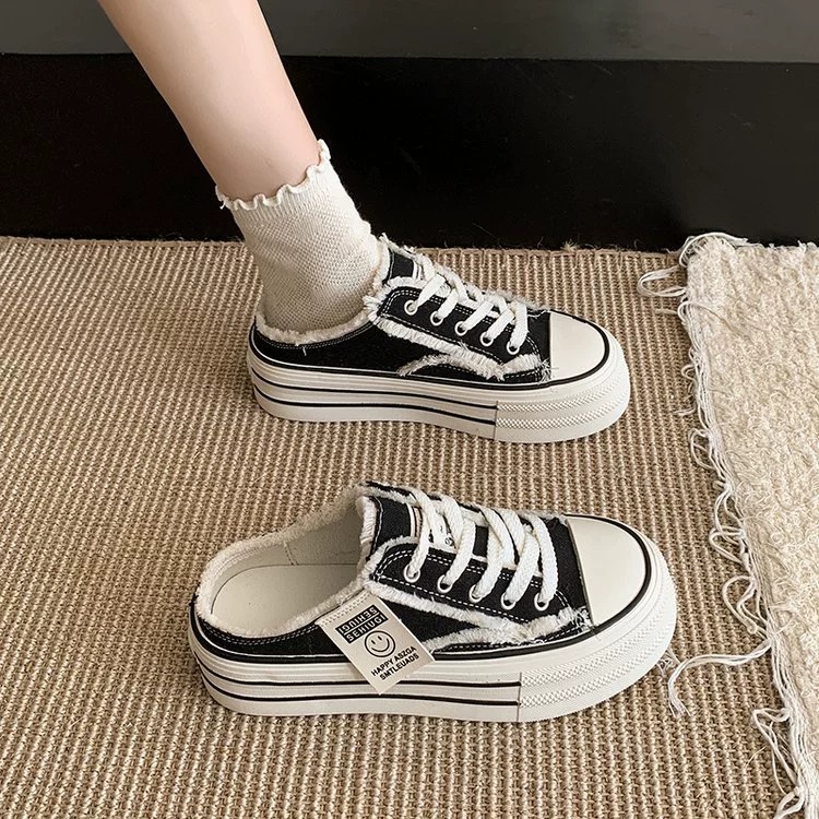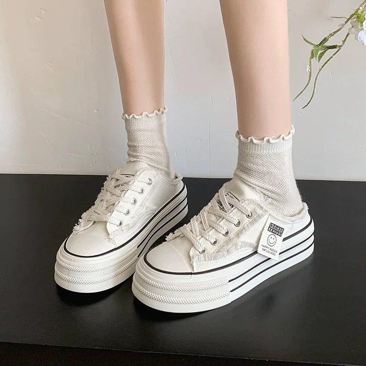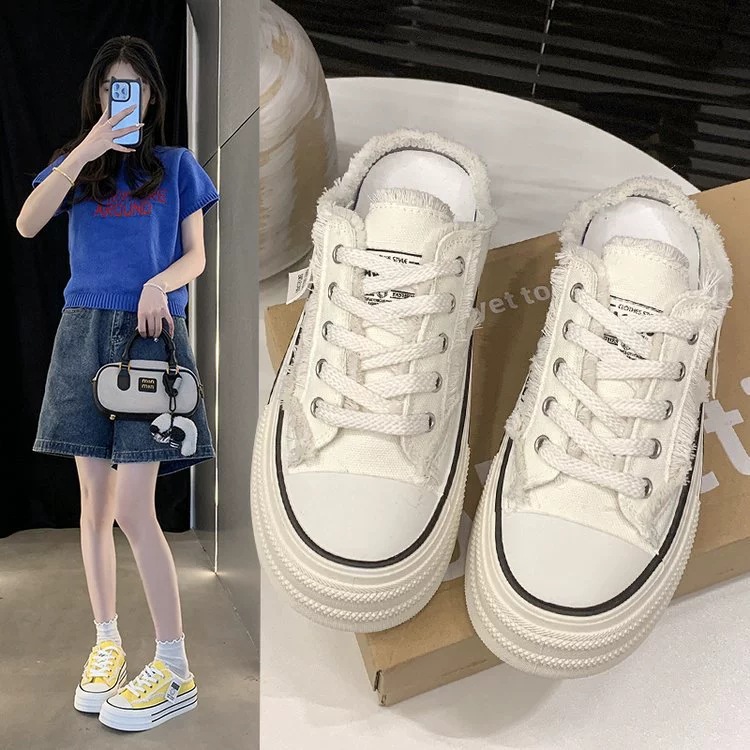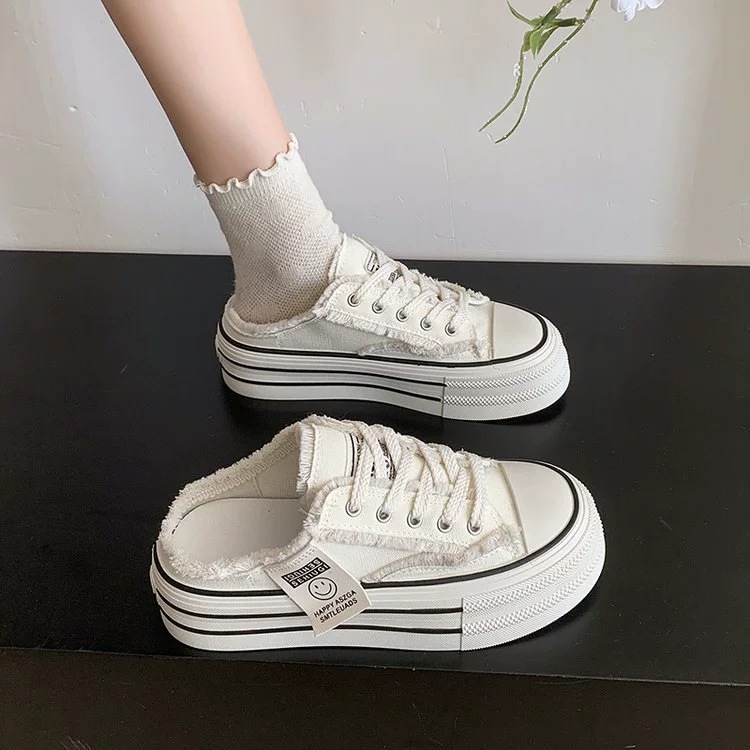 캔버스 Baotou 하프 슬리퍼 여성의 2025 봄 새로운 두꺼운 유일한 외부 착용 게으른 뒤꿈치 내부 높이 흰색 신발