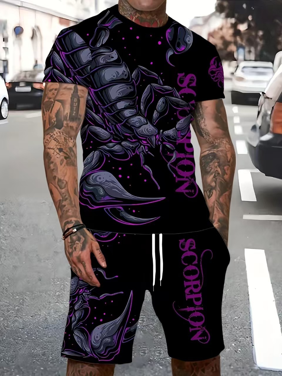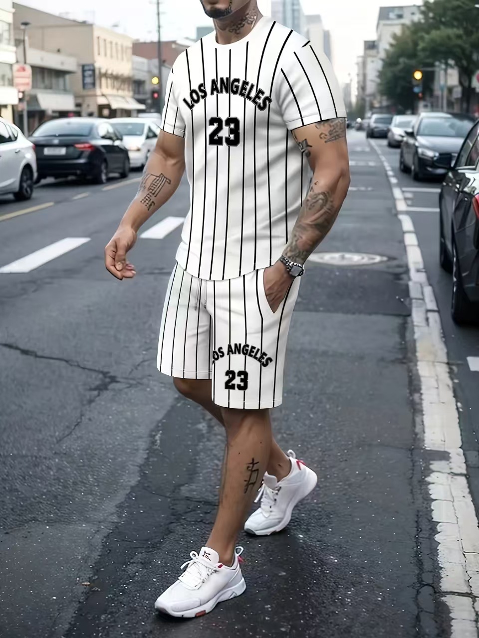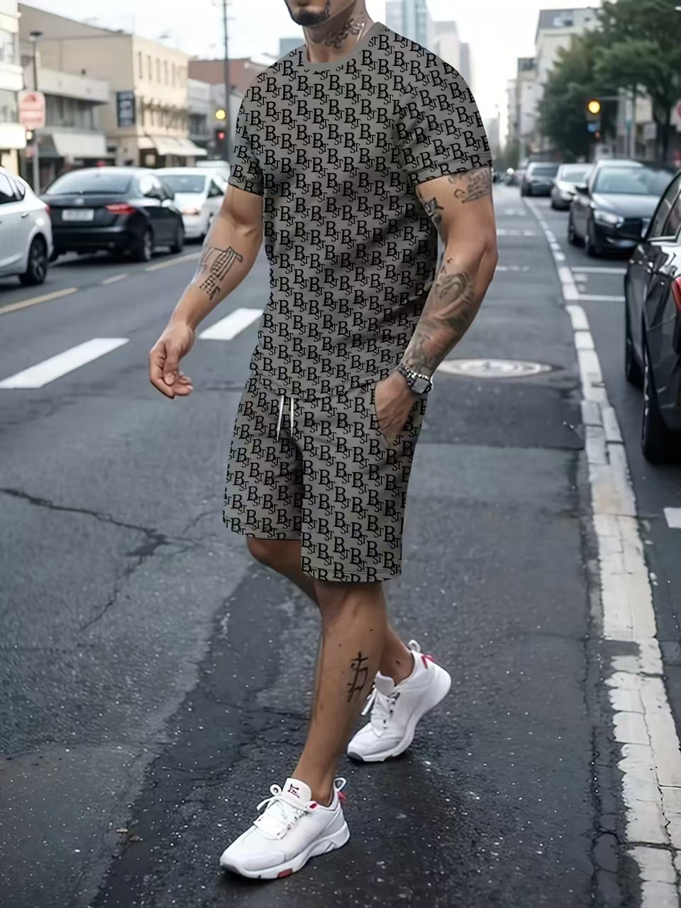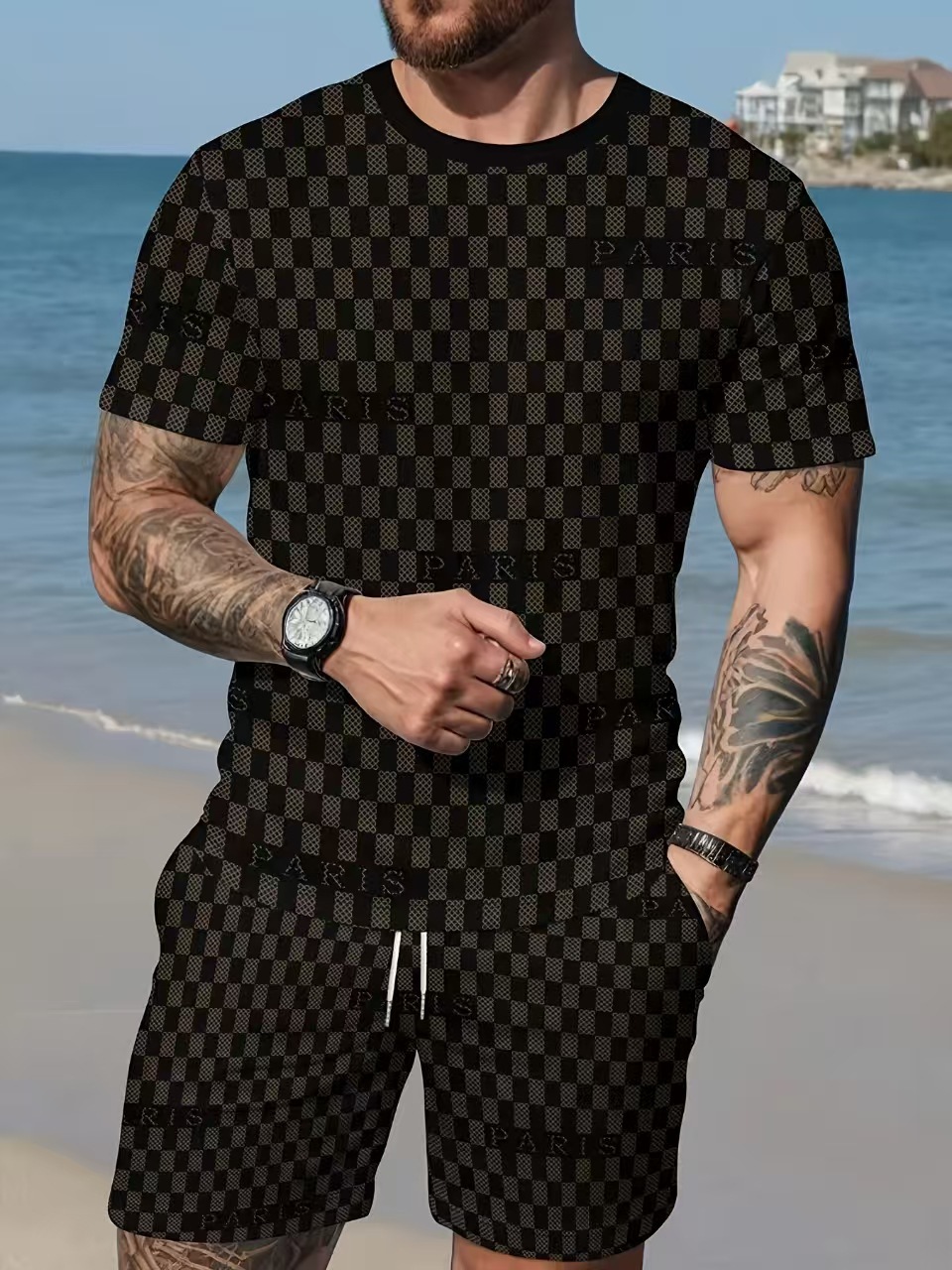 국경 간 뉴 남성 여름 트렌디 한 하와이 비치 흑백 스트리트 캐주얼 스포츠 반팔 세트