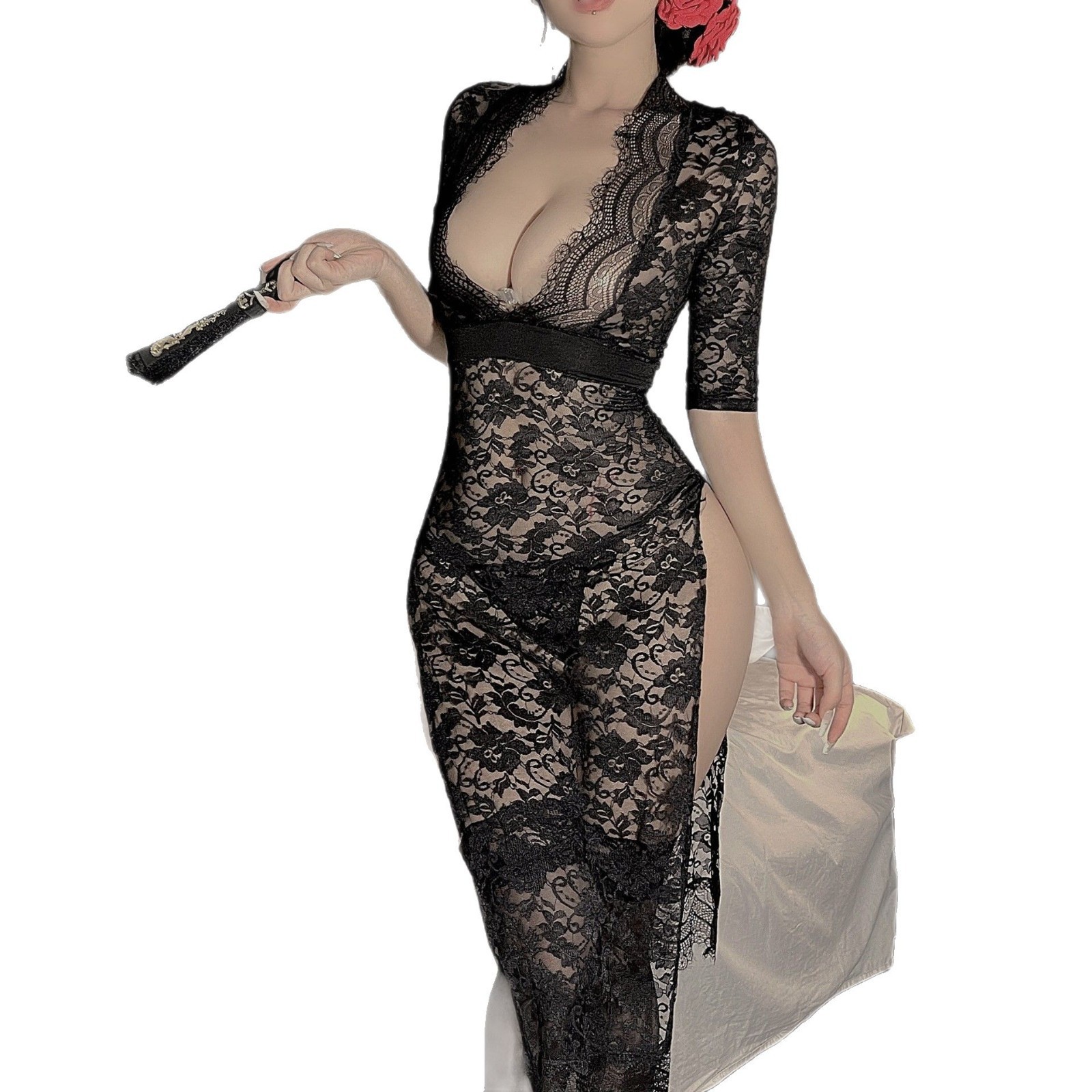 Night Oath Ti Fei 플러스 사이즈 섹시한 란제리 섹시한 레이스 유혹 롱 스커트 뜨거운 사이드 슬릿 슬림 유니폼 잠옷 여성용