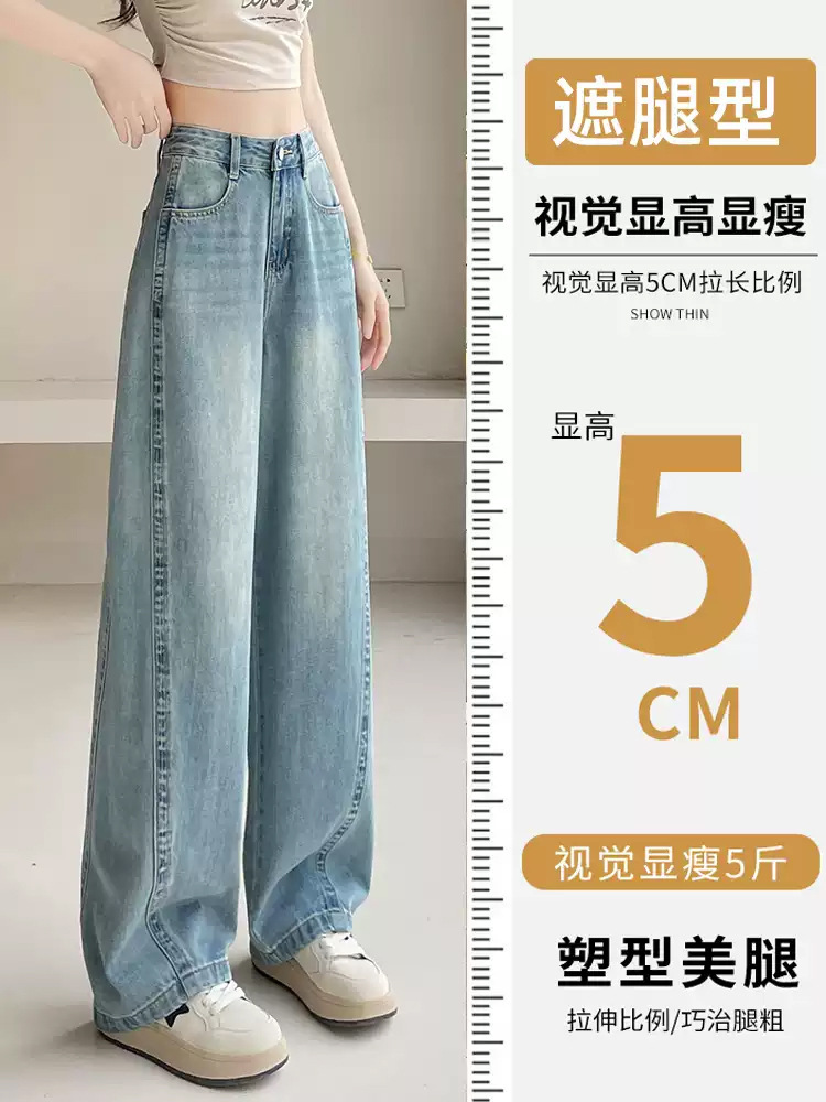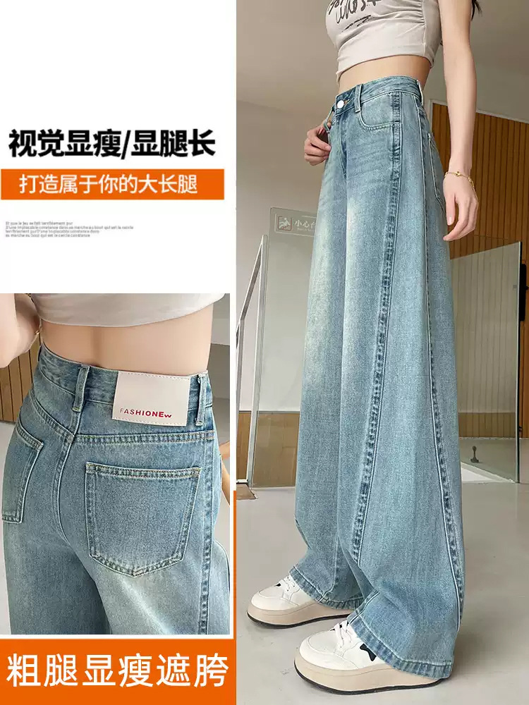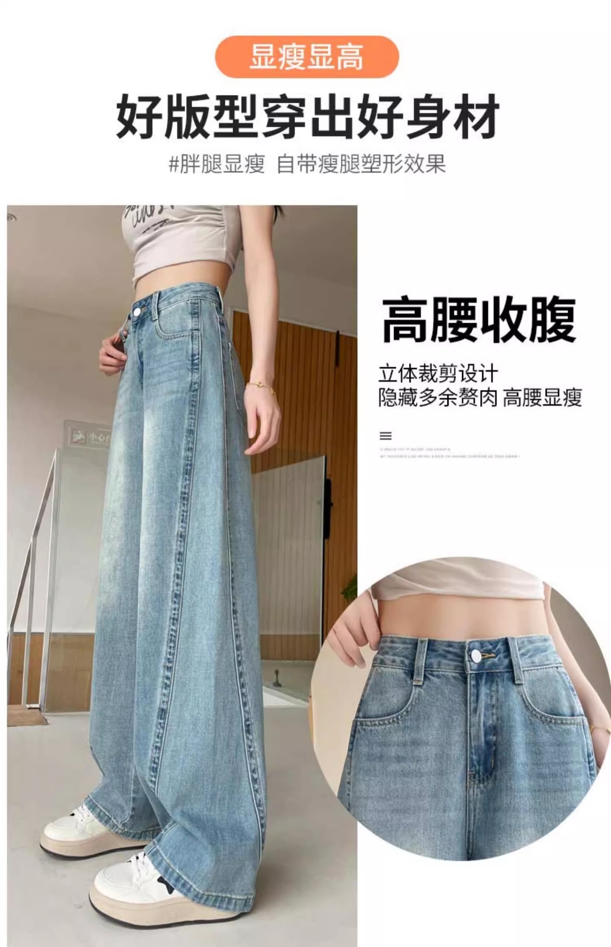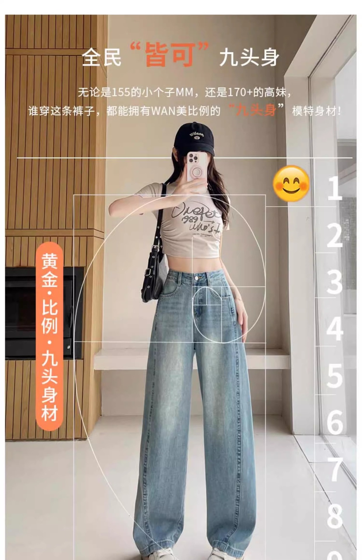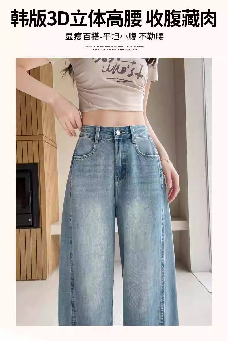 데님 Scimitar 넓은 다리 바지 여성 수정 다리 배 모양의 봄 작은 여성을위한 약간 통통한 높은 허리 느슨한 바지
