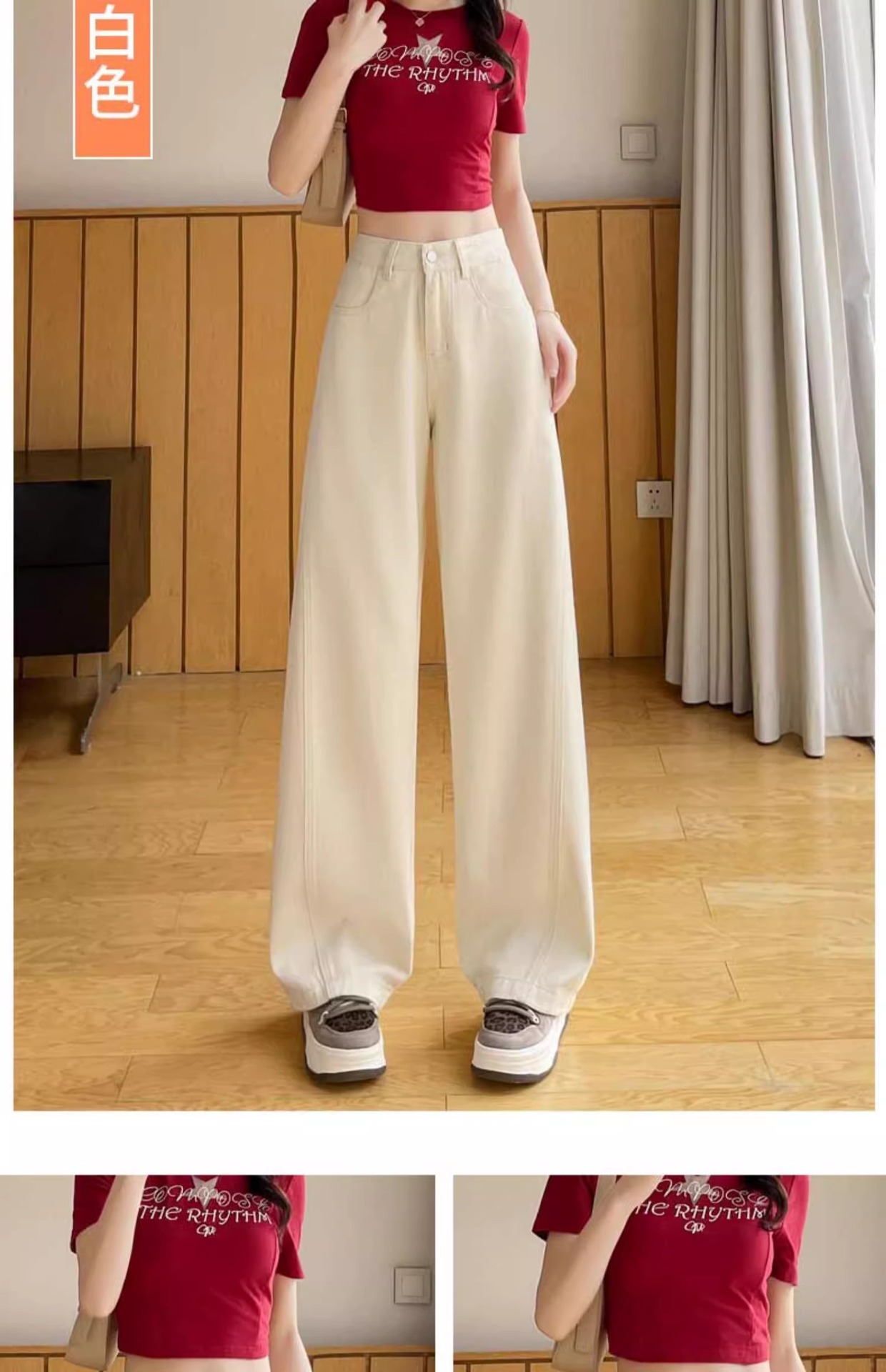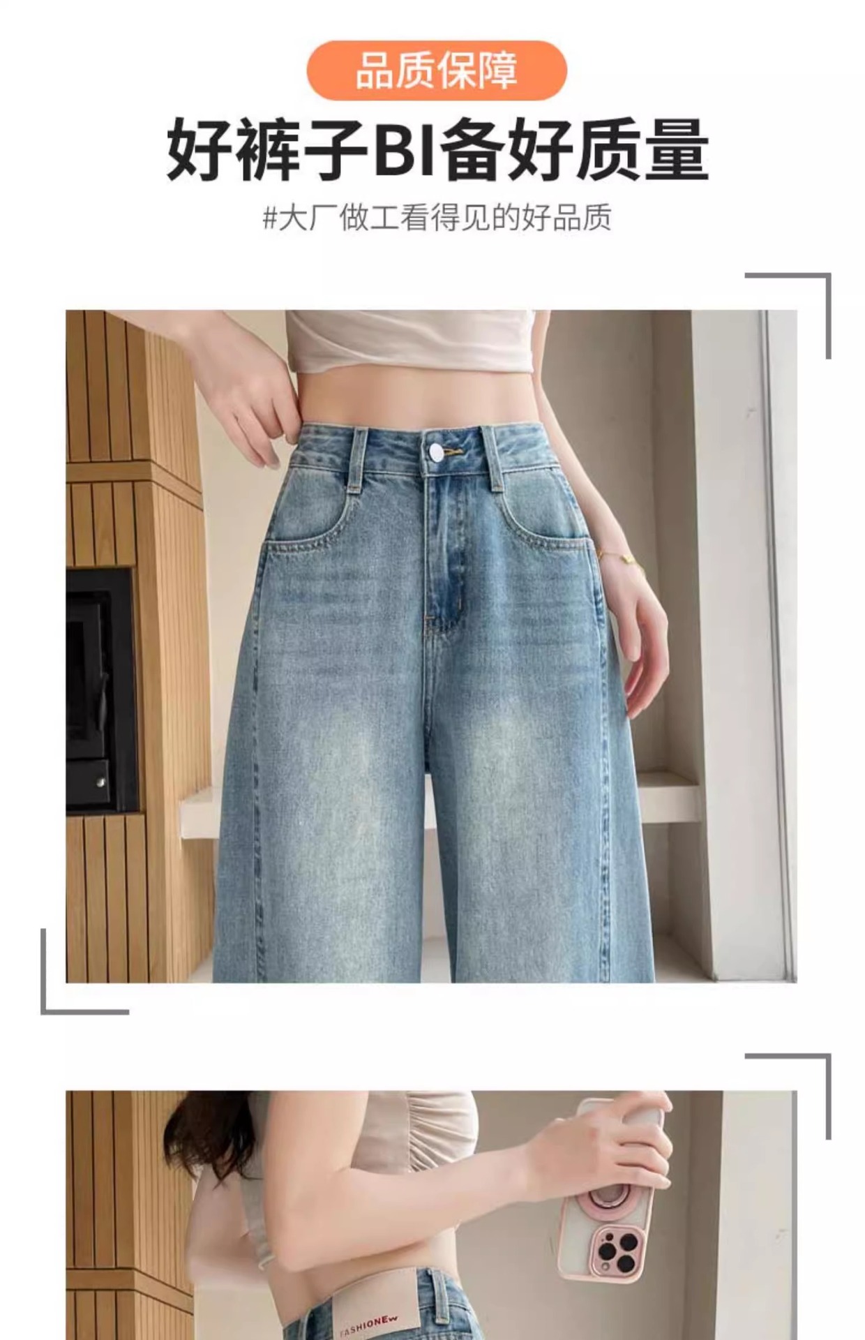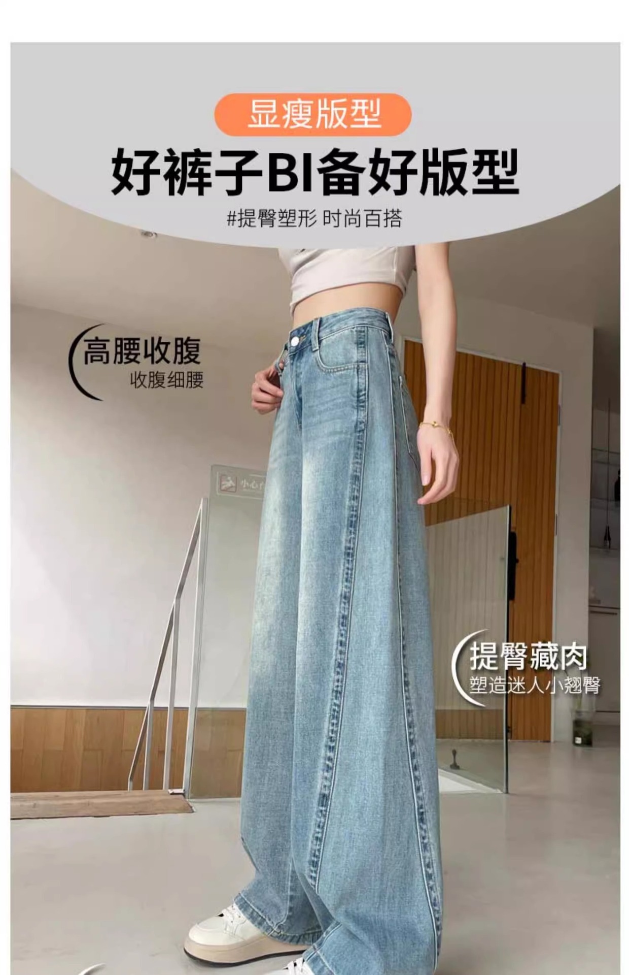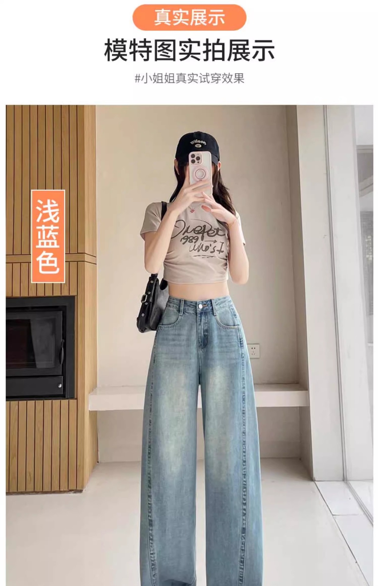 데님 Scimitar 넓은 다리 바지 여성 수정 다리 배 모양의 봄 작은 여성을위한 약간 통통한 높은 허리 느슨한 바지