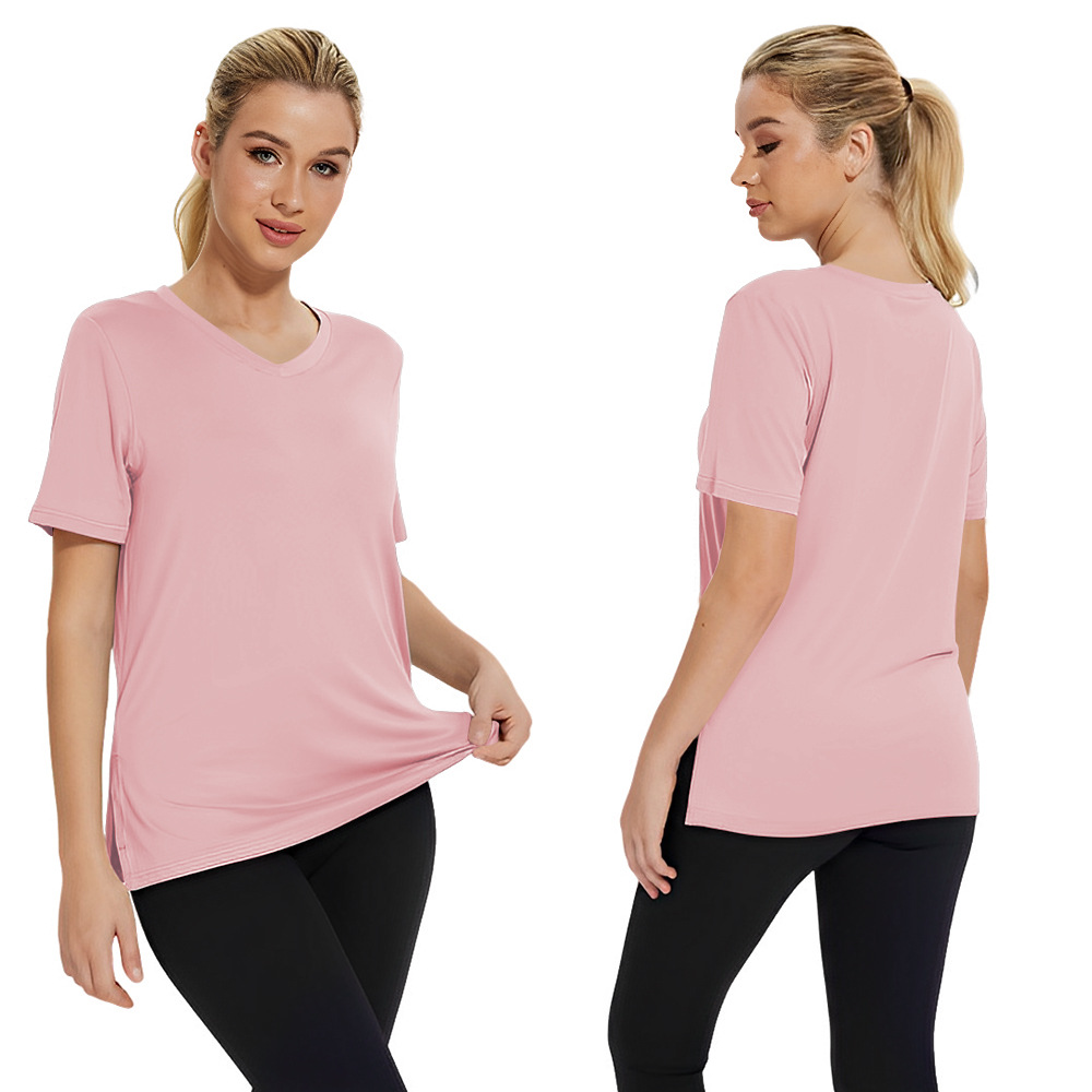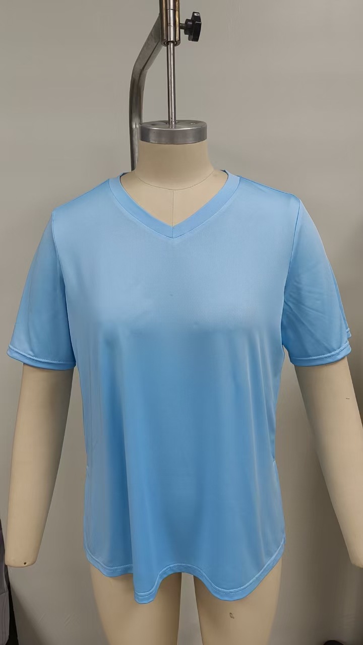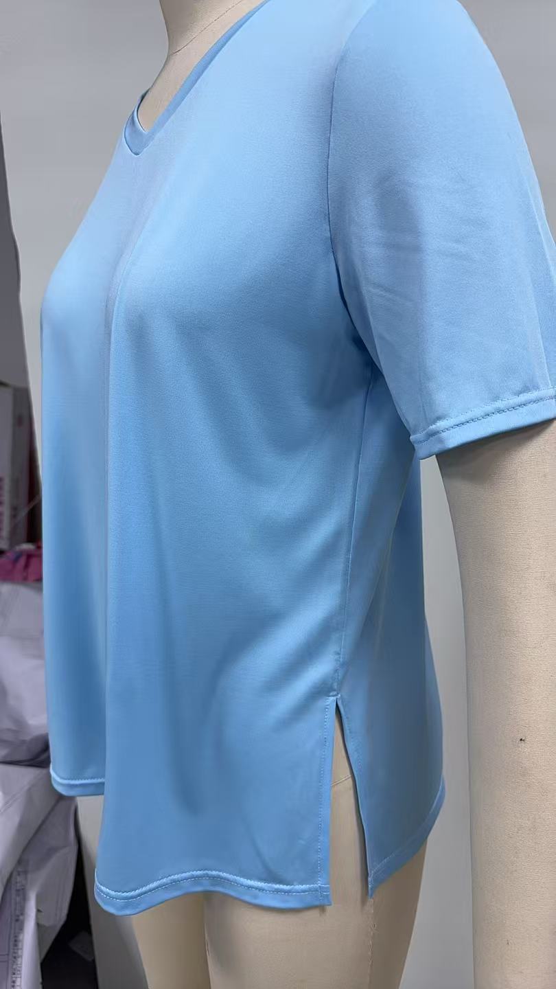 봄과 여름 2025 새로운 아마존 유럽과 미국 국경 간단한 패션 V 넥 단색 올 매치 티셔츠 느슨한 분할 여성 의류