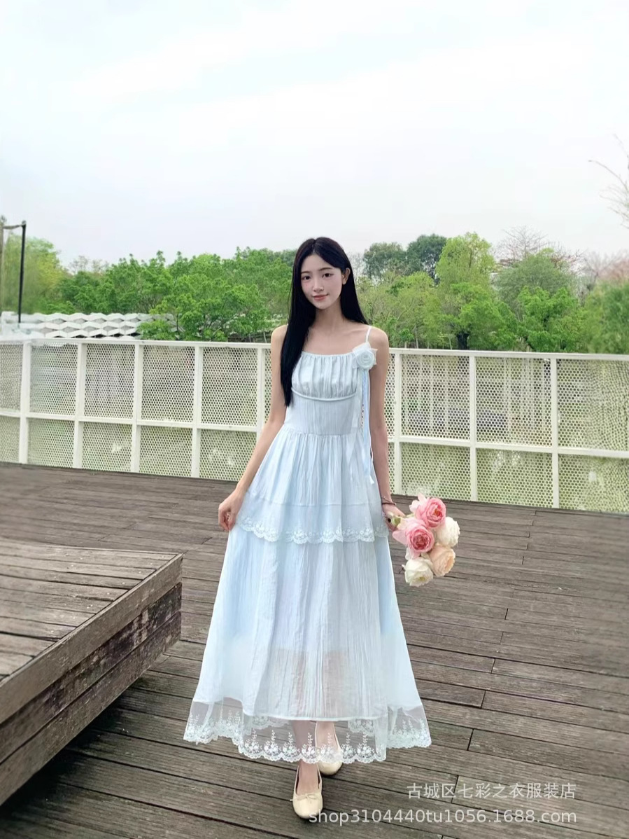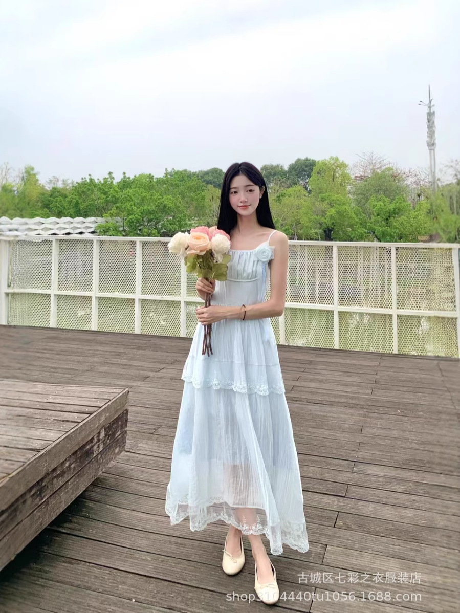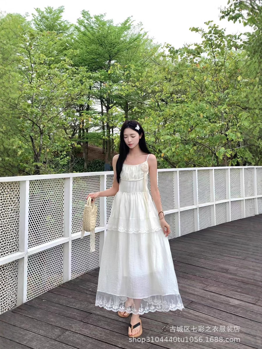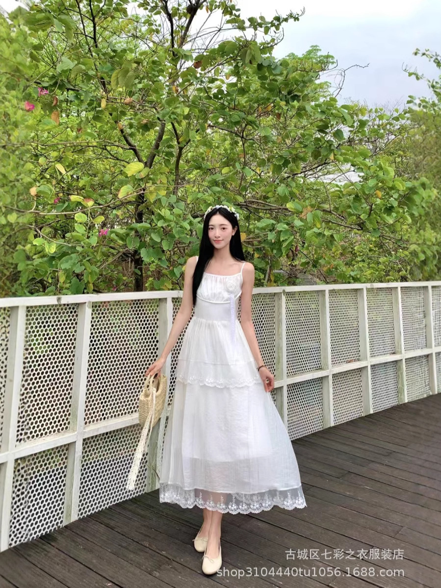 흰색 타이 다이 재고 슈퍼 페어리 해변 휴일 원피스 해변 중간 길이 원피스 분위기 사진 여신복 원피스