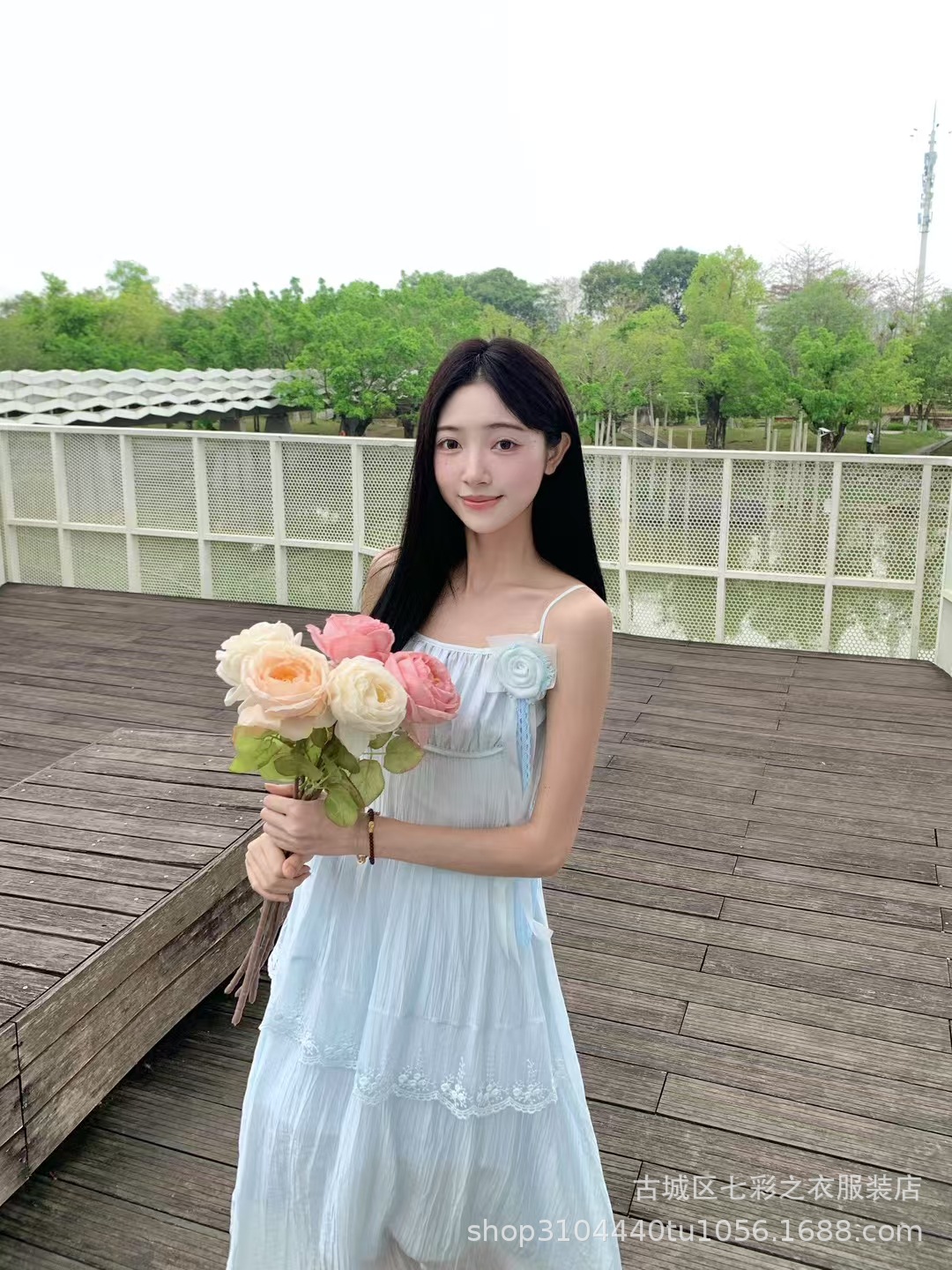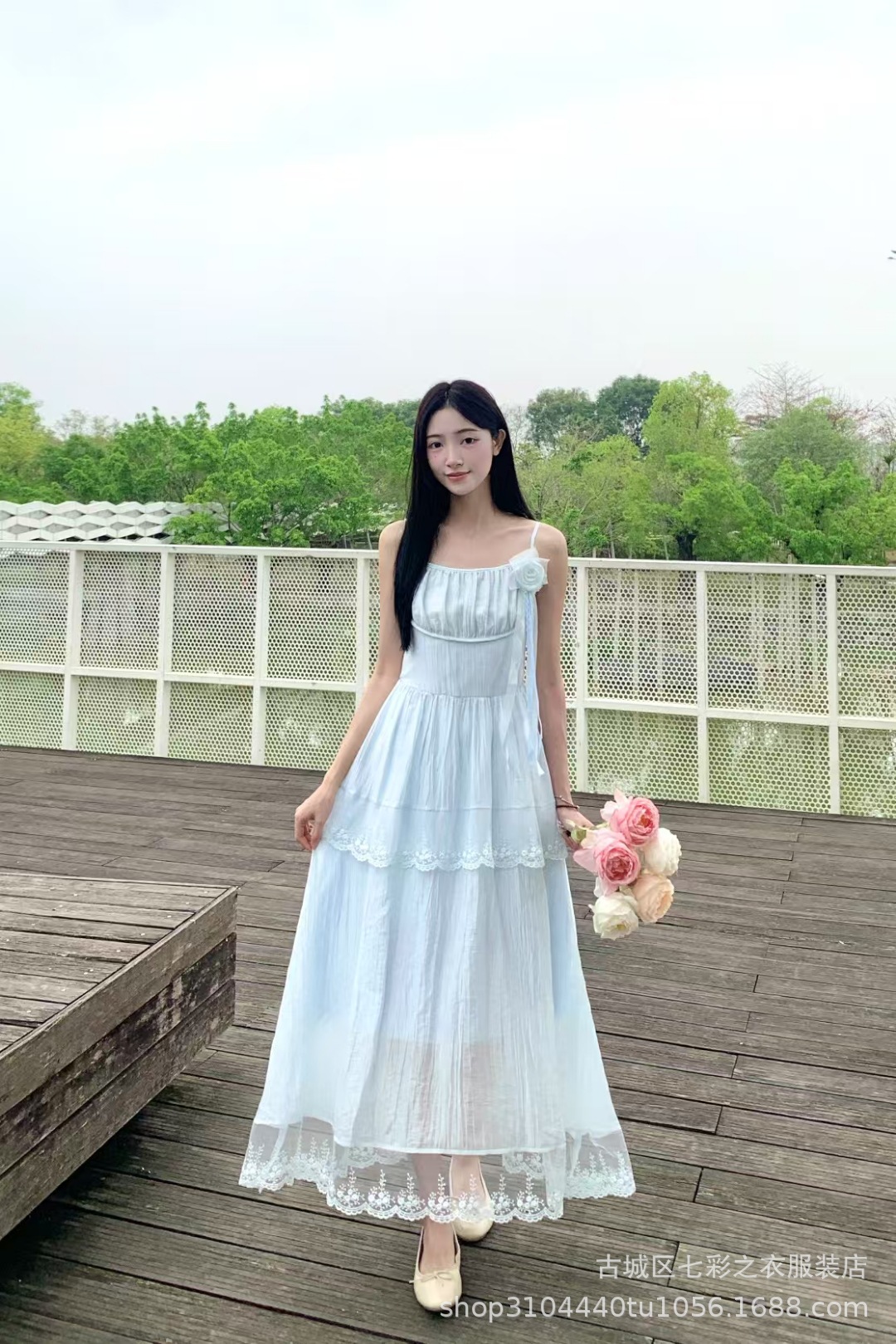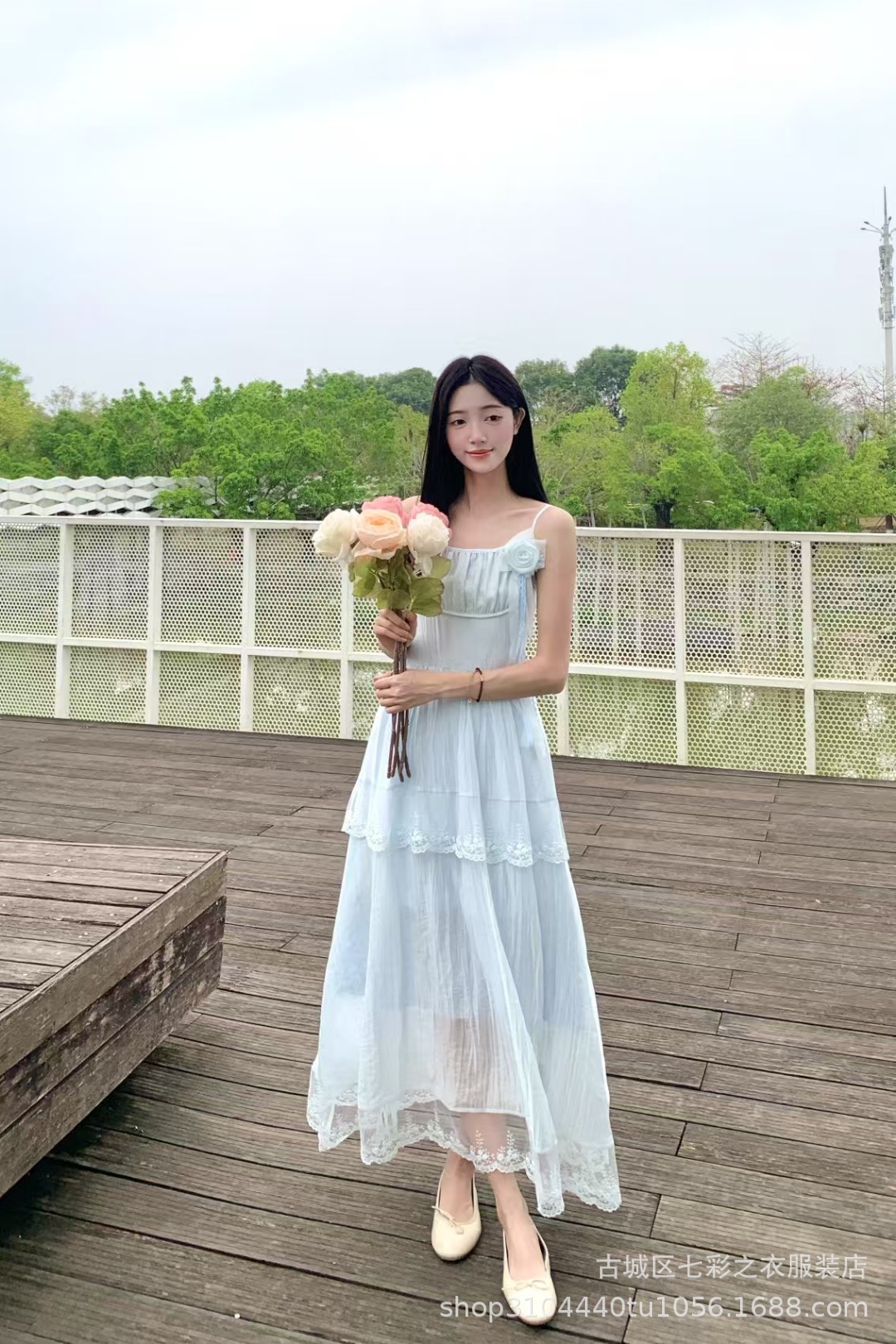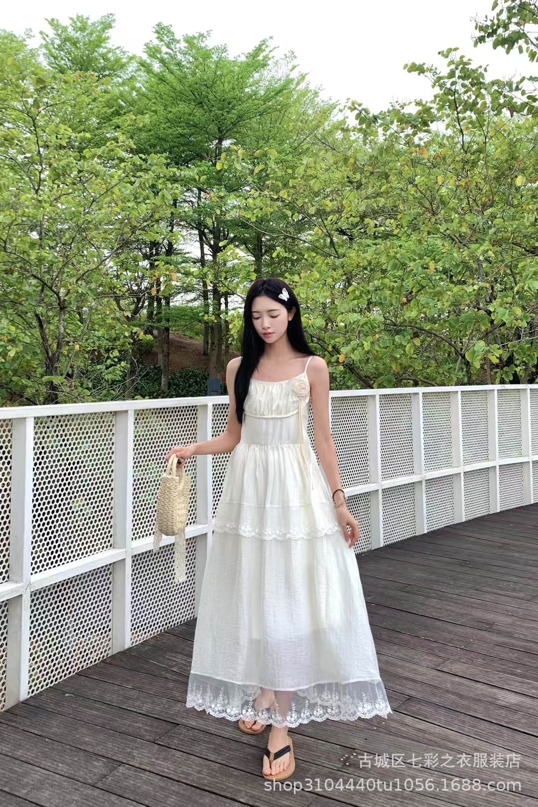 흰색 타이 다이 재고 슈퍼 페어리 해변 휴일 원피스 해변 중간 길이 원피스 분위기 사진 여신복 원피스