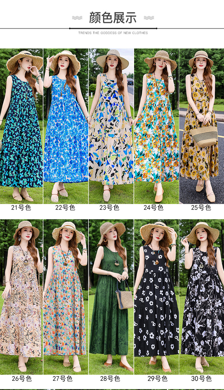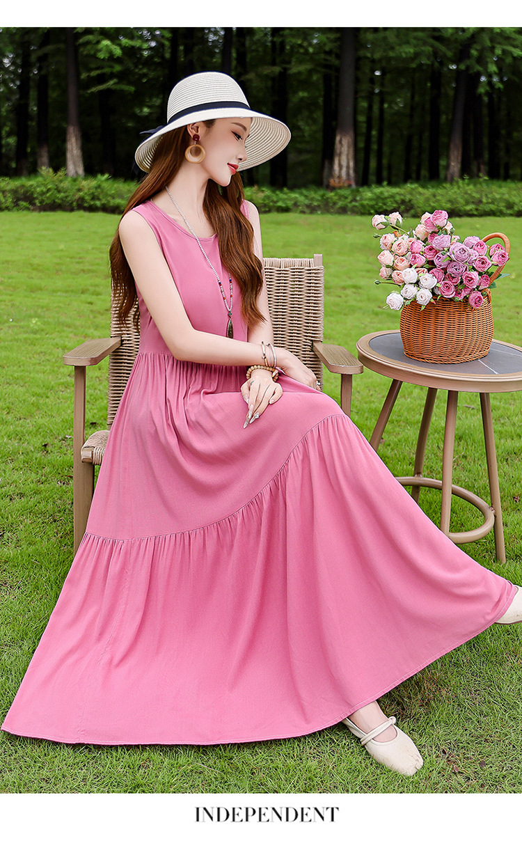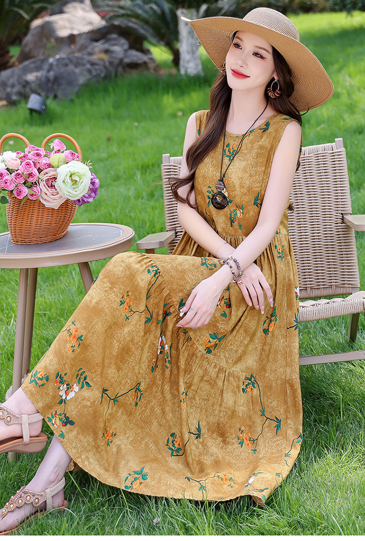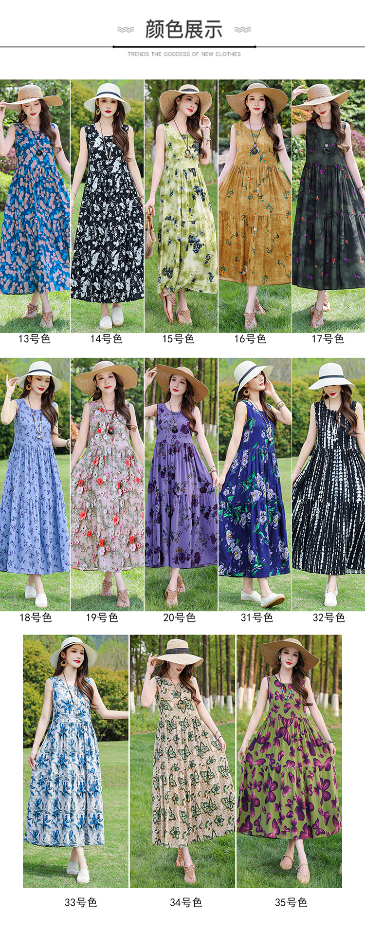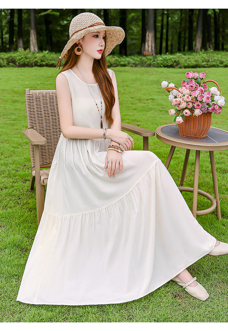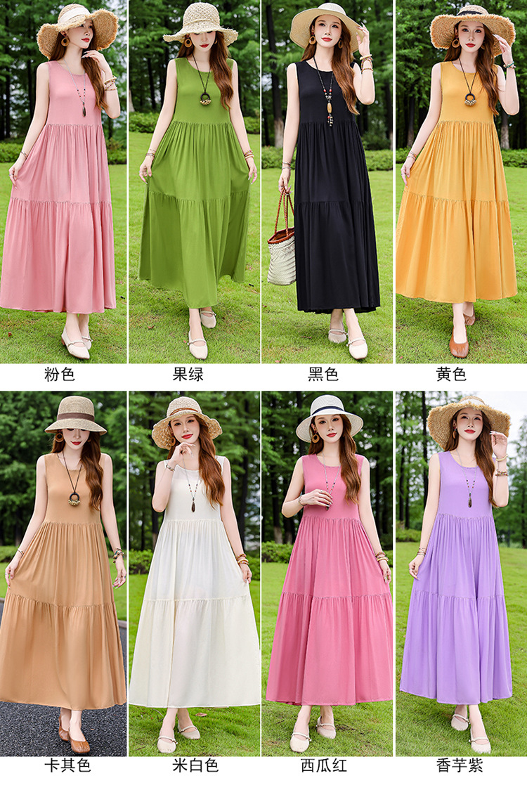 여름 면 실크 드레스 새로운 겉옷 젊은 스타일 서스펜더 비치 스커트 여성 민소매 휴가 스커트 우아한 롱 스커트