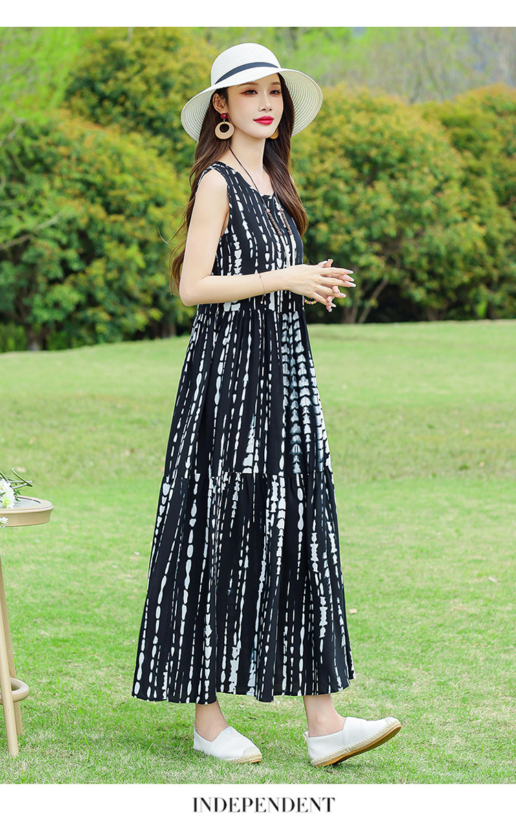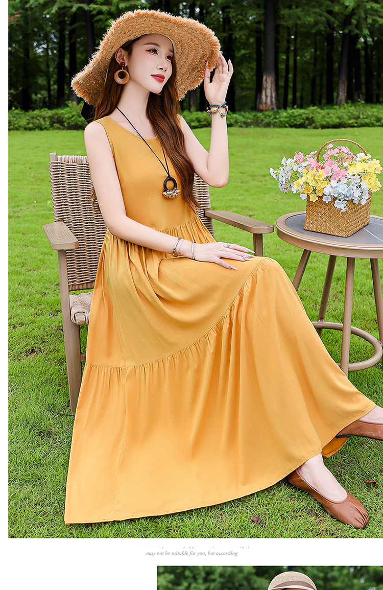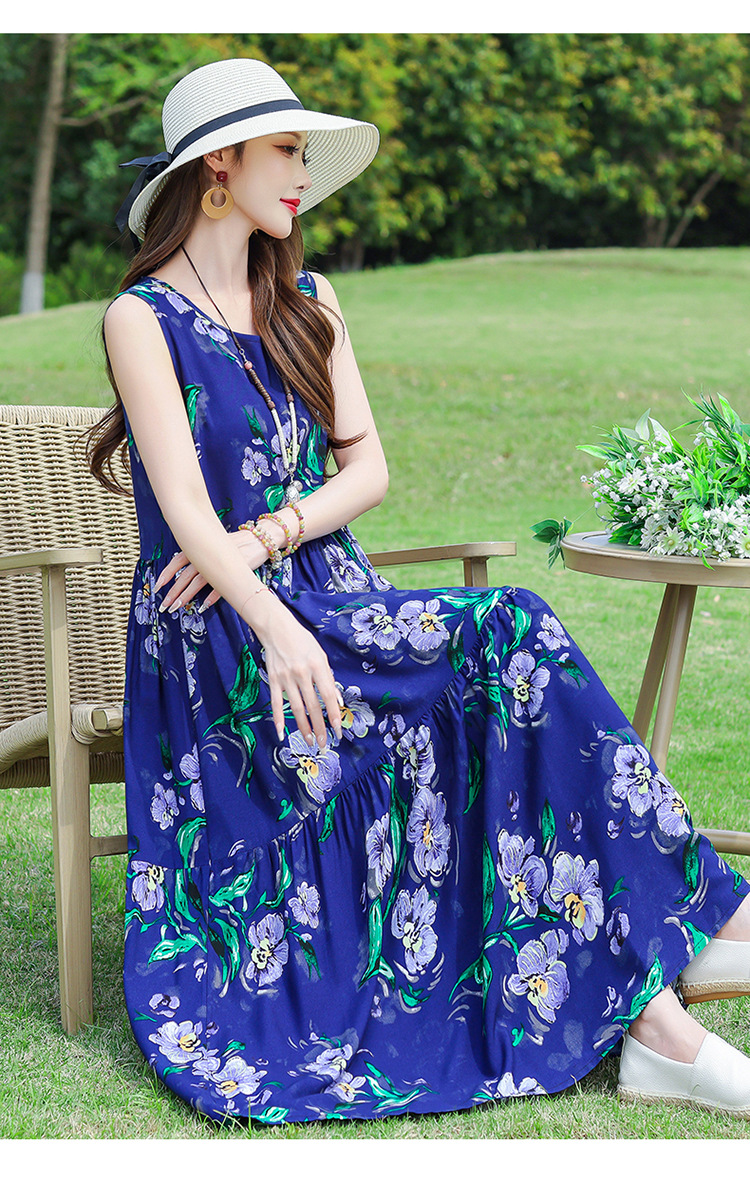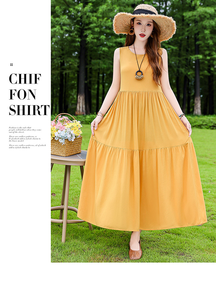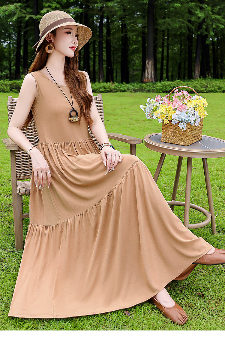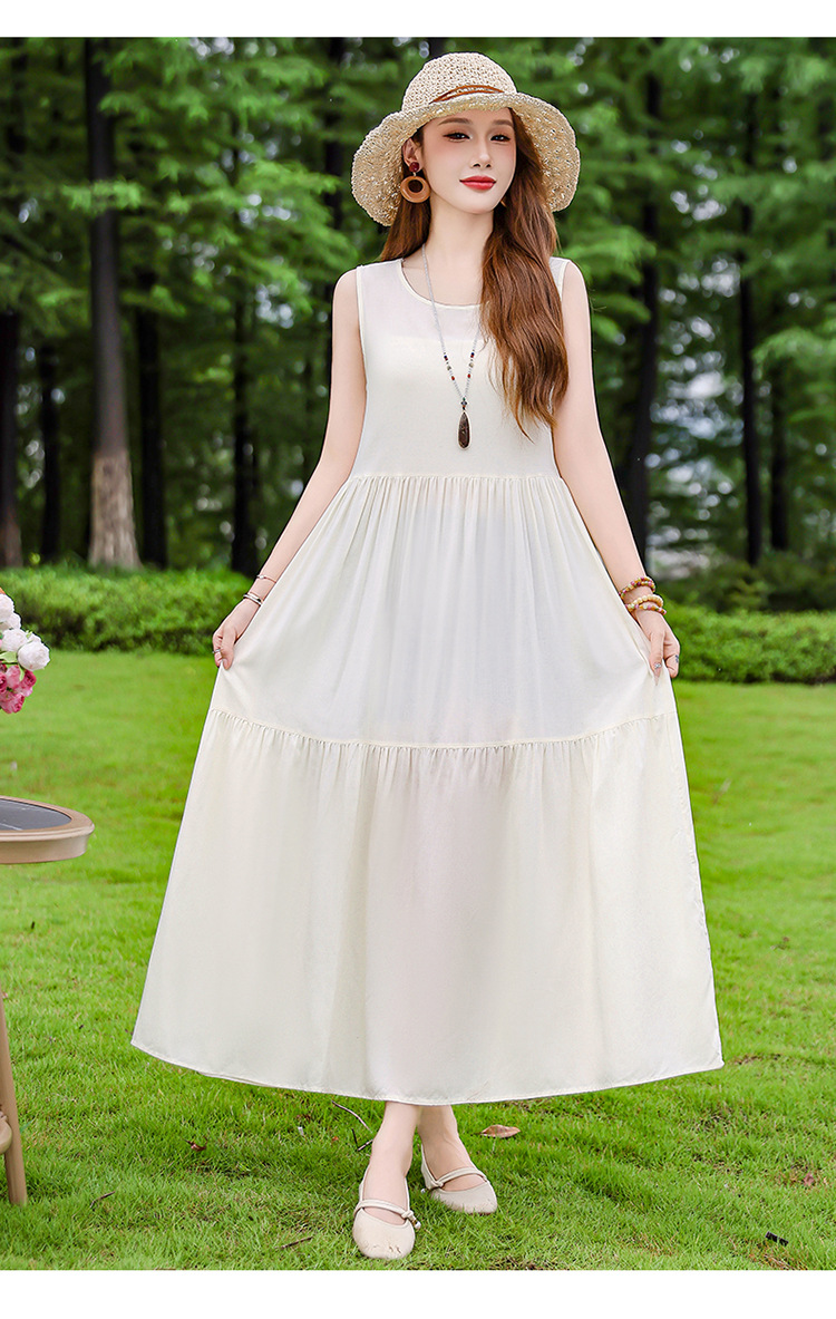 여름 면 실크 드레스 새로운 겉옷 젊은 스타일 서스펜더 비치 스커트 여성 민소매 휴가 스커트 우아한 롱 스커트