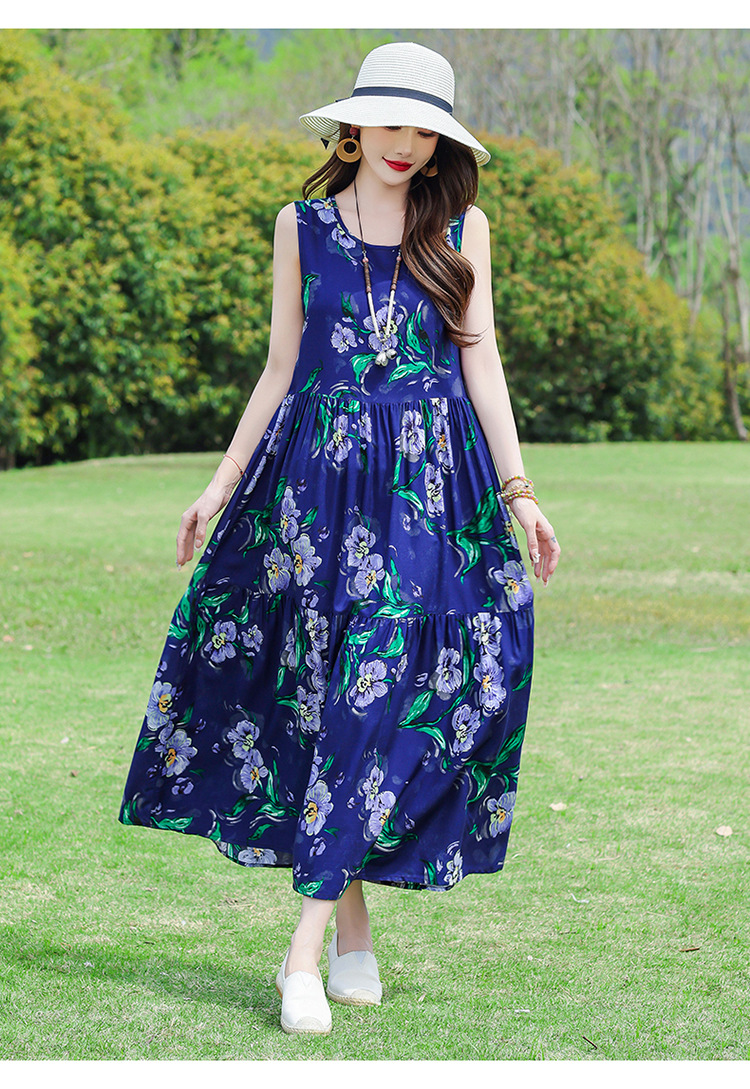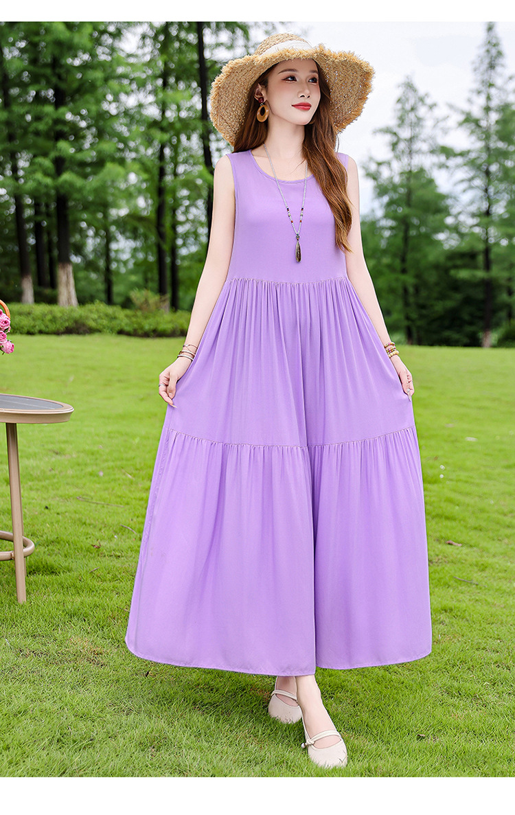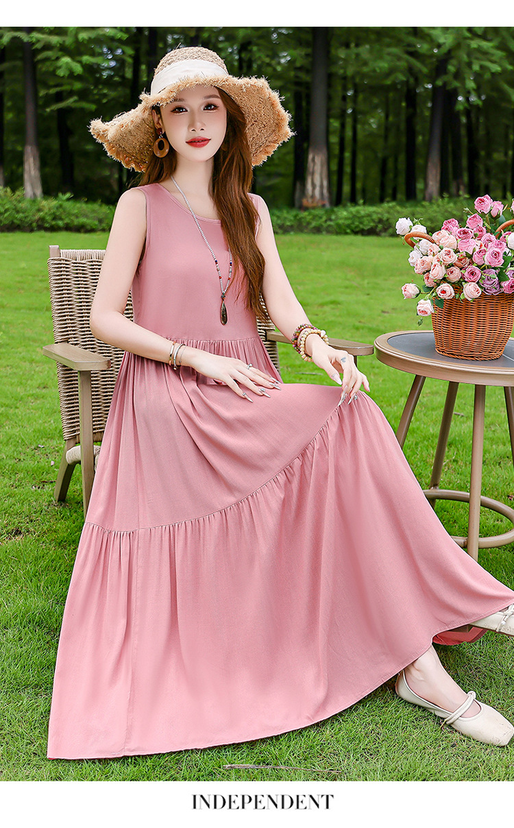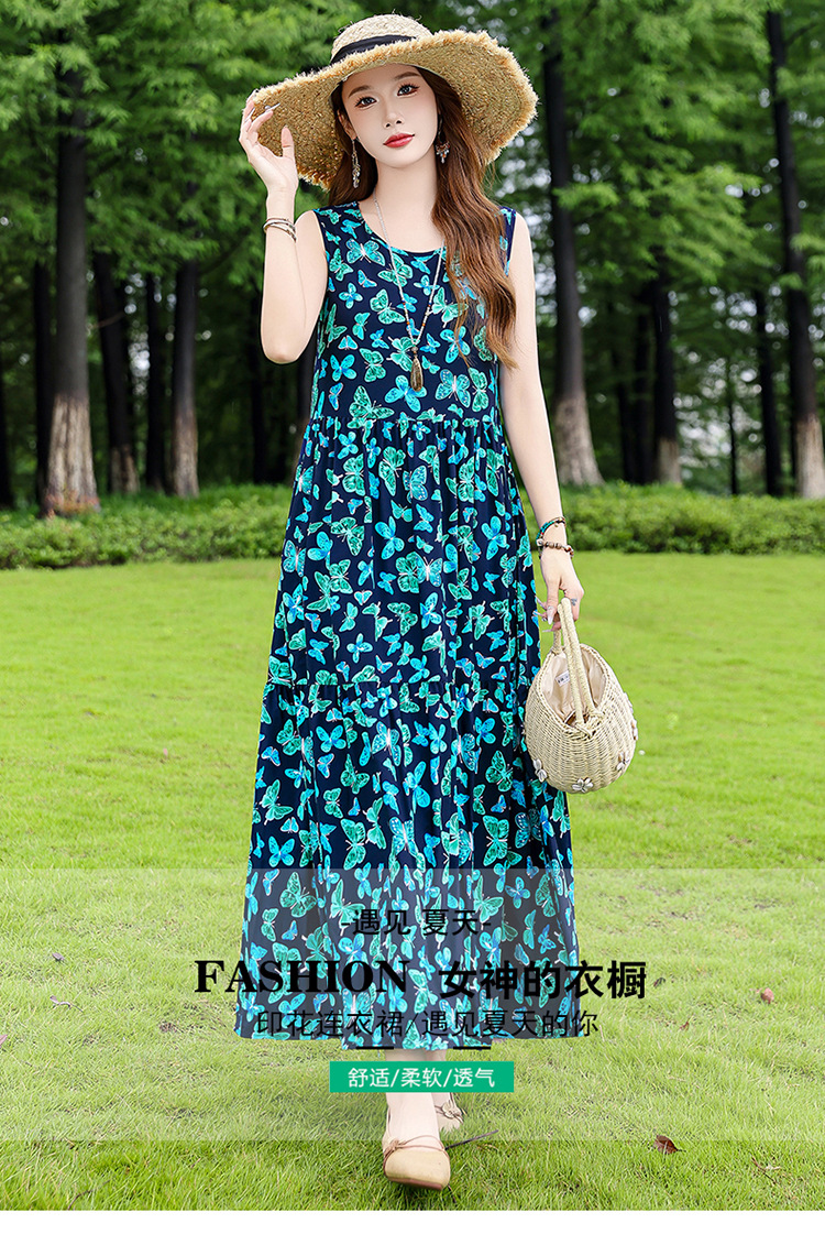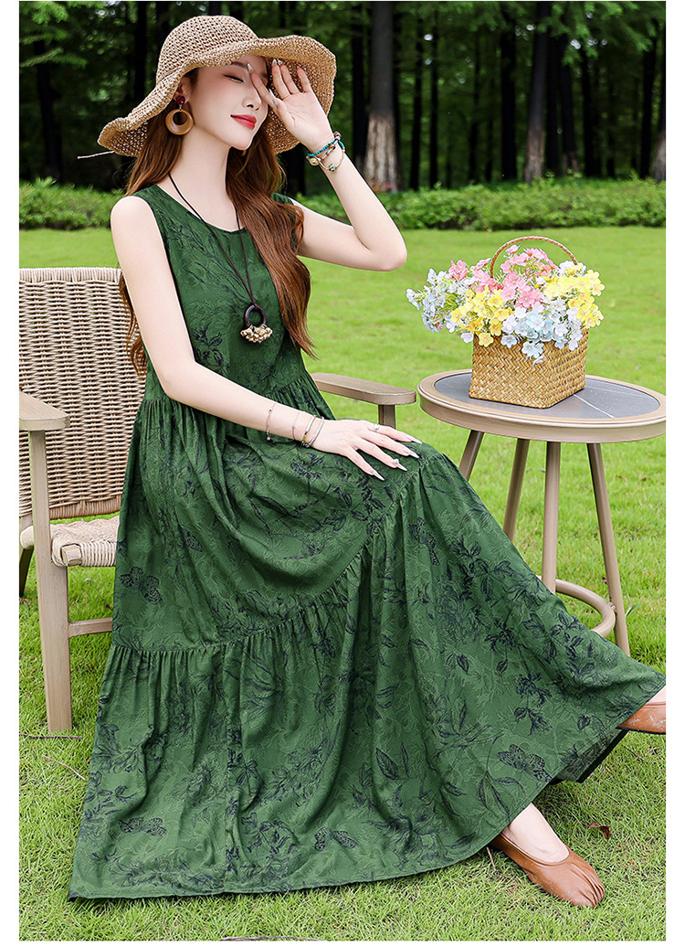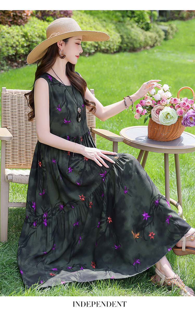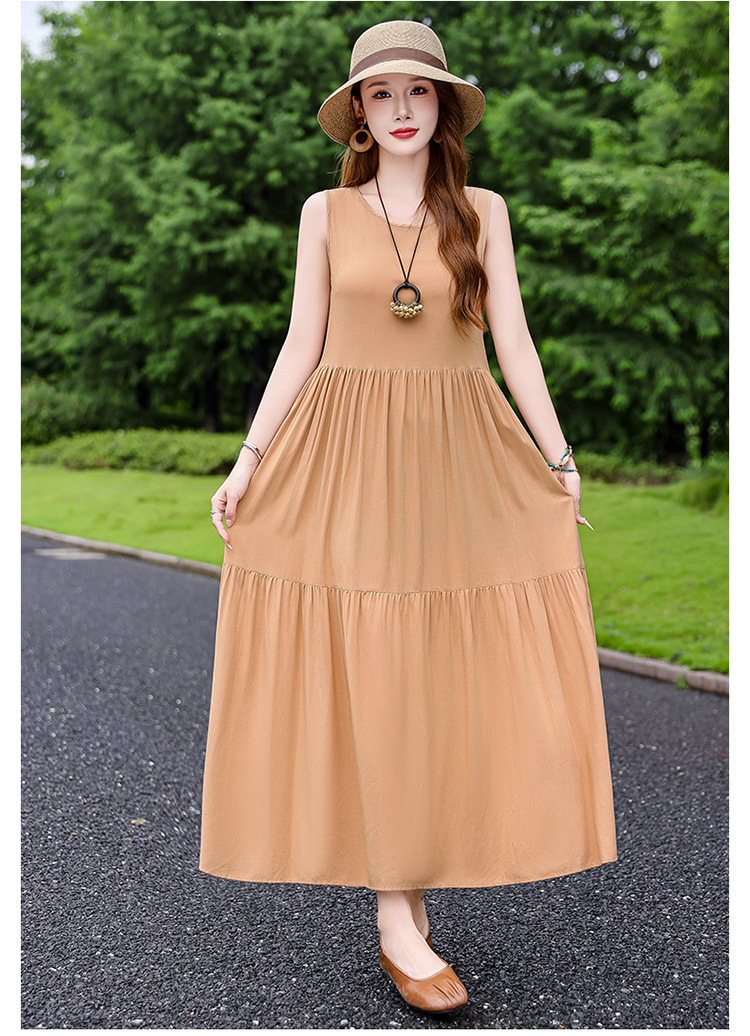여름 면 실크 드레스 새로운 겉옷 젊은 스타일 서스펜더 비치 스커트 여성 민소매 휴가 스커트 우아한 롱 스커트