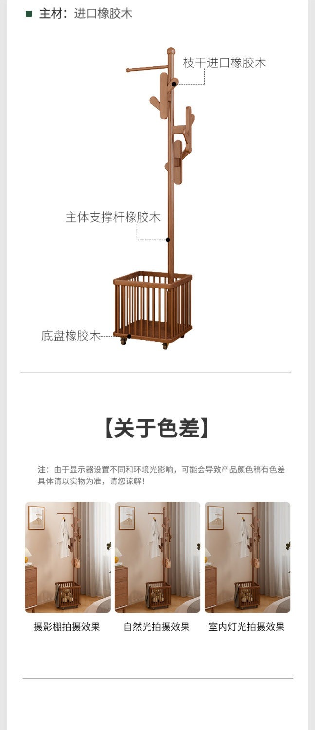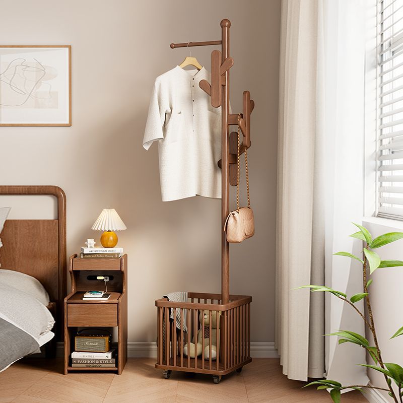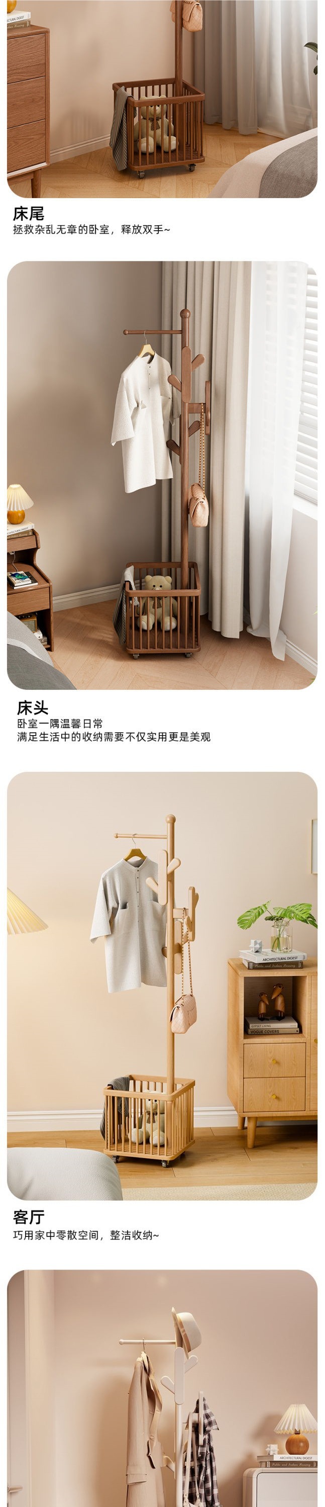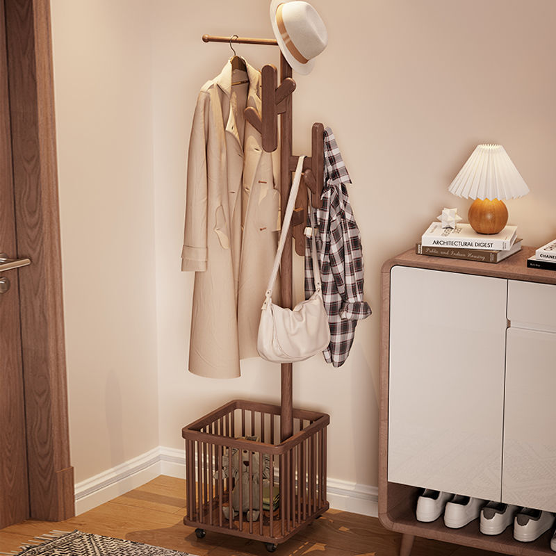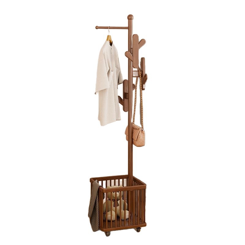 단단한 나무 옷걸이 바닥 코트 랙 침실 이동식 가정용 옷 바구니 보관 랙 걸이 다기능 가방