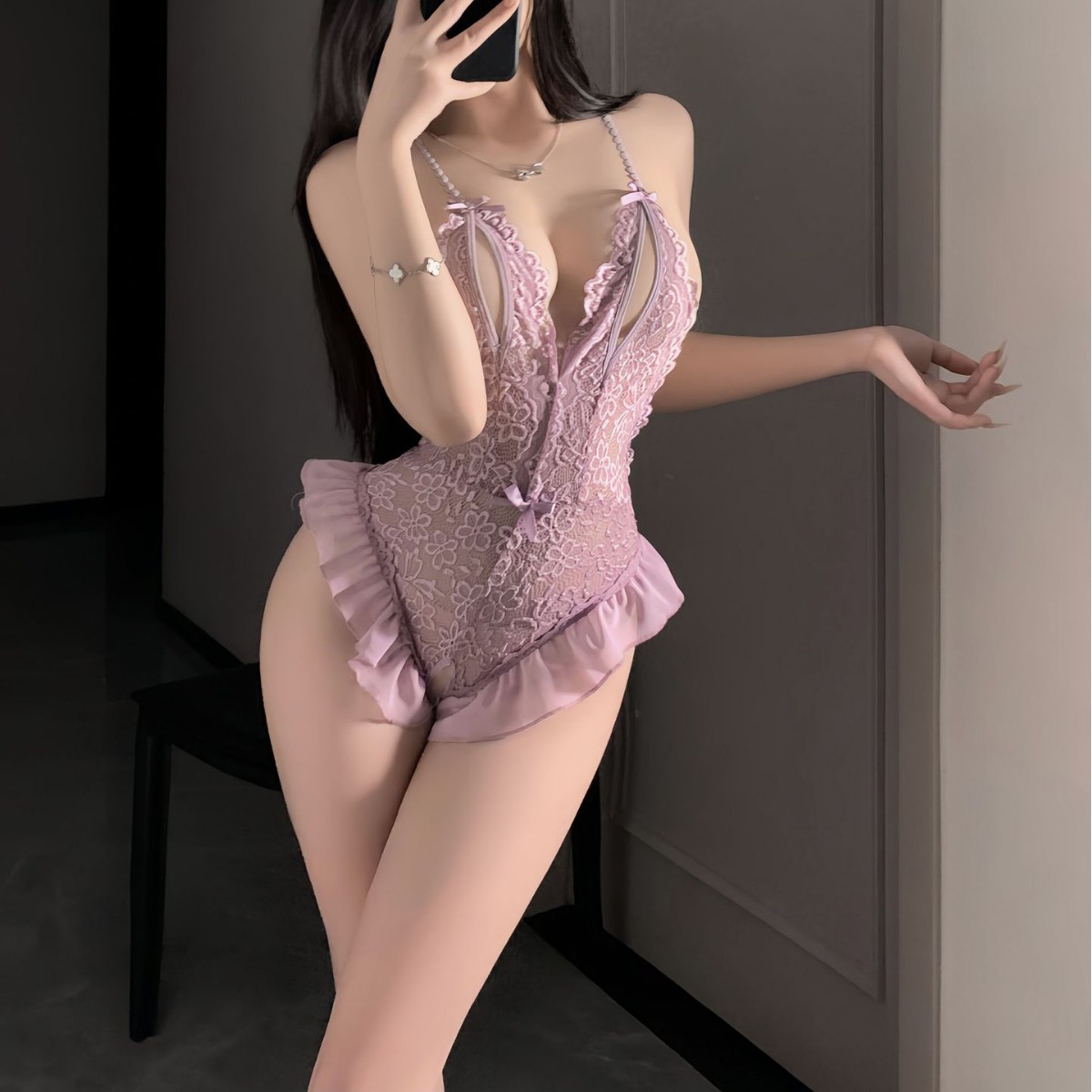 로맨틱 퍼플-섹시 란제리 섹시 레이스 할로우 원피스 옷 여성 크로트 열정 세트 잠옷 무료 유혹