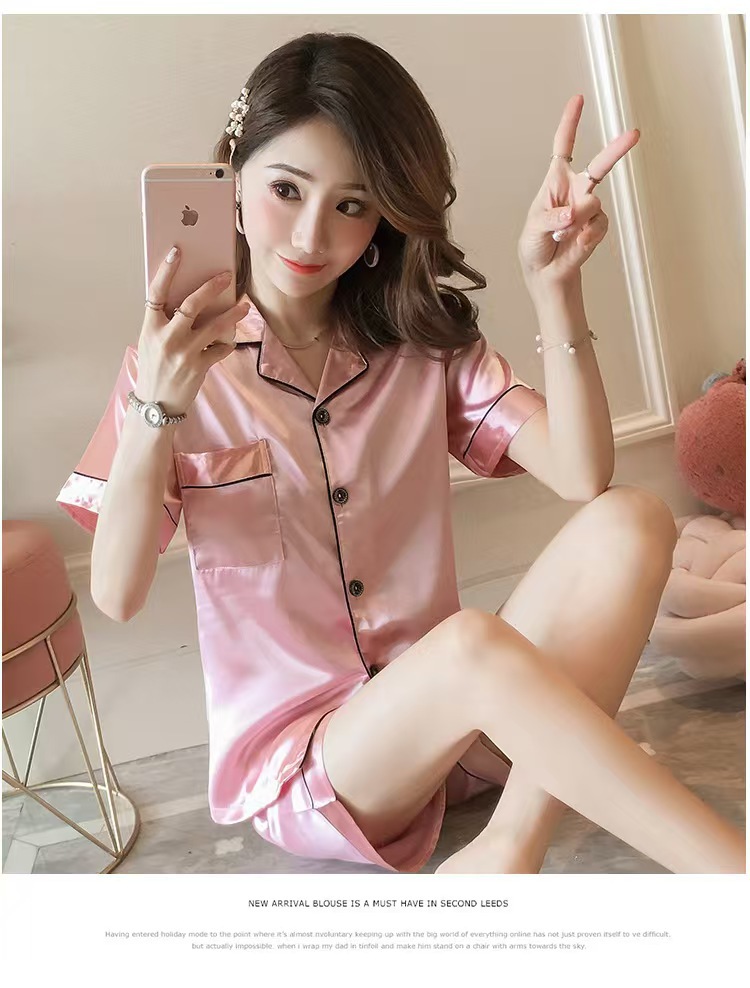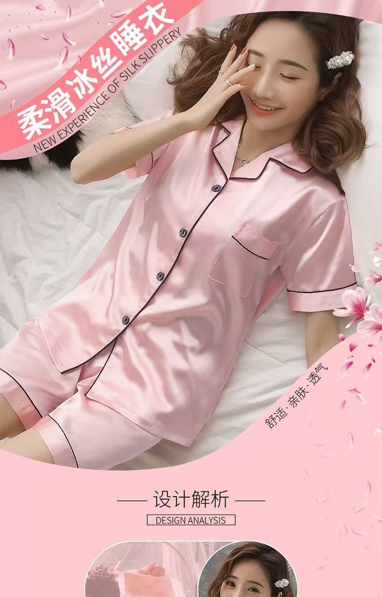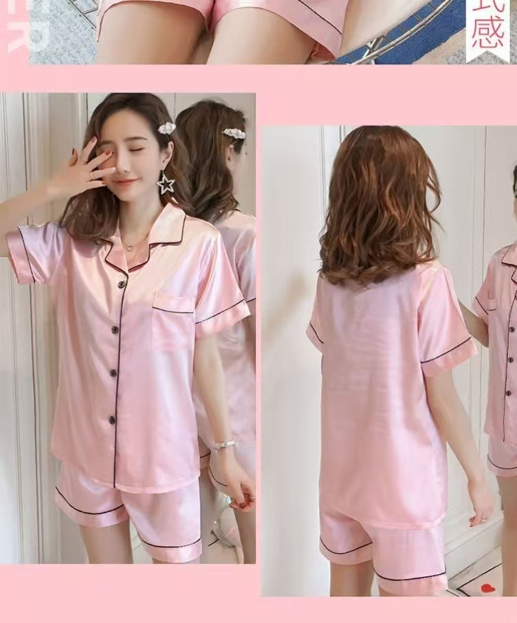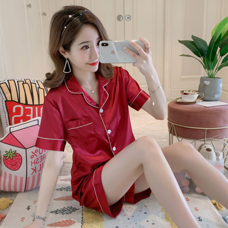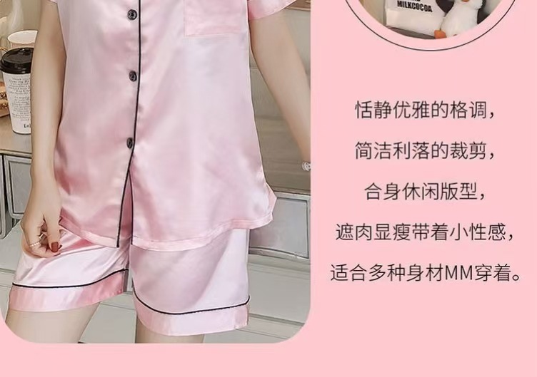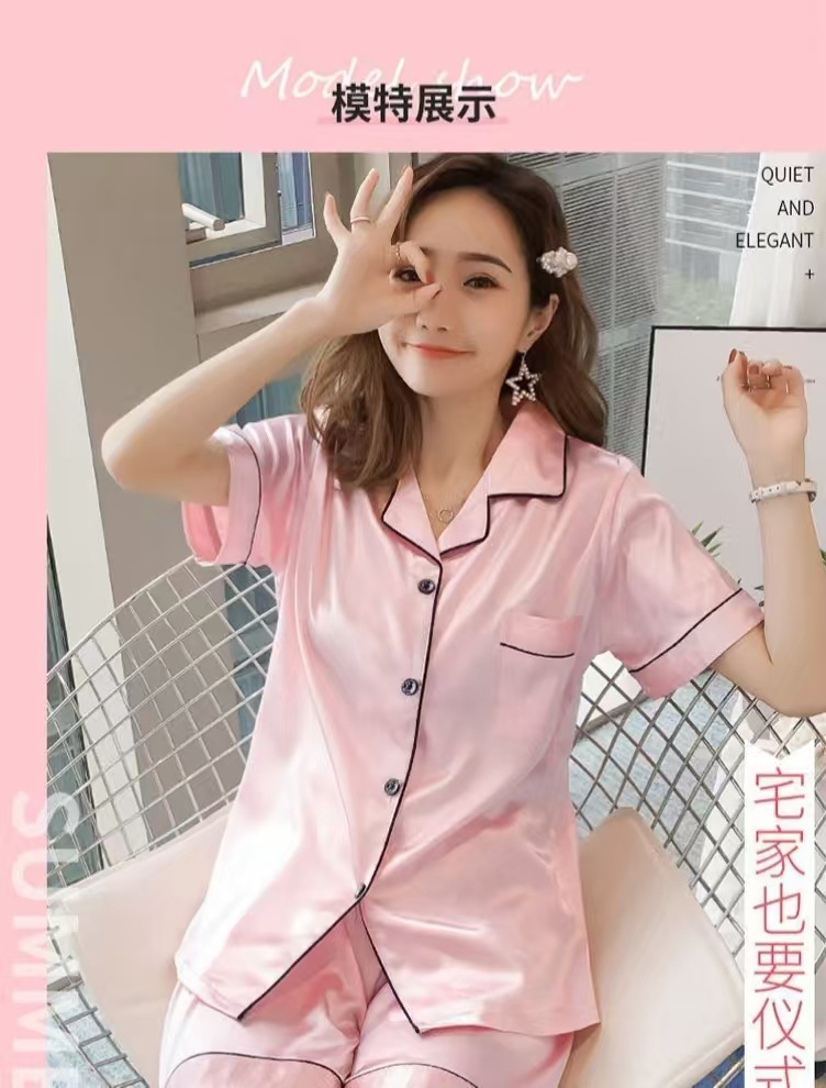 여성을위한 단색 반팔 얼음 실크 잠옷 여름 새로운 멋진 캐주얼 느슨한 실크 투피스 홈웨어 세트