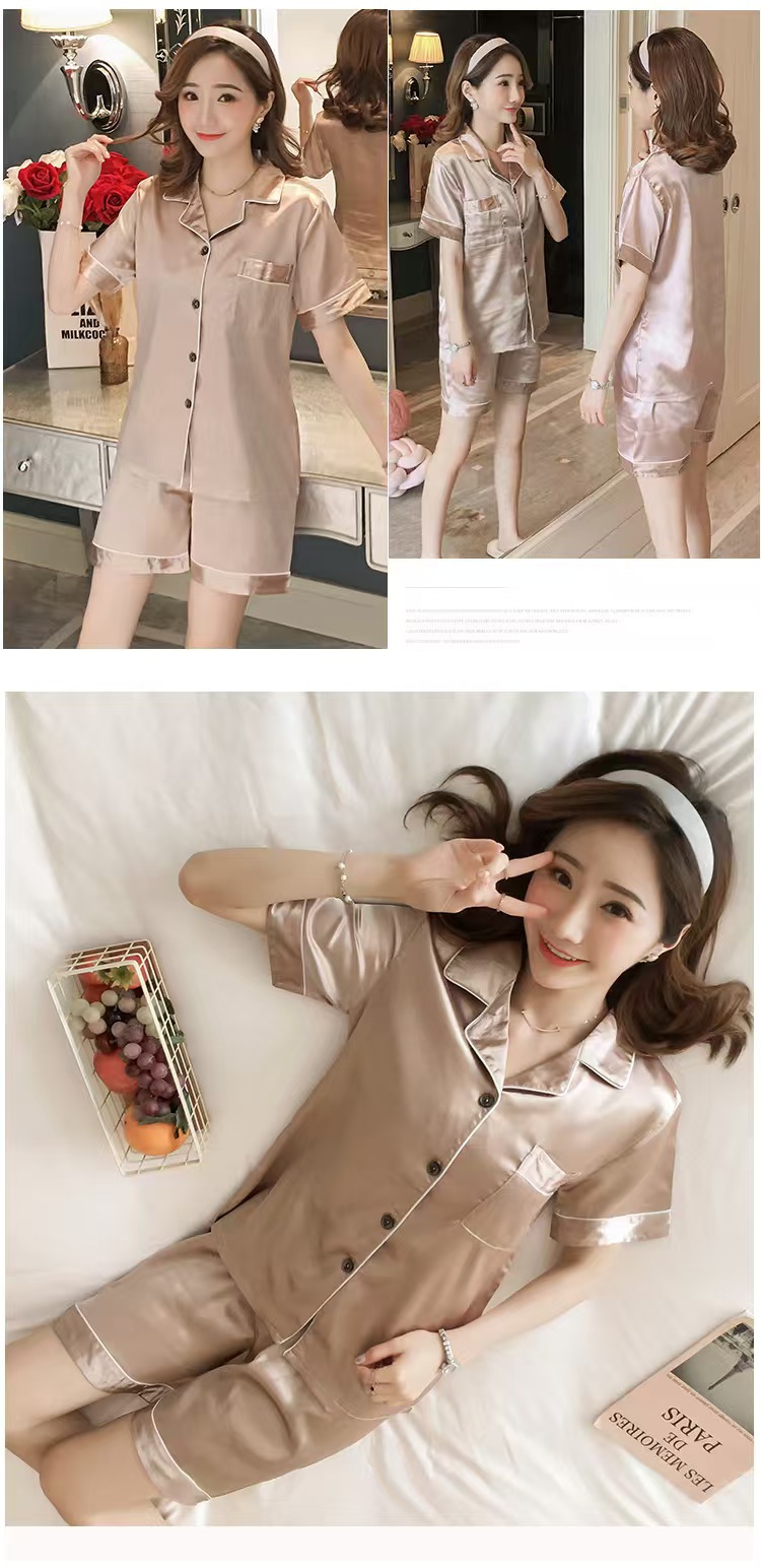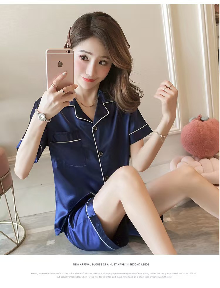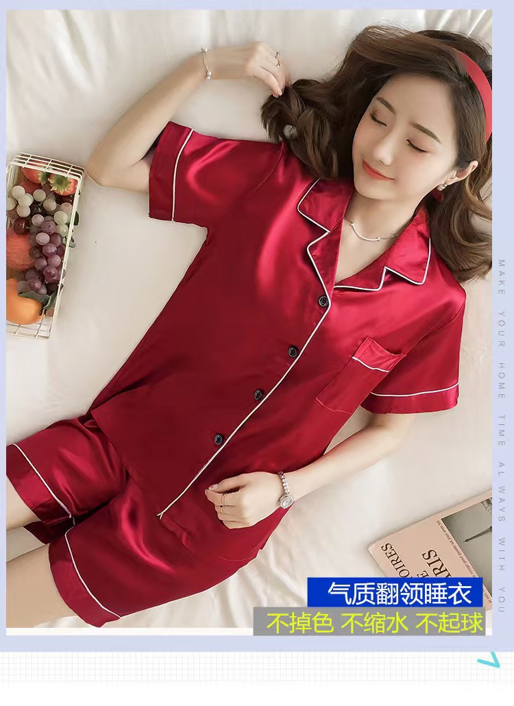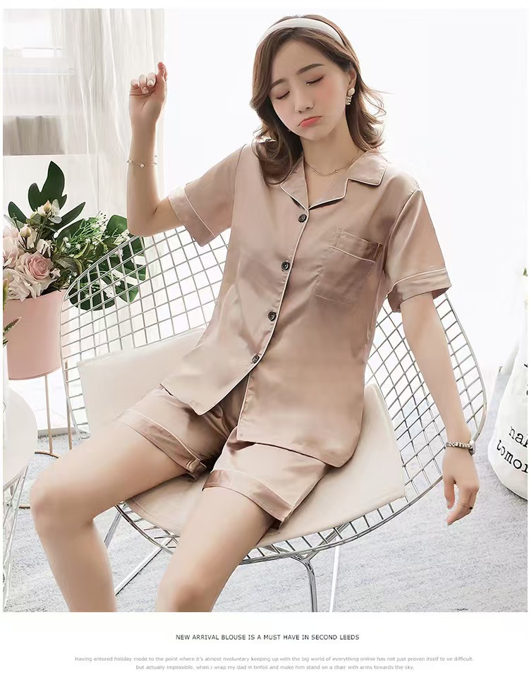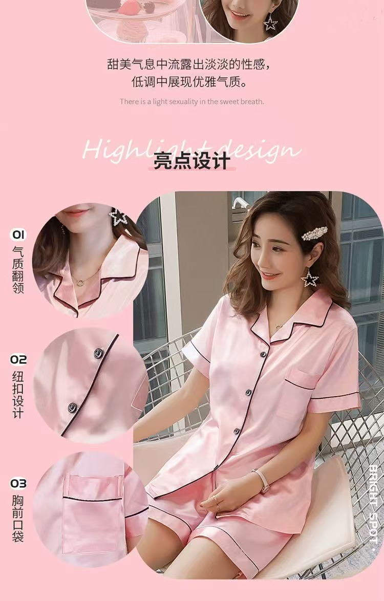 여성을위한 단색 반팔 얼음 실크 잠옷 여름 새로운 멋진 캐주얼 느슨한 실크 투피스 홈웨어 세트