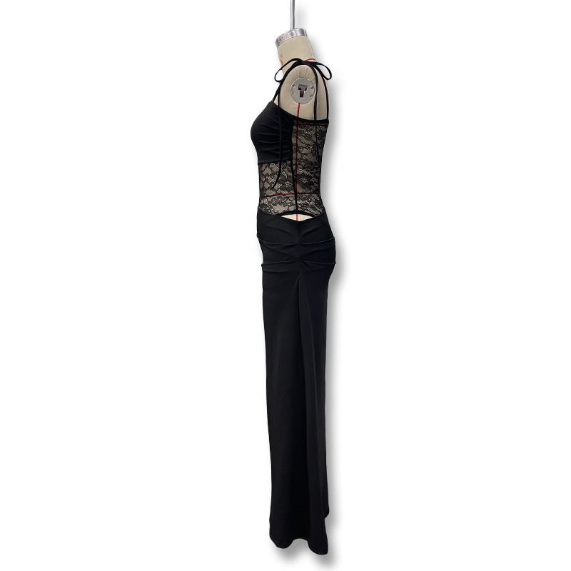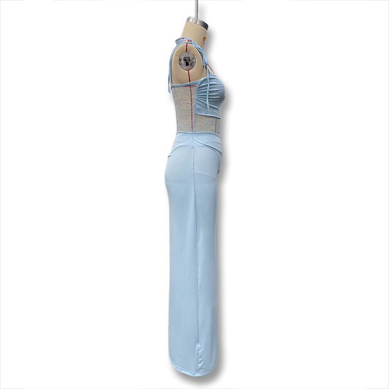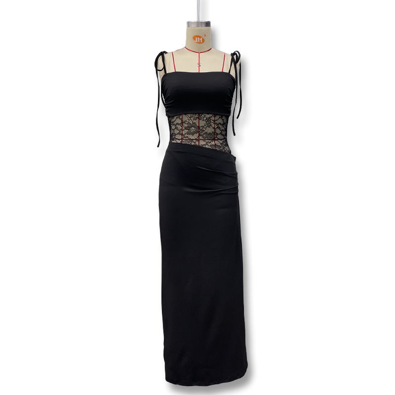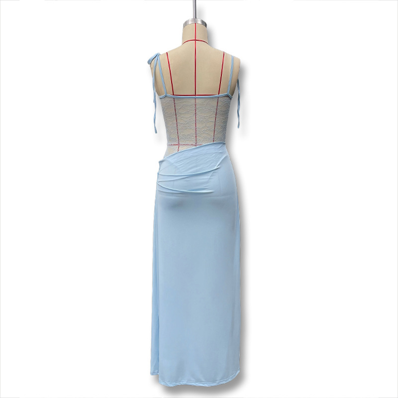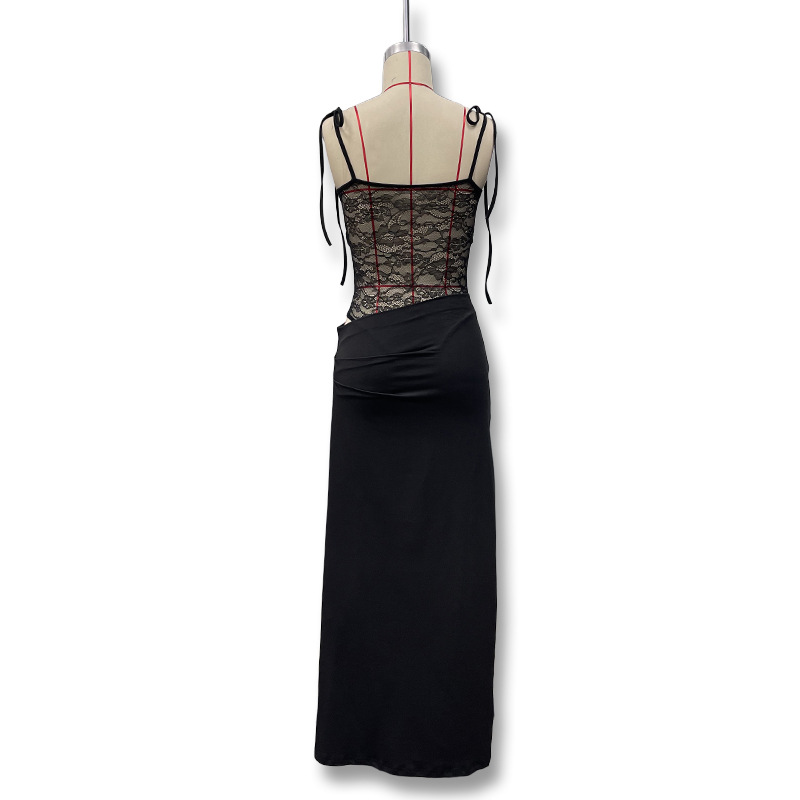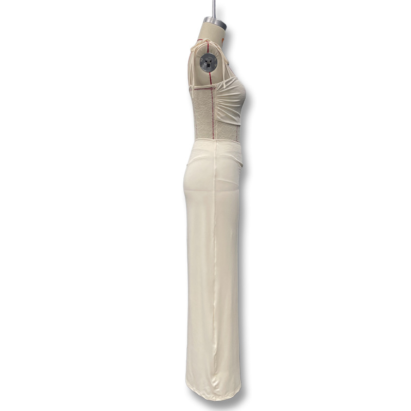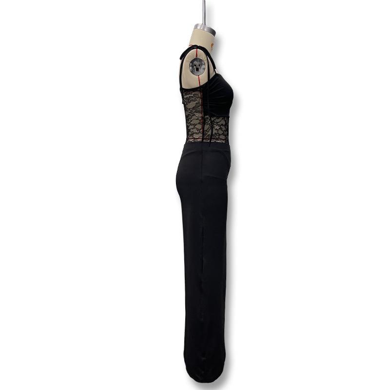유럽과 미국 스타일의 새로운 레이스 오프 숄더 스트랩 슬림 스플릿 원피스 섹시한 스티칭 중공 관점 원피스