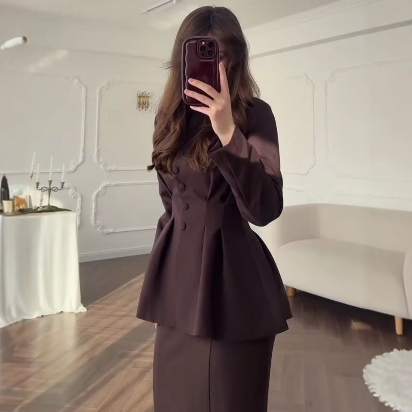 유럽과 미국의 2025 가을 새로운 허리 슬리밍 버튼 긴 소매 코트 우아한 피쉬 테일 엉덩이 원피스 세트 여성 의류