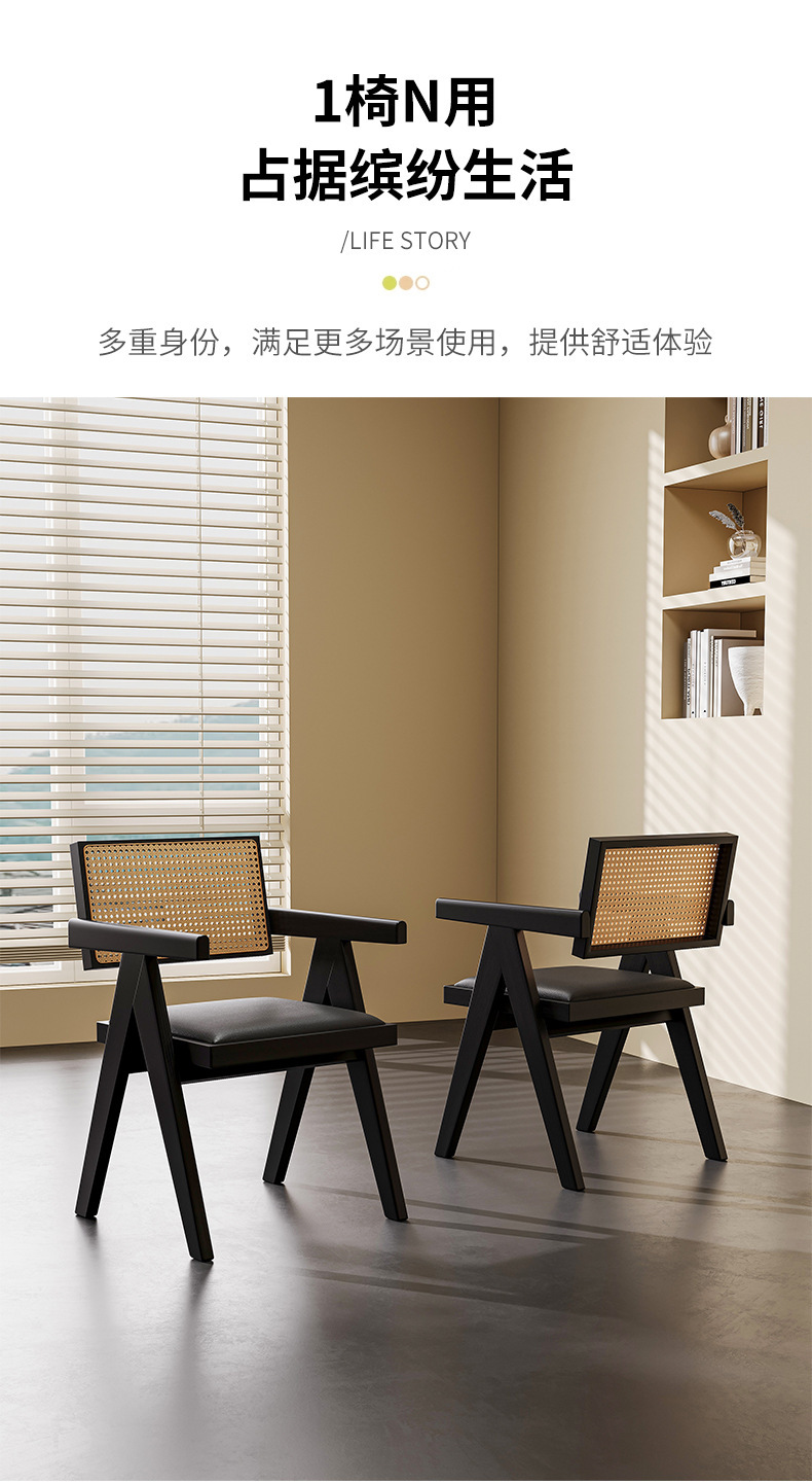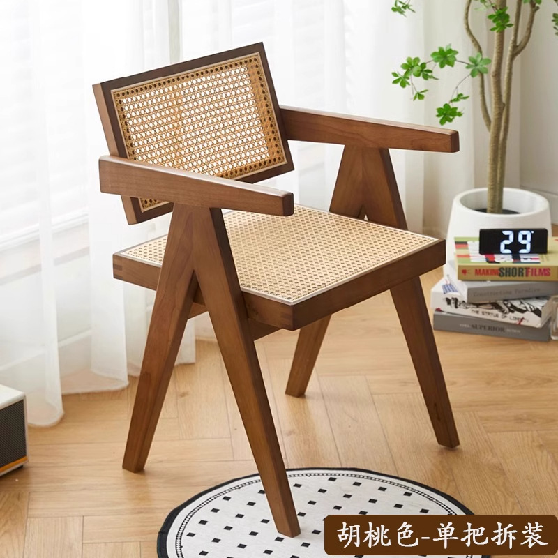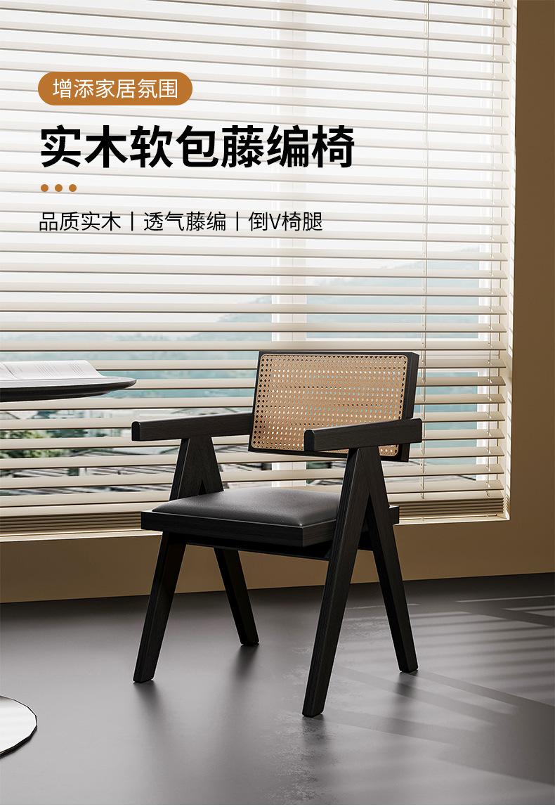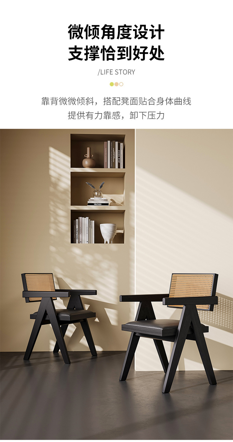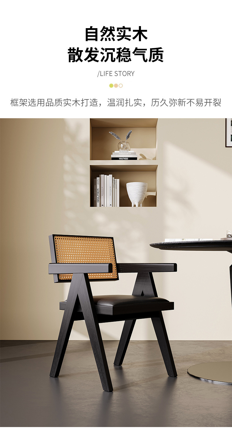 实木餐椅家用中古风昌迪加尔椅侘寂风软包扶手靠背椅休闲藤编椅子