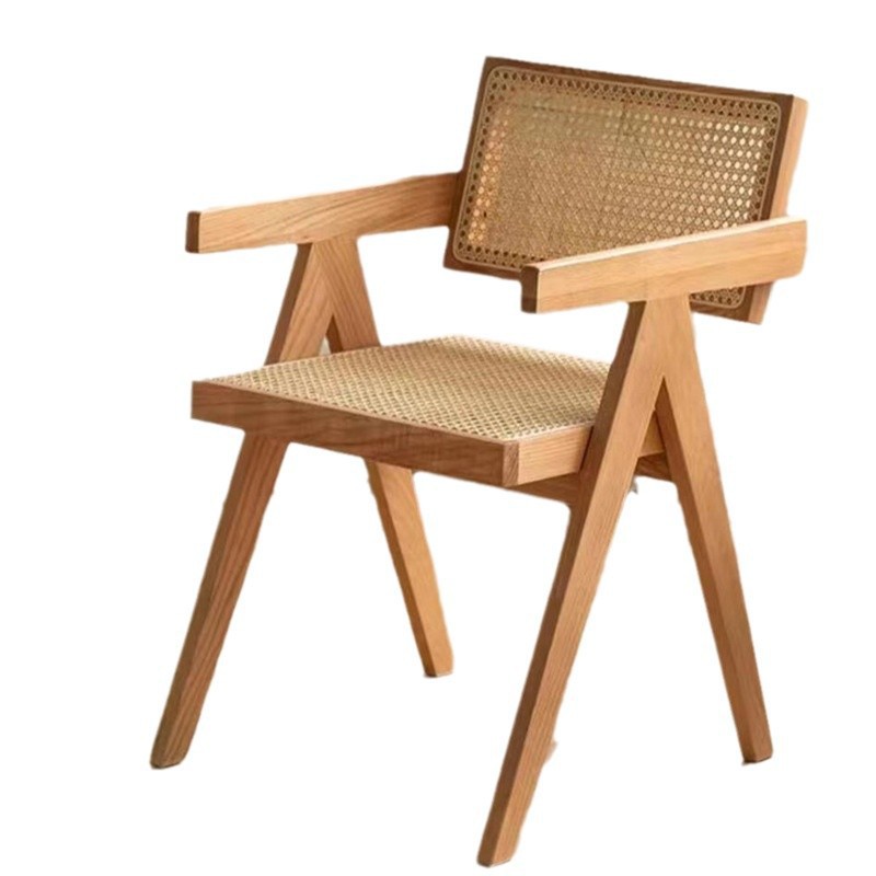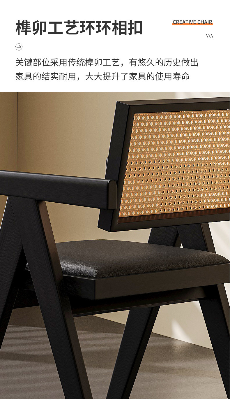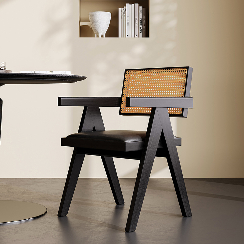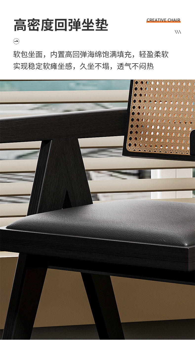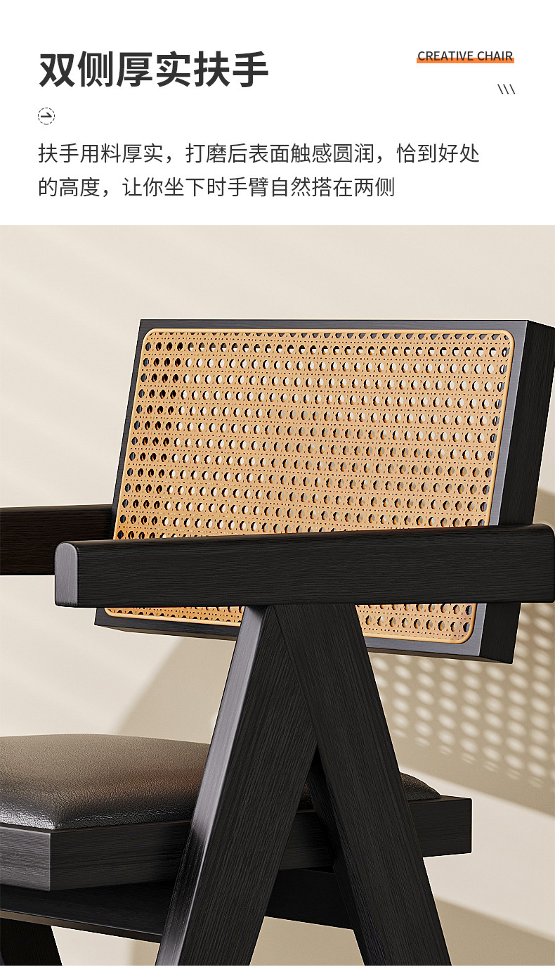实木餐椅家用中古风昌迪加尔椅侘寂风软包扶手靠背椅休闲藤编椅子