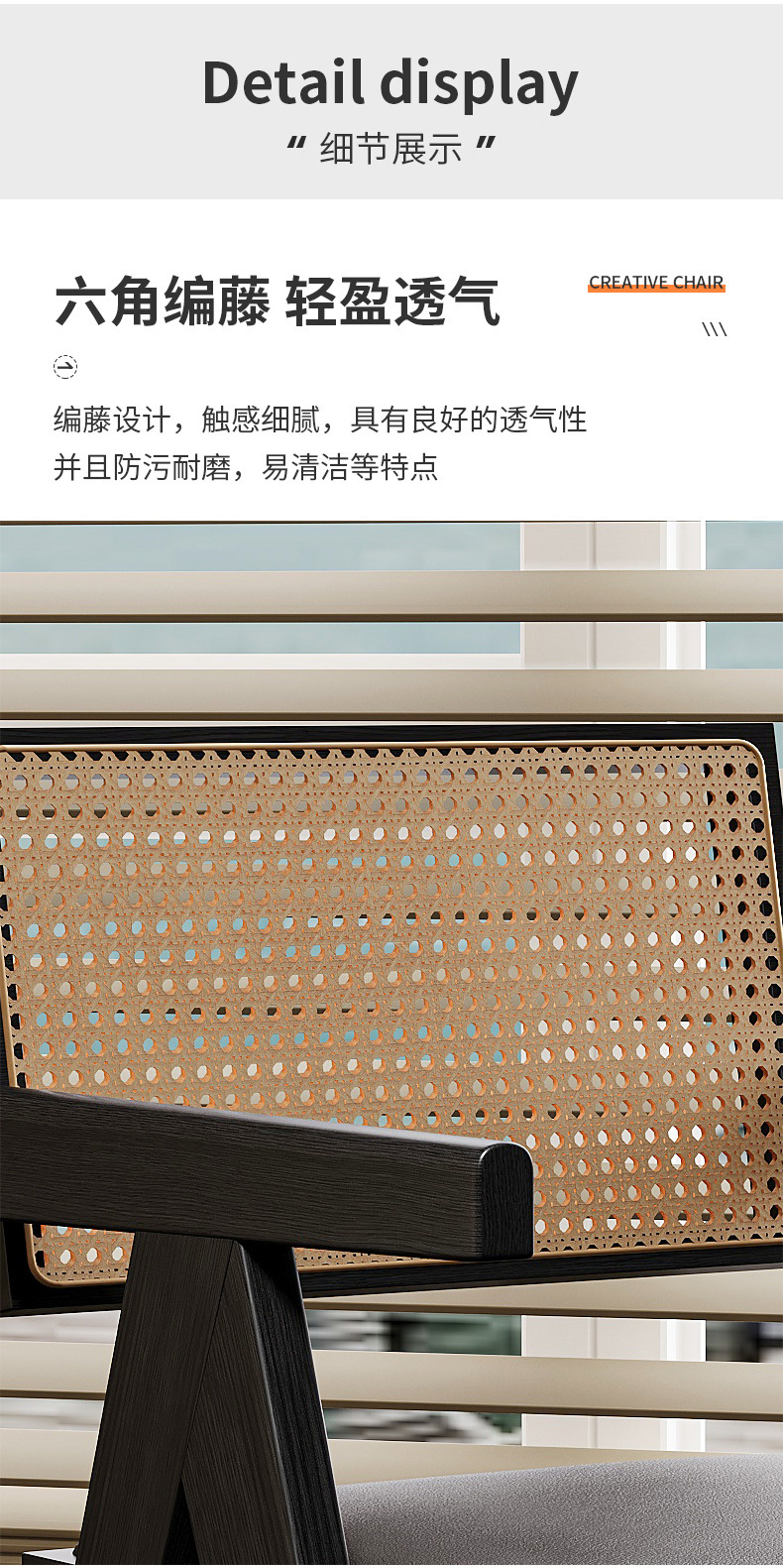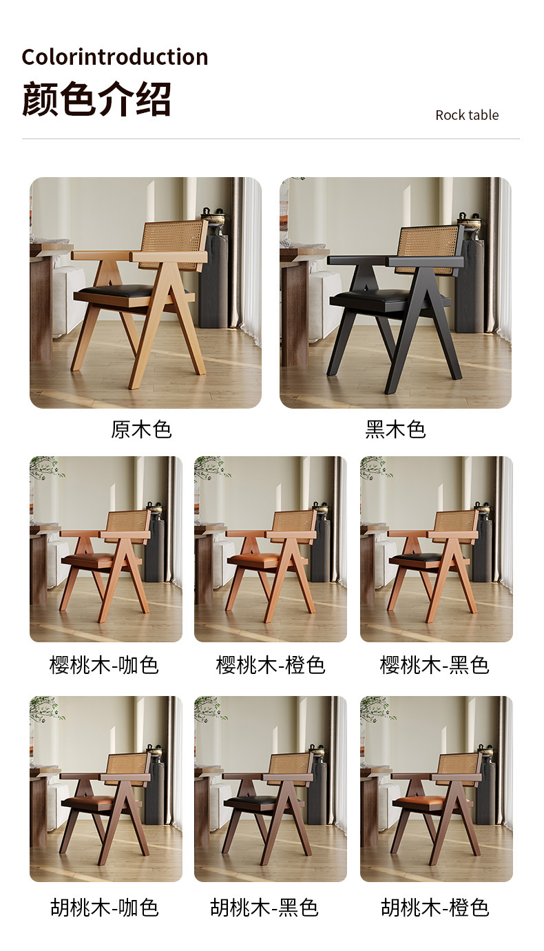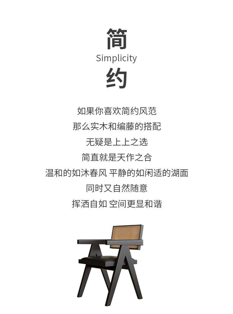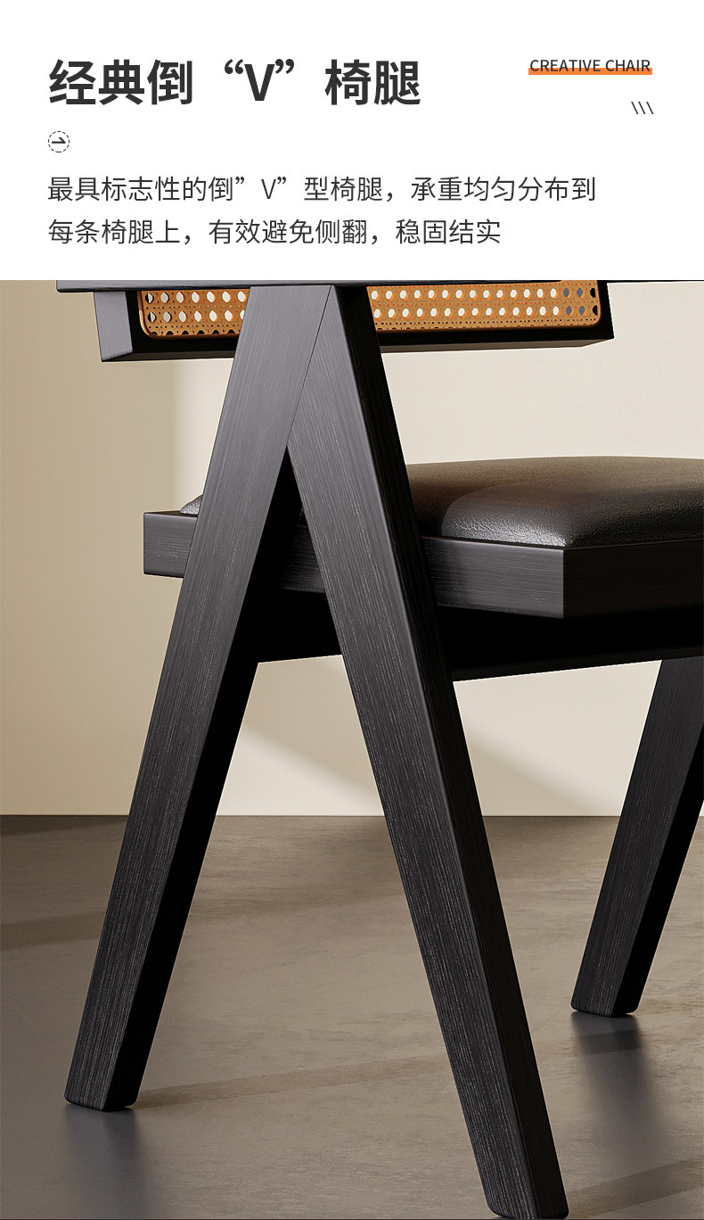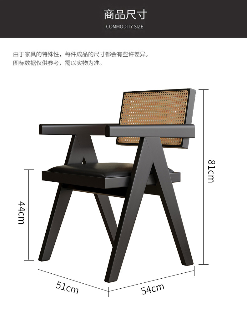 实木餐椅家用中古风昌迪加尔椅侘寂风软包扶手靠背椅休闲藤编椅子