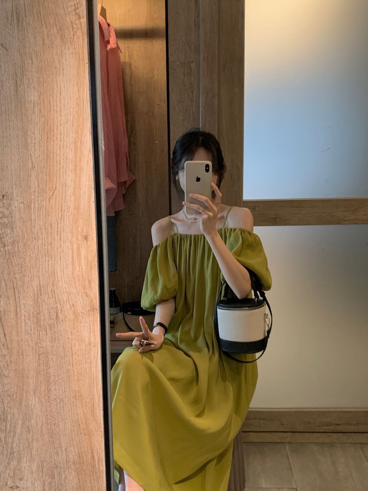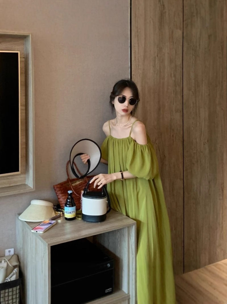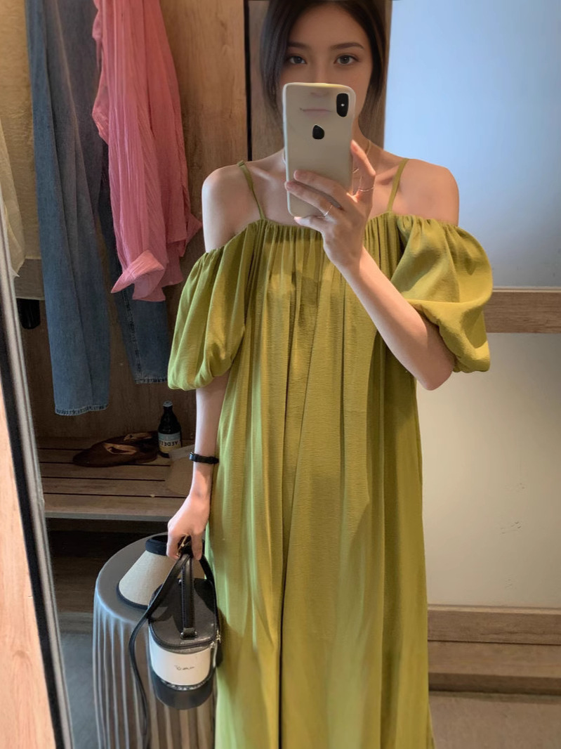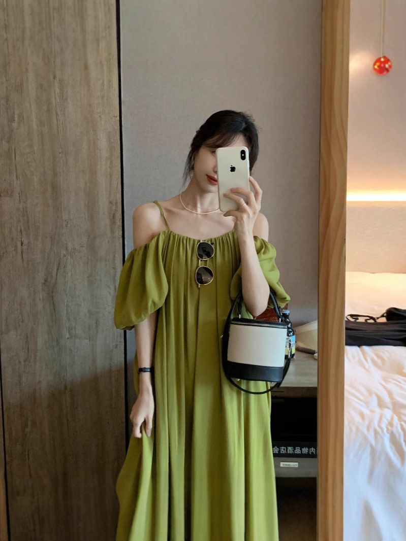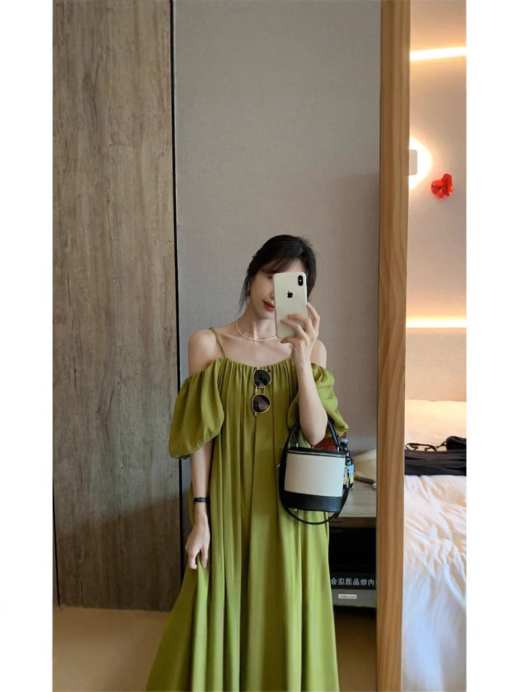 통통녀 엑스트라 사이즈 150.00kg 녹색 프렌치 스타일 비치 원피스 오프 숄더 원피스 여성 여름 느슨한 오프 숄더 패션