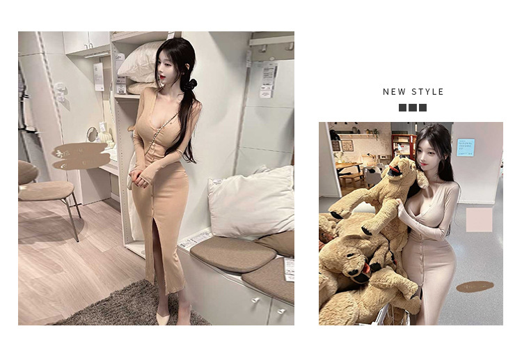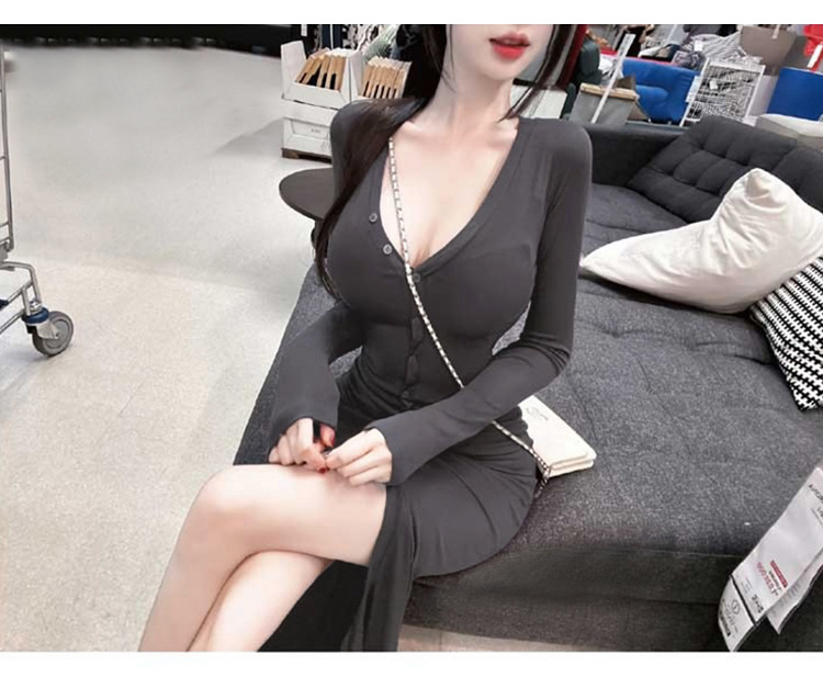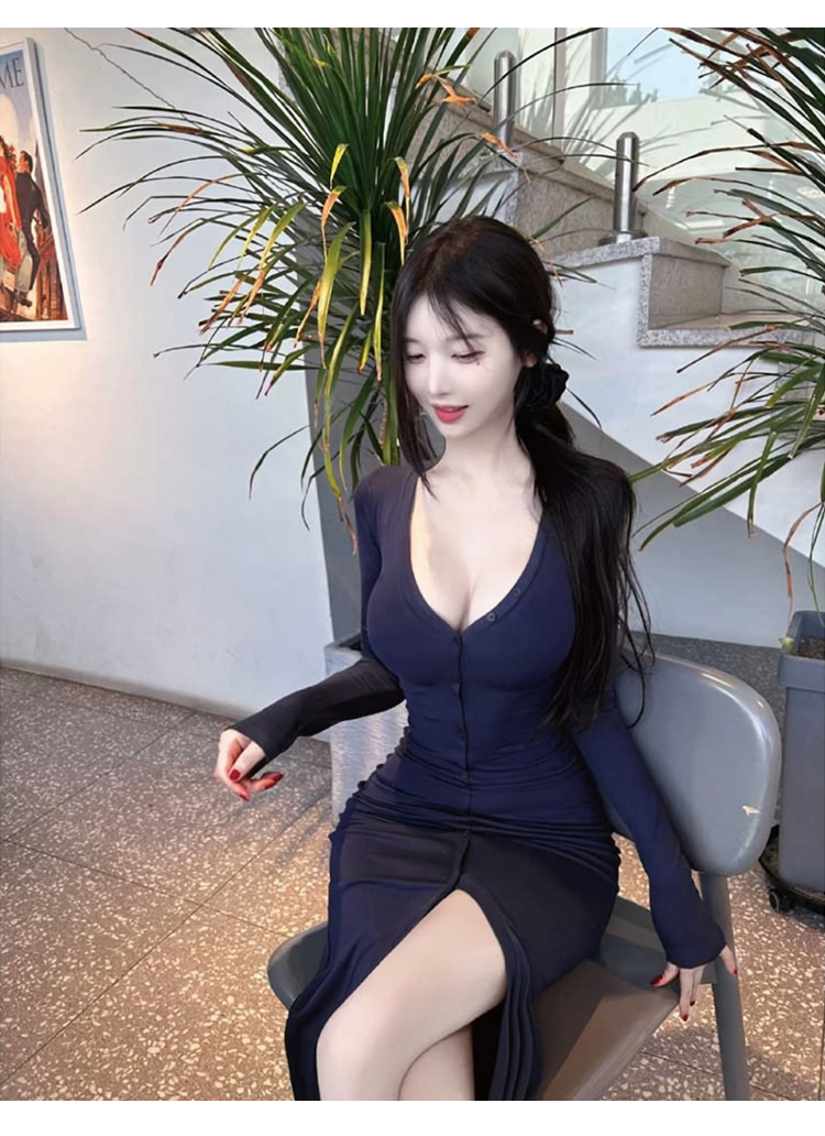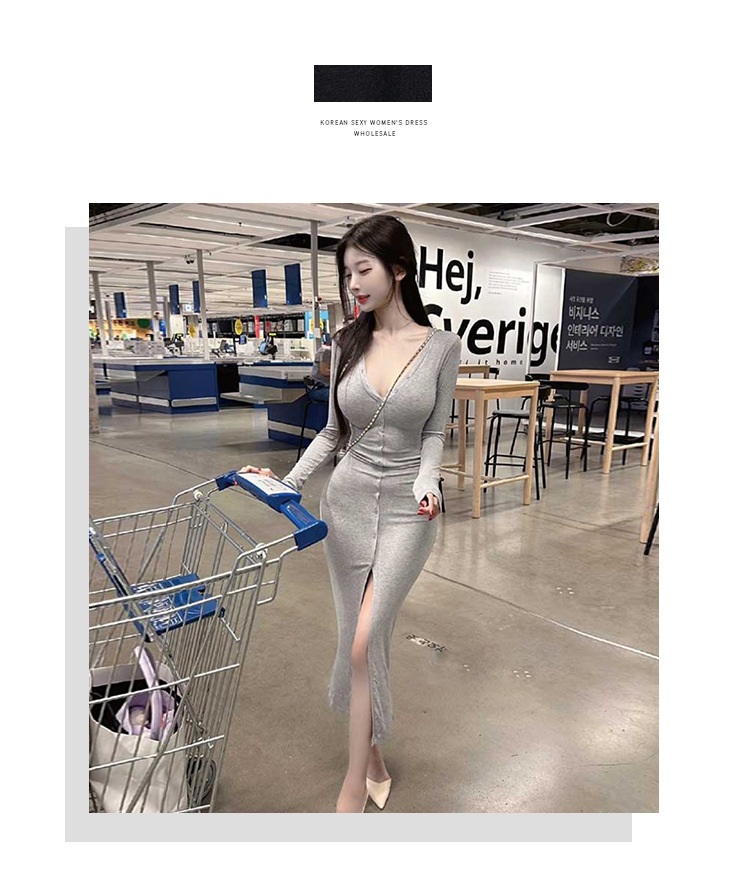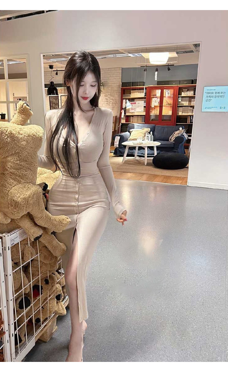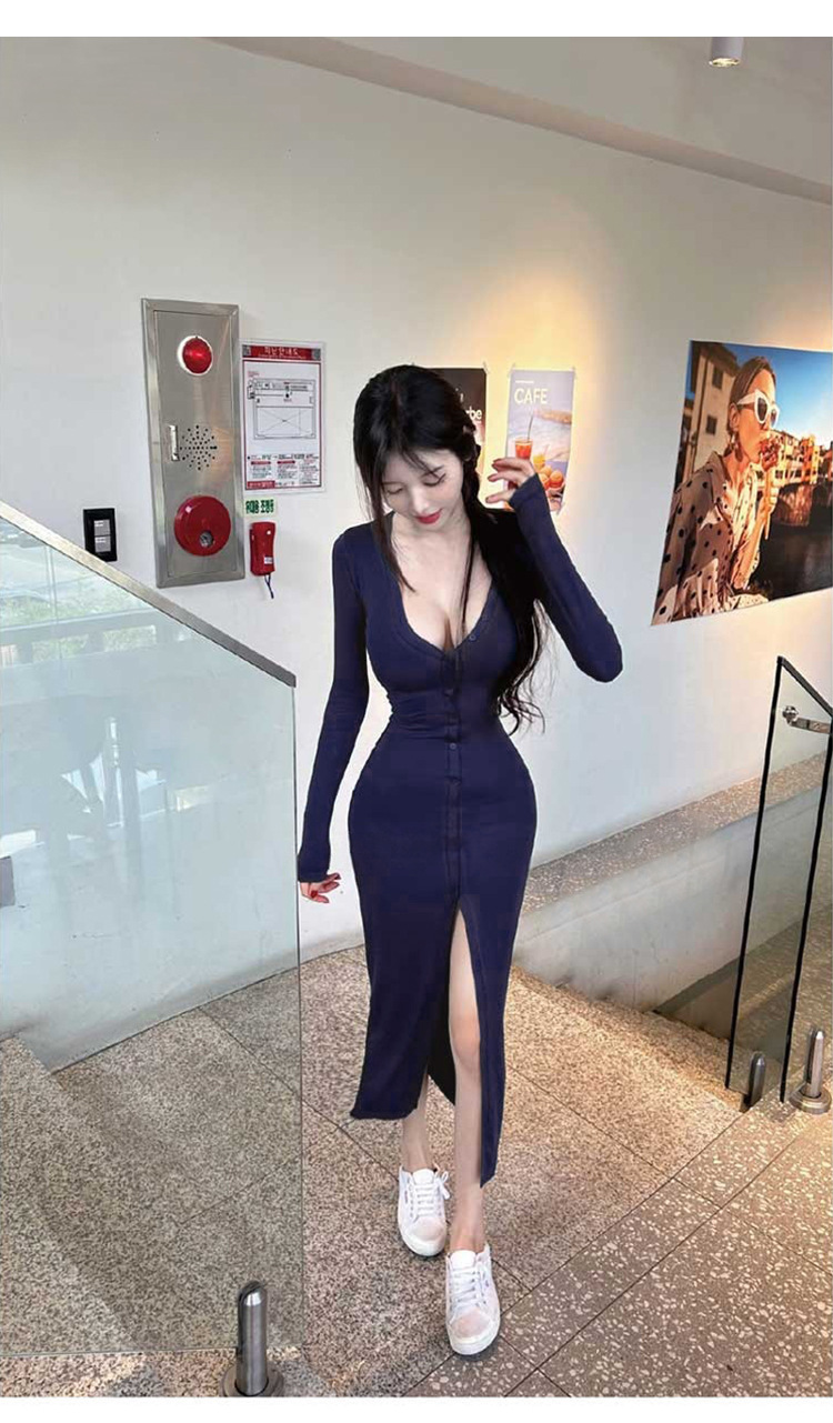 한국 동대문 신상 슬림하고 섹시한 핫걸 순수한 욕망 몸매를 드러내는 여성스러운 슬릿 힙 커버 긴팔 드레스