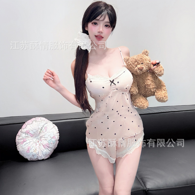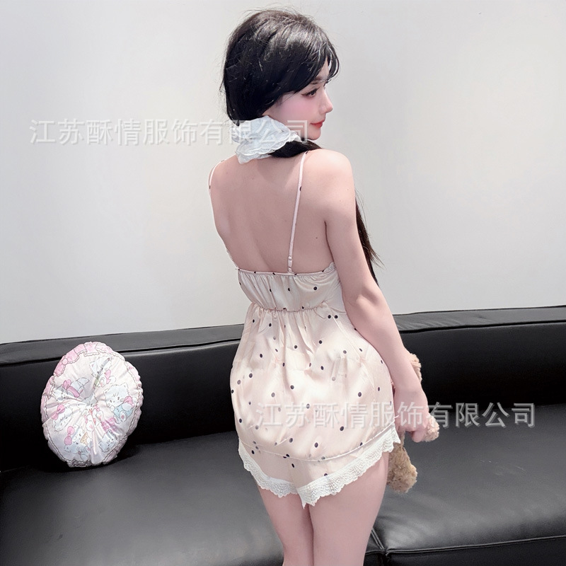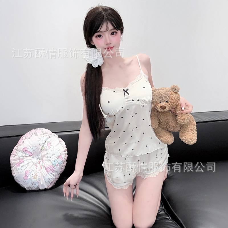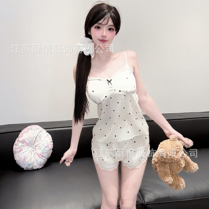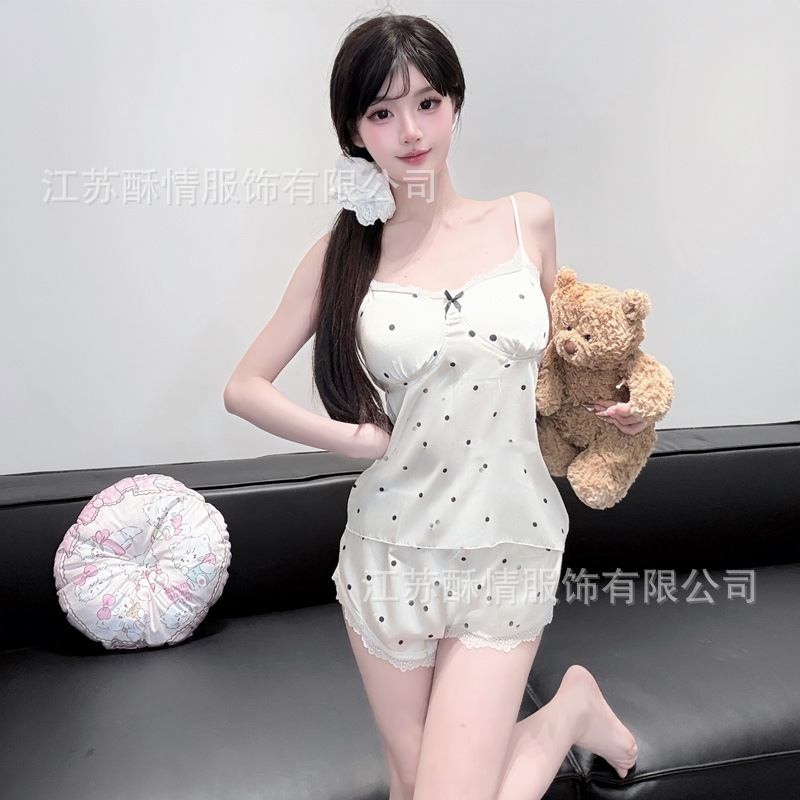 아이스 실크 잠옷 여름 뉴 웨이브 도트 슬링 반바지 실크 홈 옷 한국 달콤한 소녀 잠옷 인터넷 축하