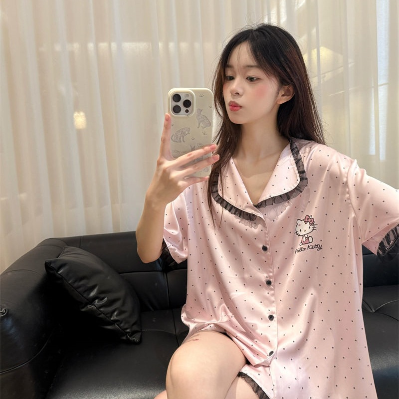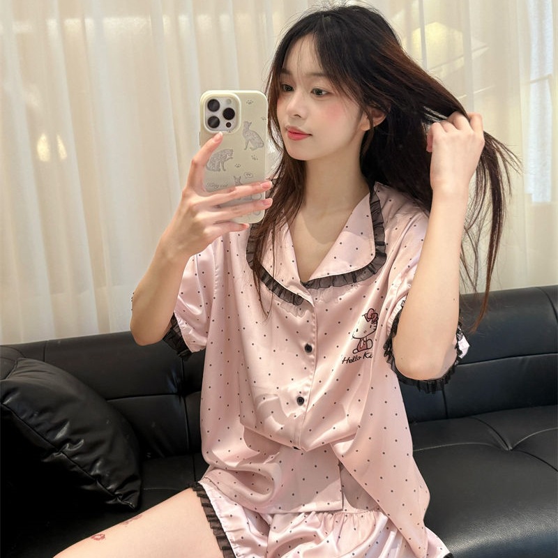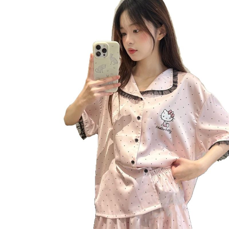 폴로 도트 헬로 키티 고양이 파자마 여성 여름 새 스타일 레이스 반팔 일본 학생 홈 의류 세트 외복