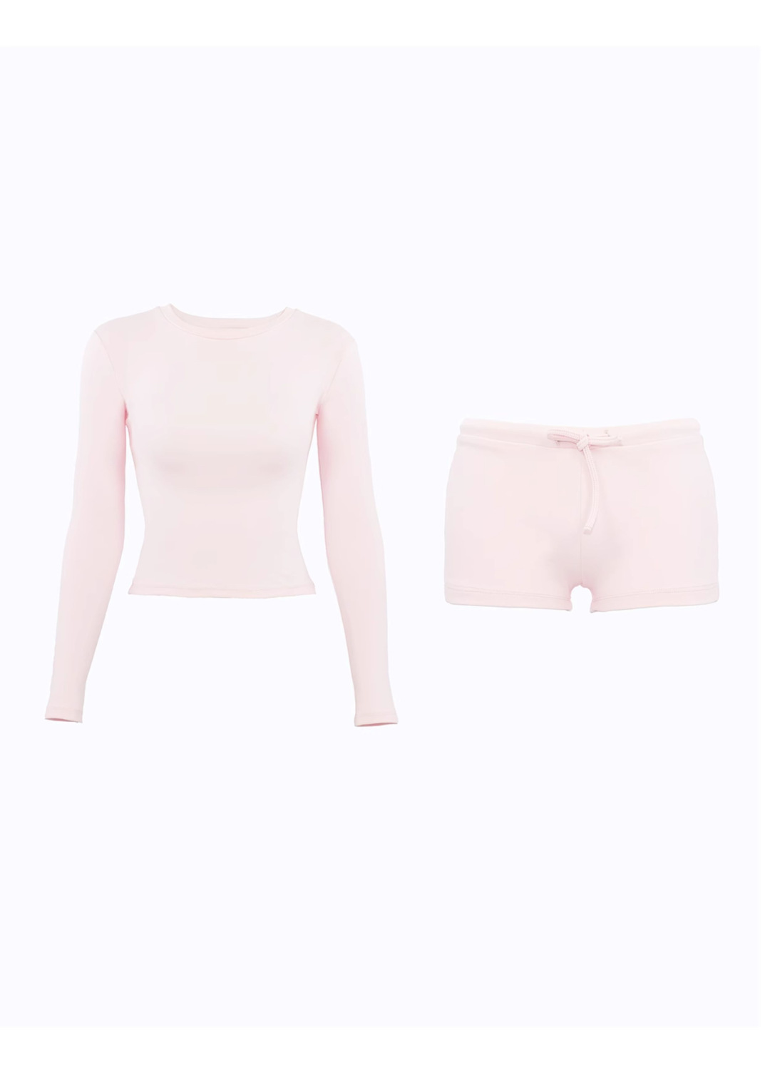 2025 여성 봄 새로운 핑크 라운드 넥 긴 소매 반바지 스포츠 홈 패션 여성을위한 간단한 부드러운 핑크 캐주얼 정장