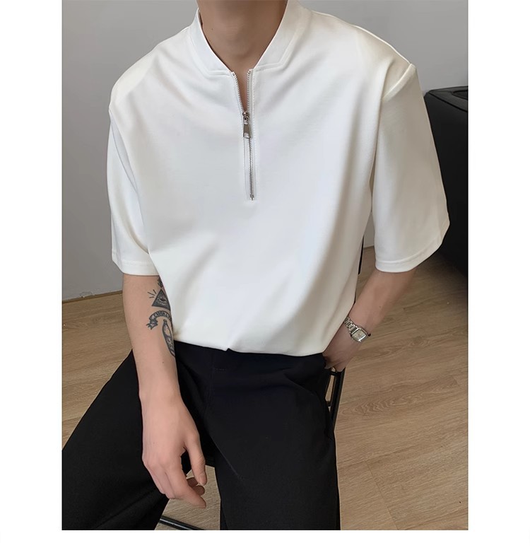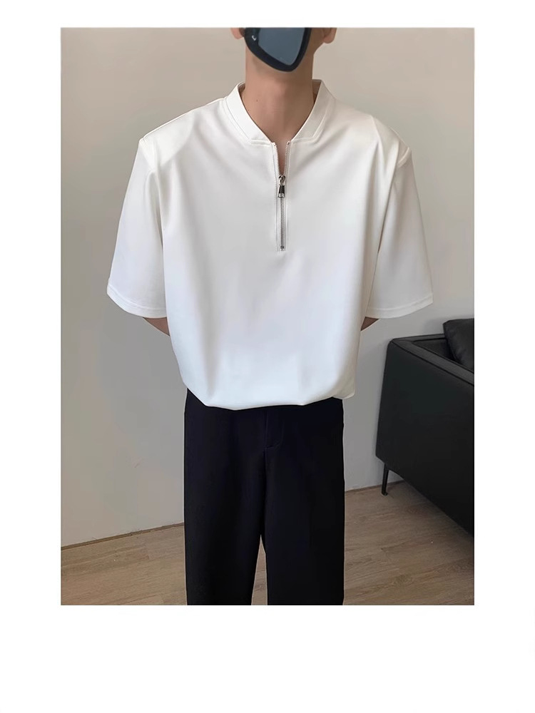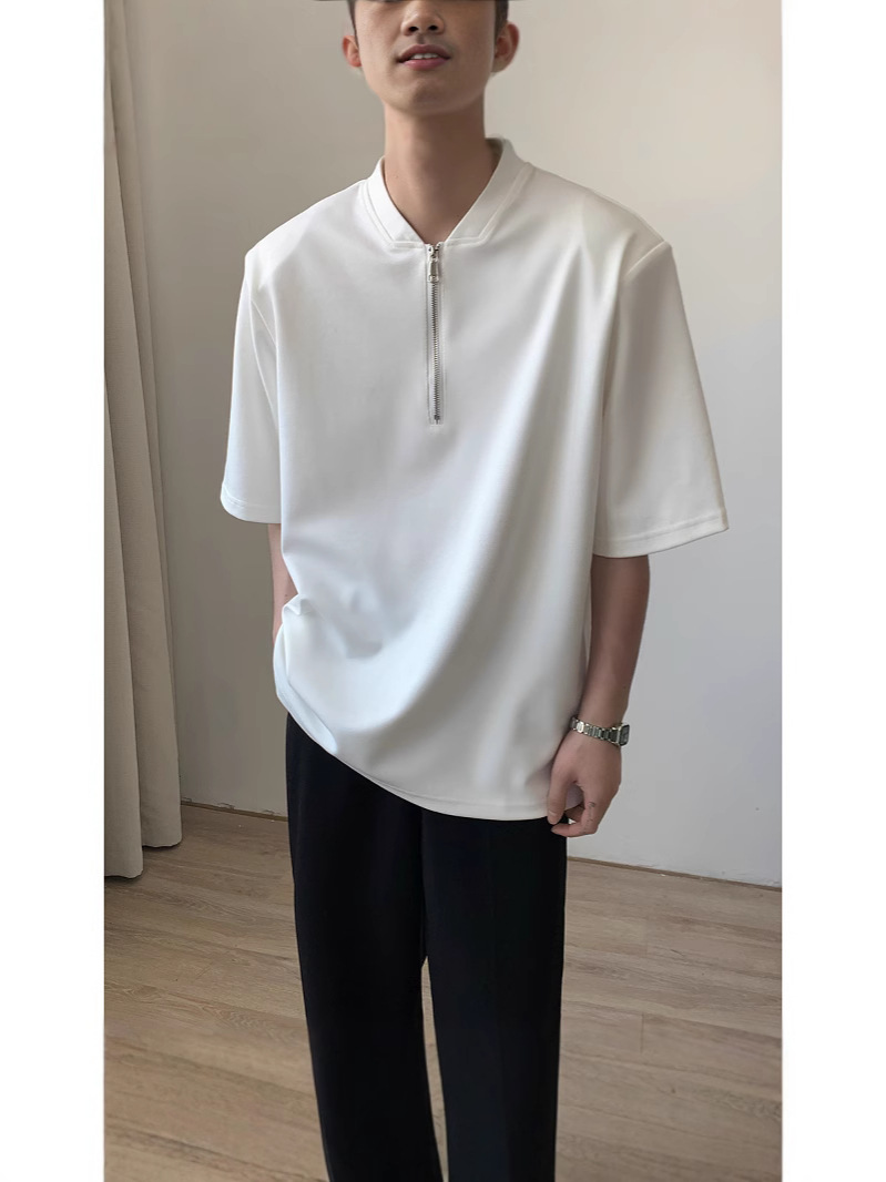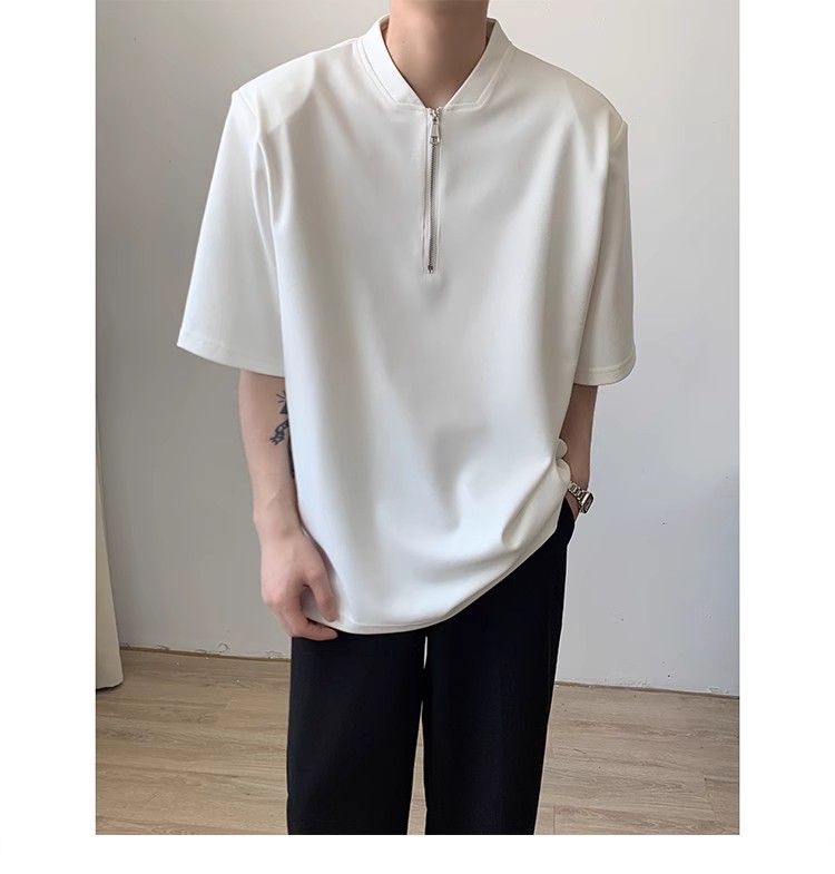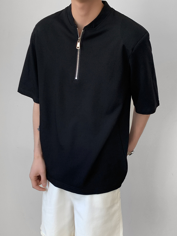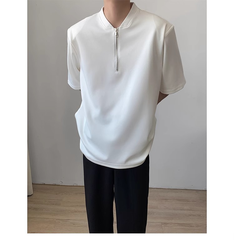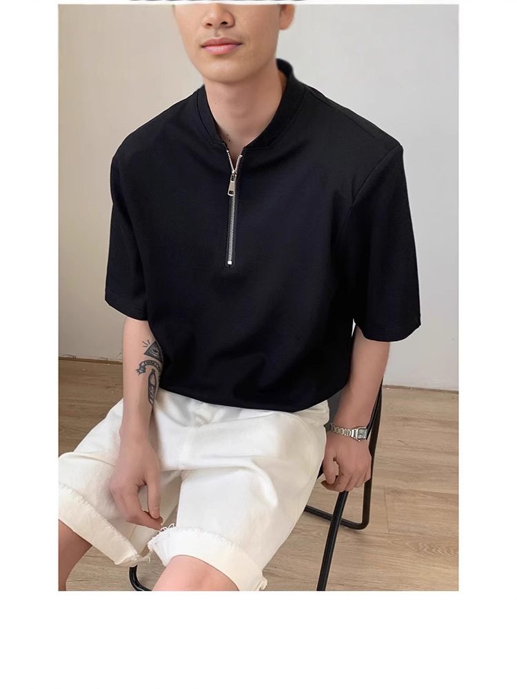 남성용 하이넥 디자인 하프 지퍼 어깨 패드 티셔츠, 쿨하고 금욕적인 루즈한 반팔 탑, 브이넥 헨리 셔츠