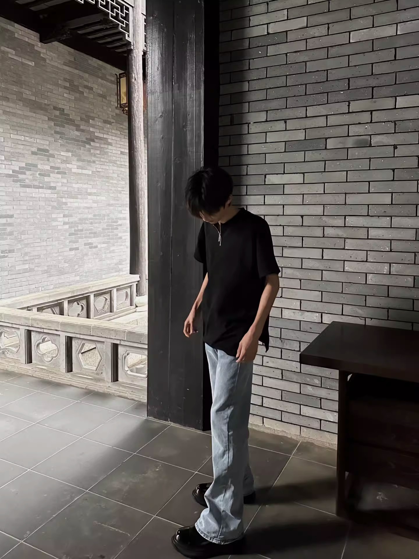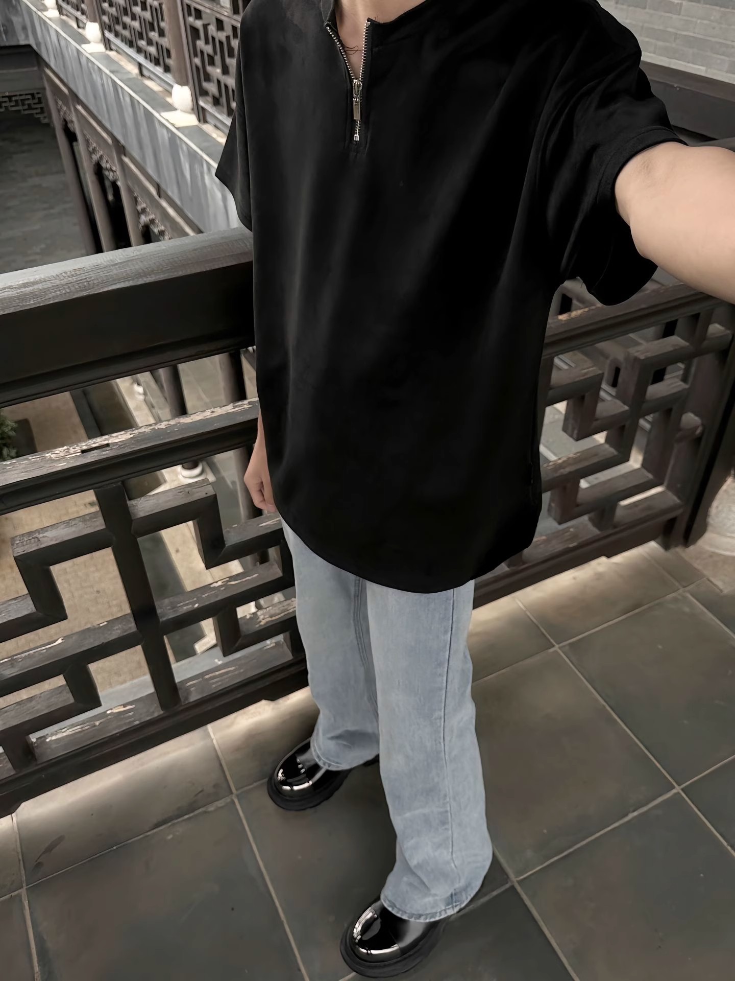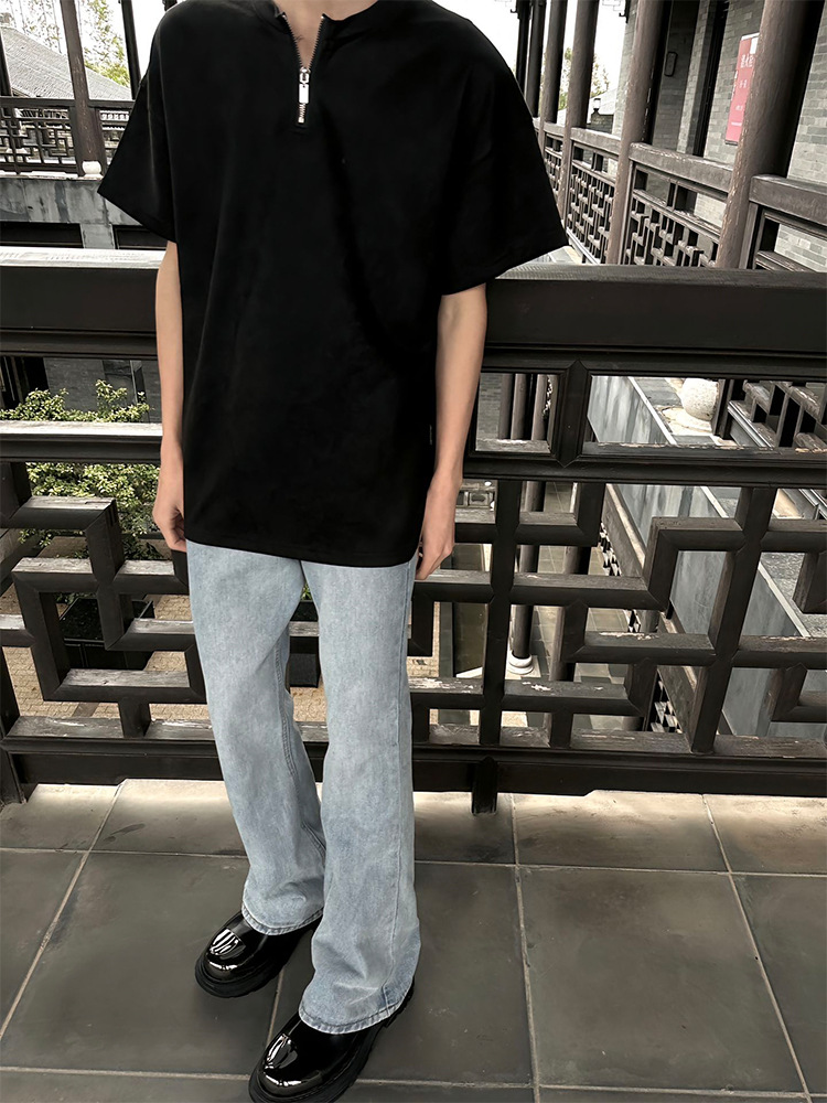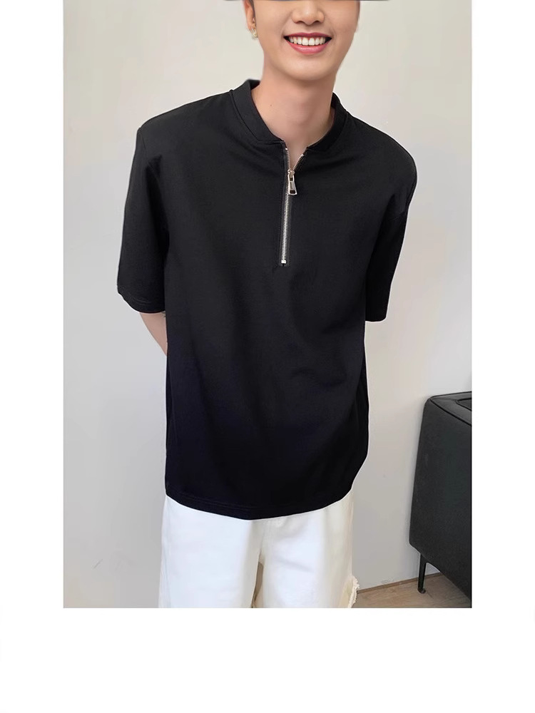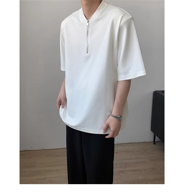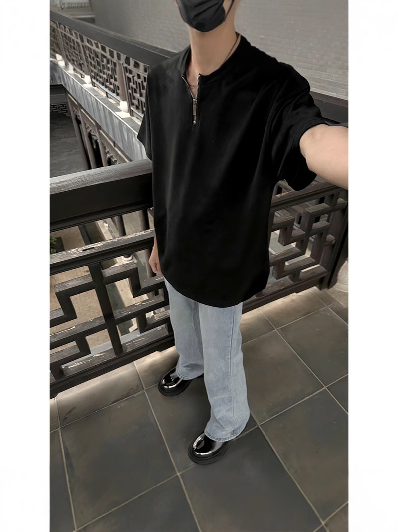 남성용 하이넥 디자인 하프 지퍼 어깨 패드 티셔츠, 쿨하고 금욕적인 루즈한 반팔 탑, 브이넥 헨리 셔츠