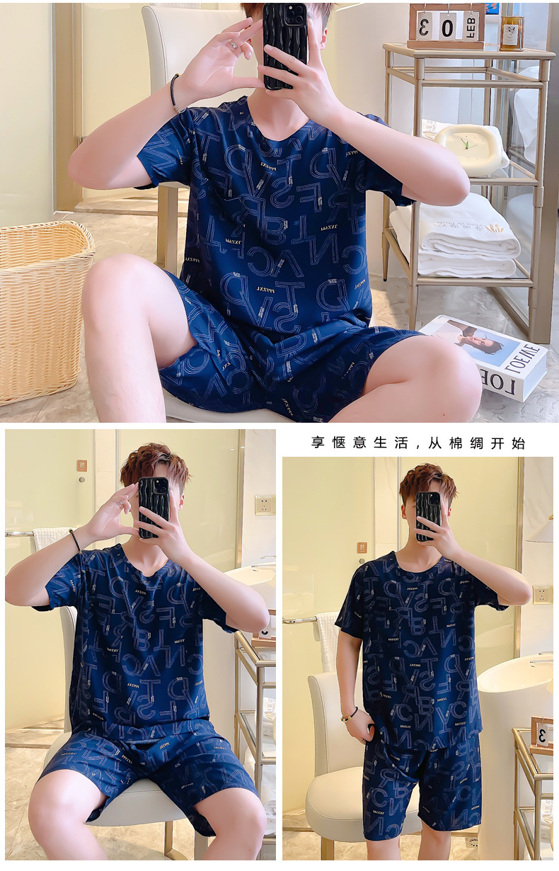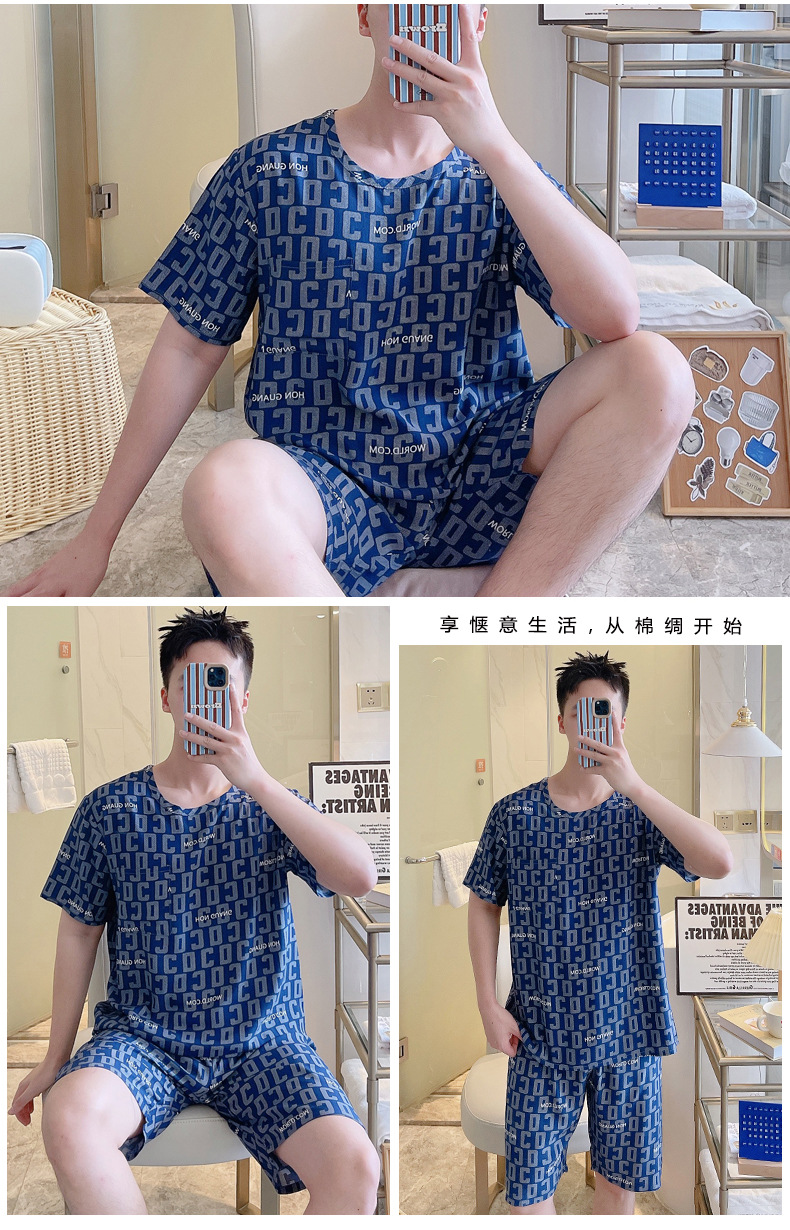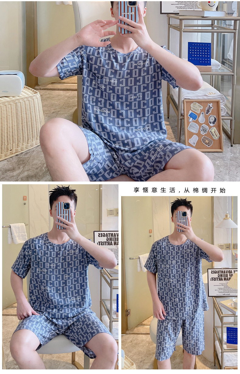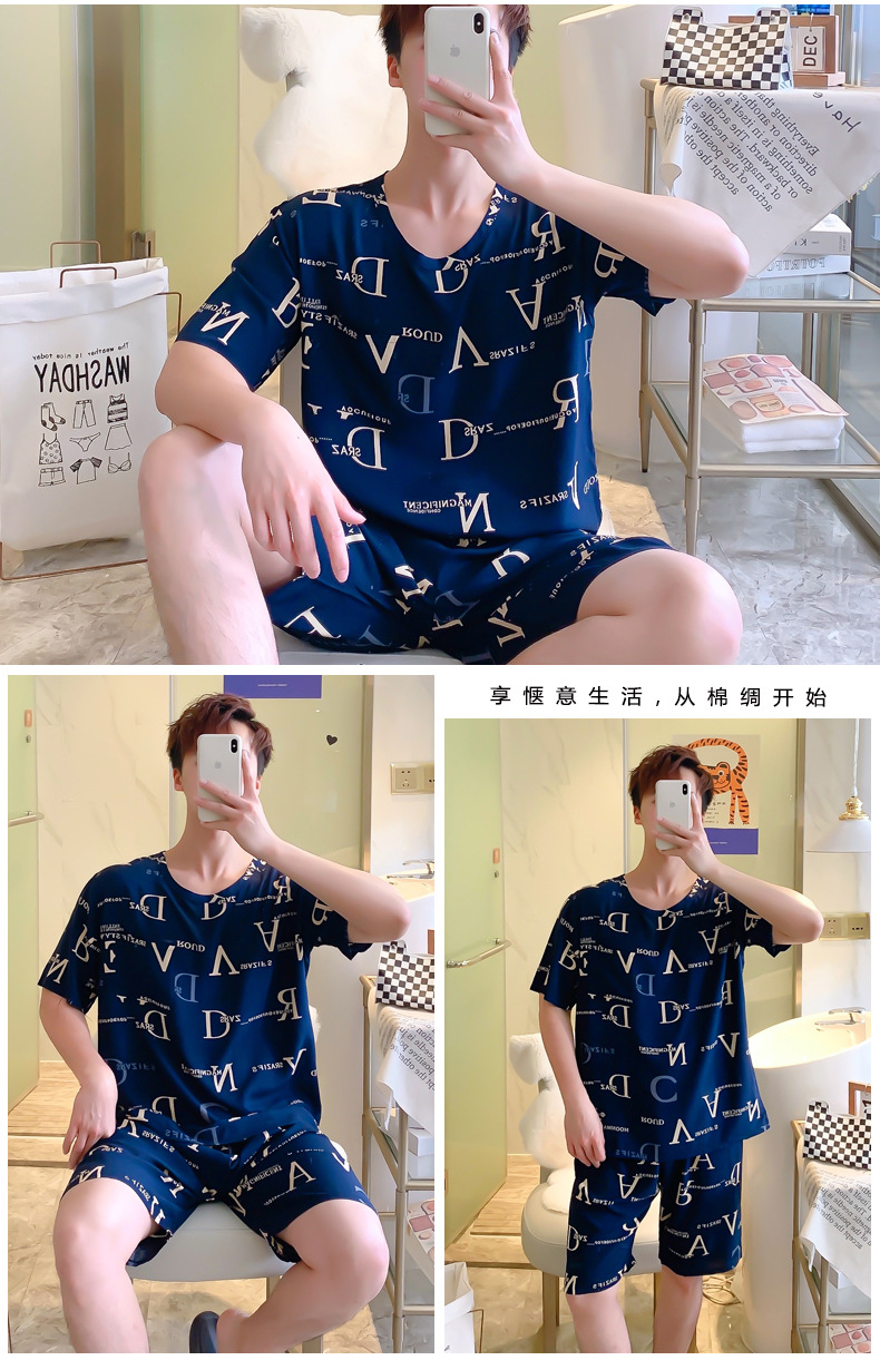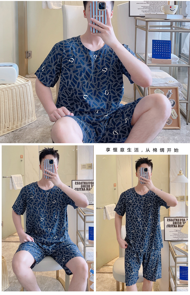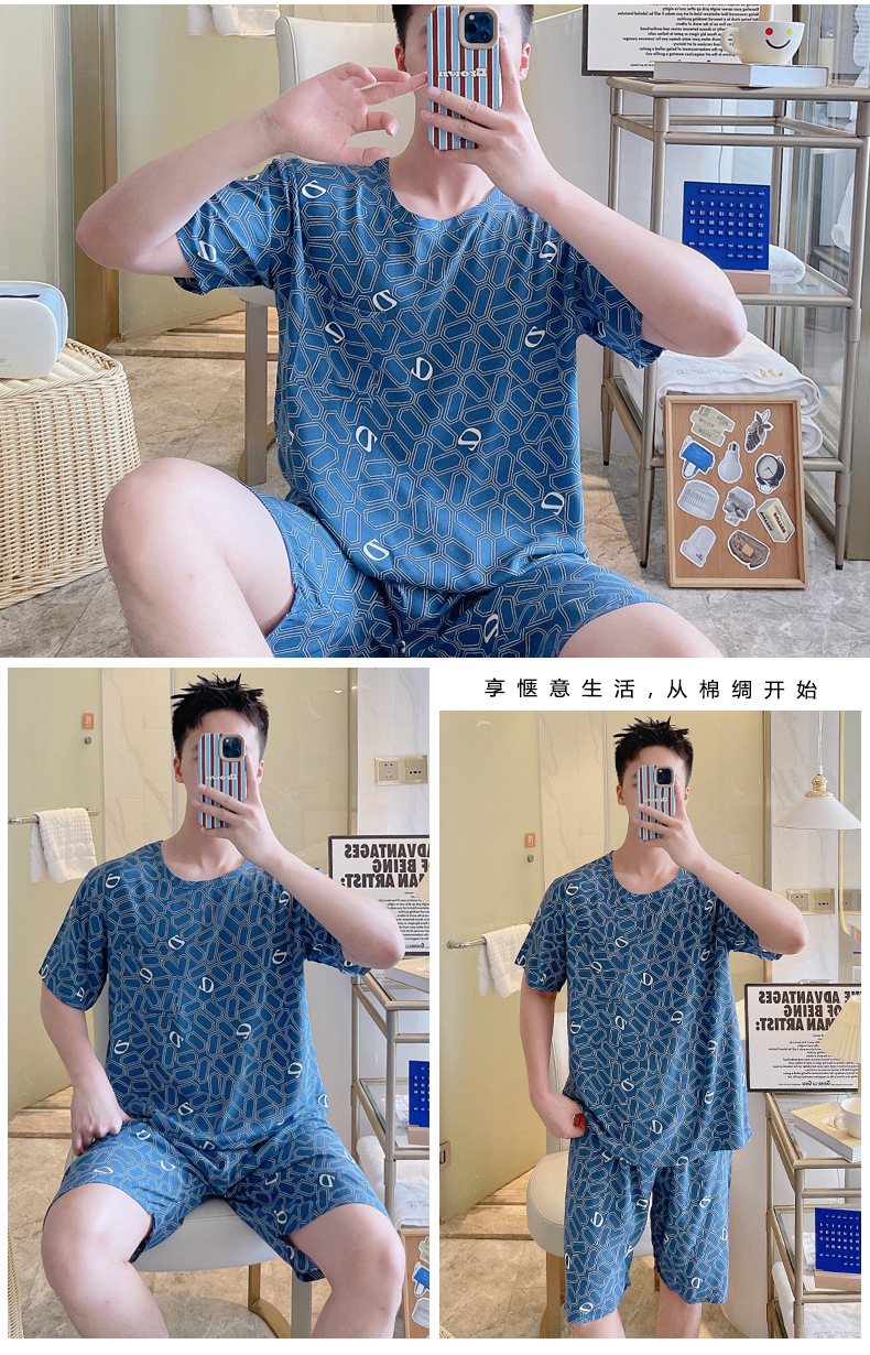 면 실크 잠옷 남성 여름 정장 반팔 투피스 양복 면 실크 면 가정복 캐주얼 플러스 사이즈 외부 착용 가능