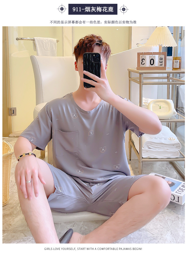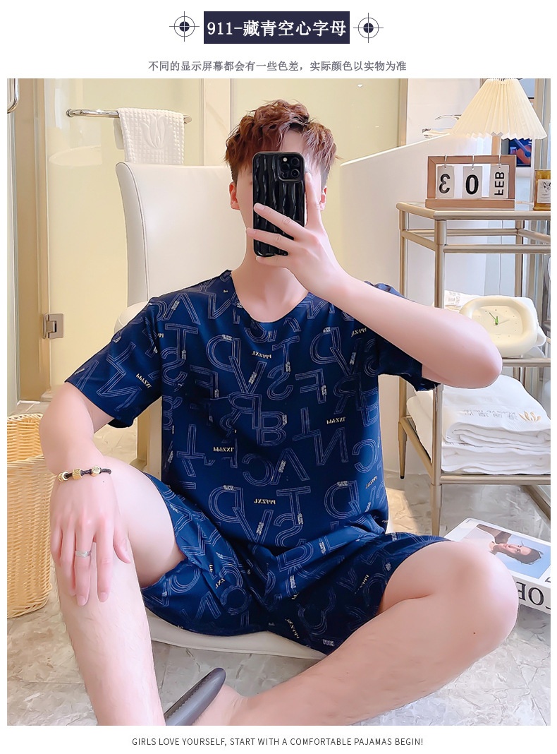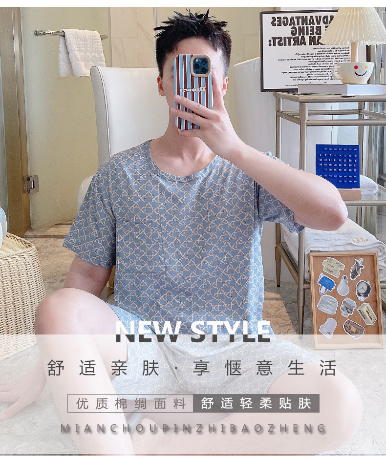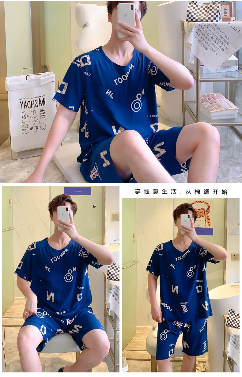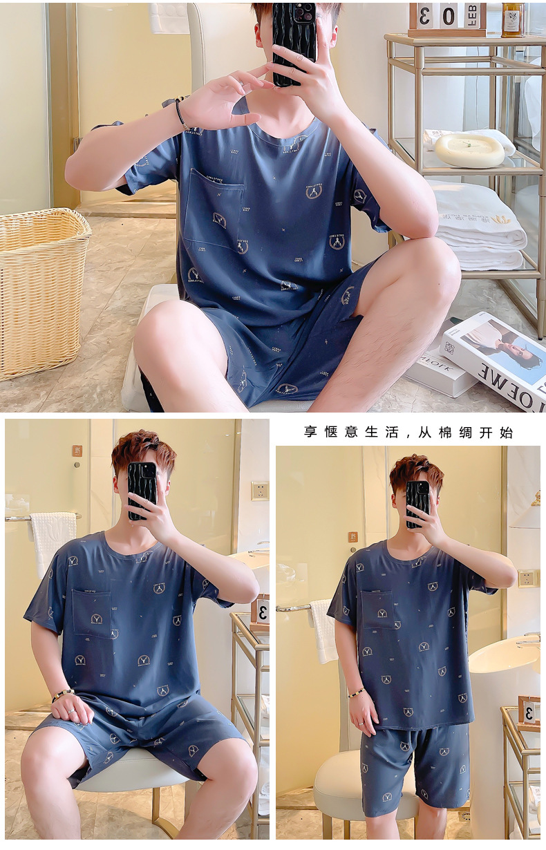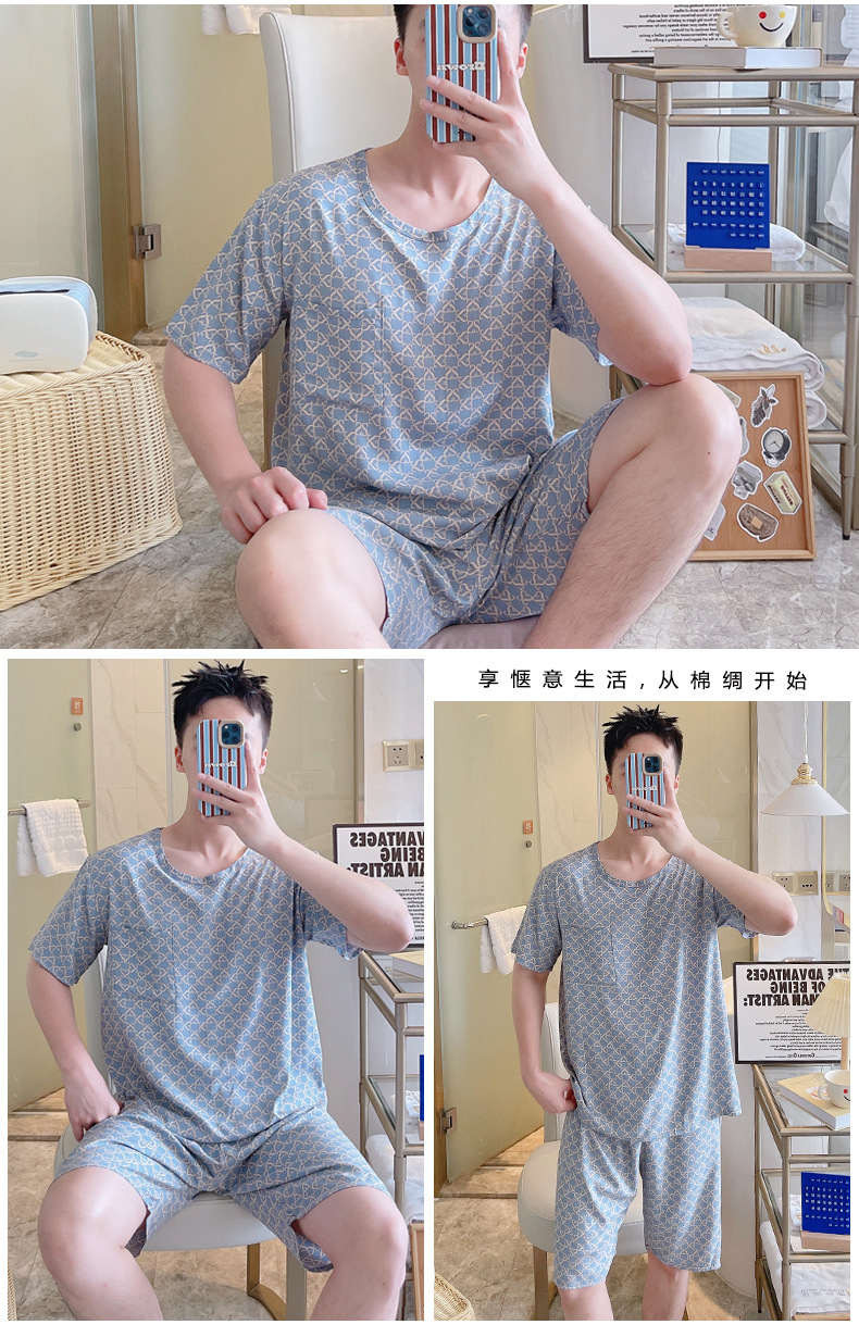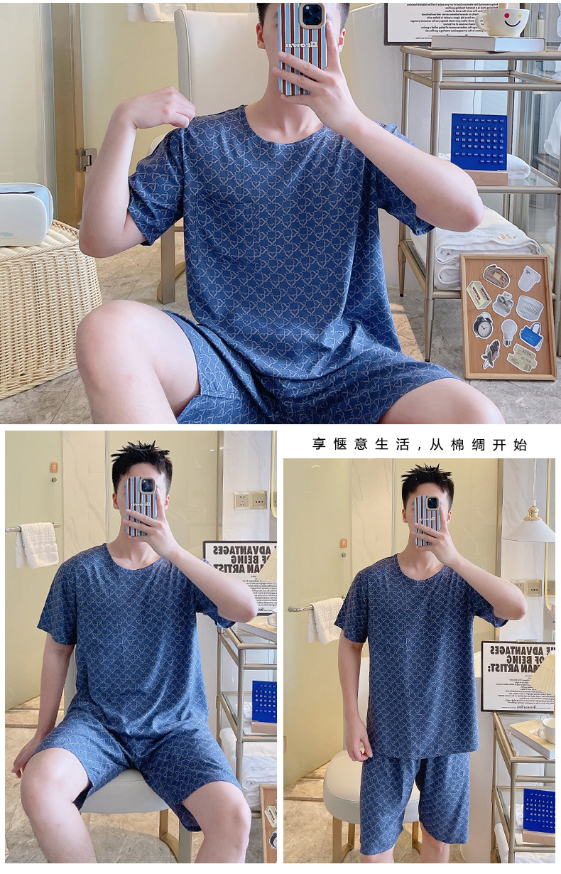 면 실크 잠옷 남성 여름 정장 반팔 투피스 양복 면 실크 면 가정복 캐주얼 플러스 사이즈 외부 착용 가능