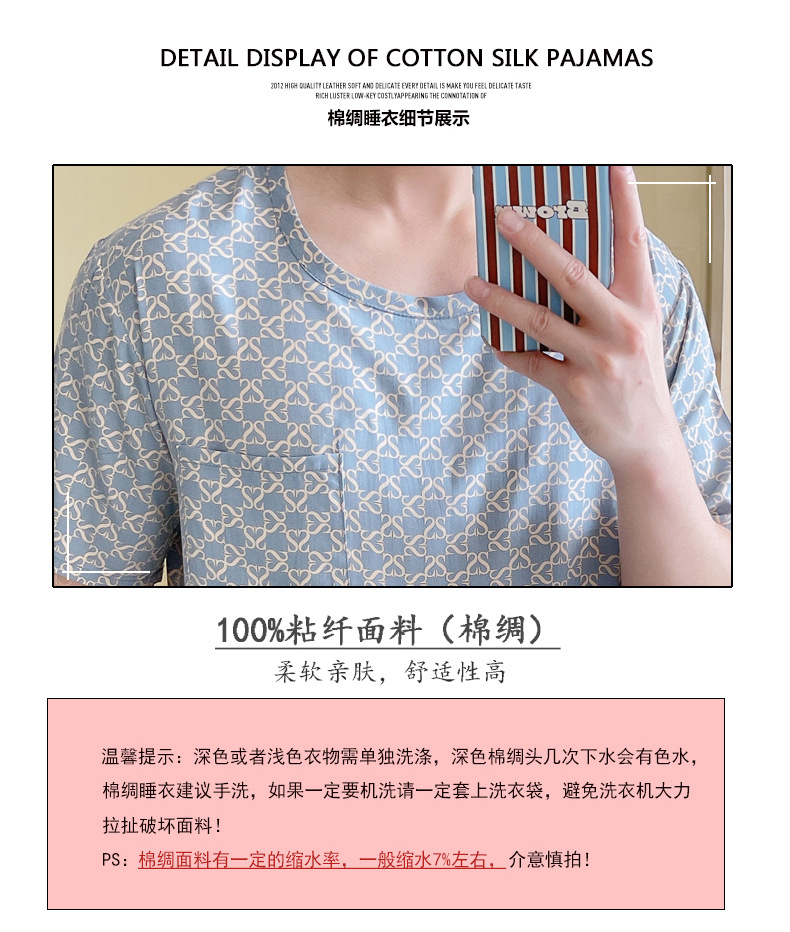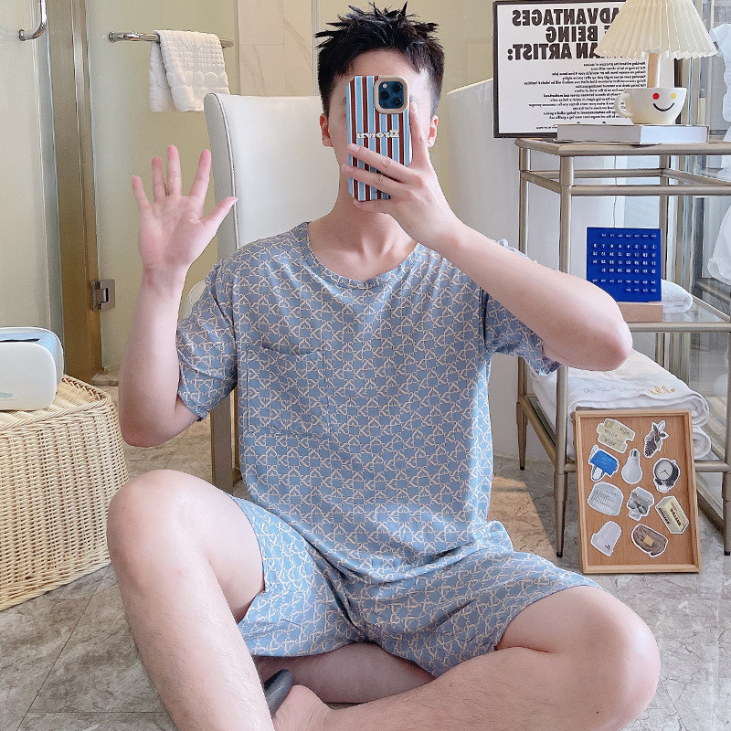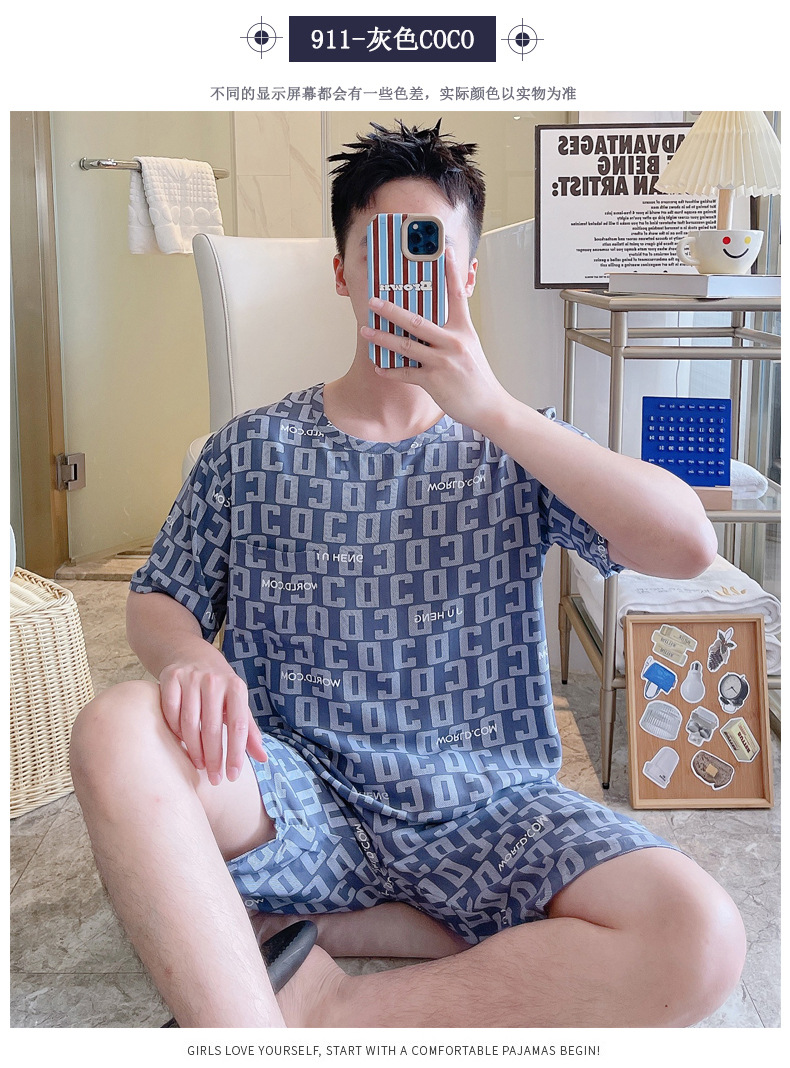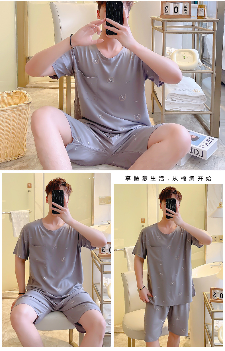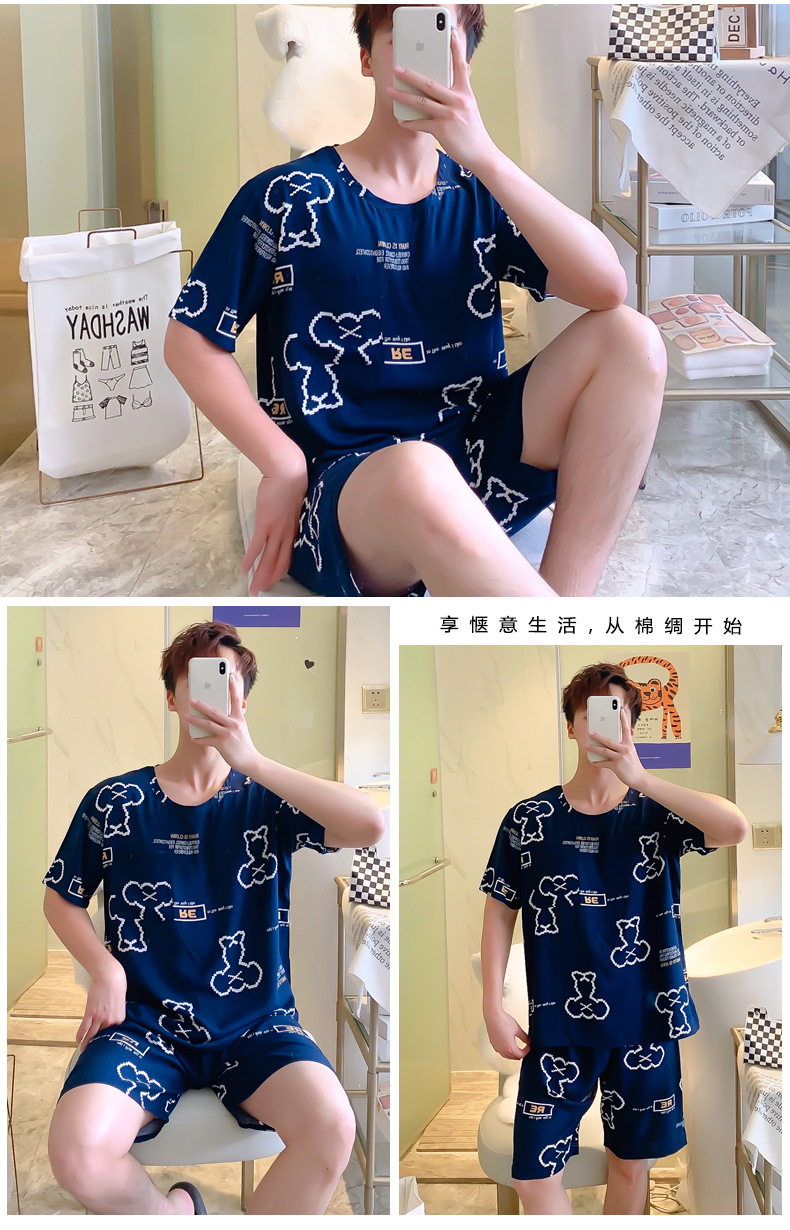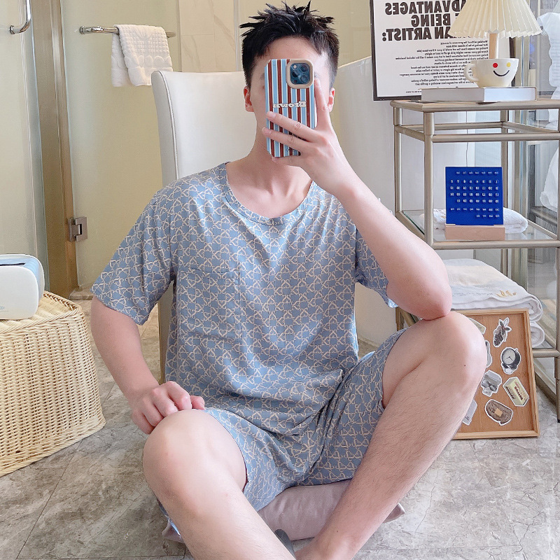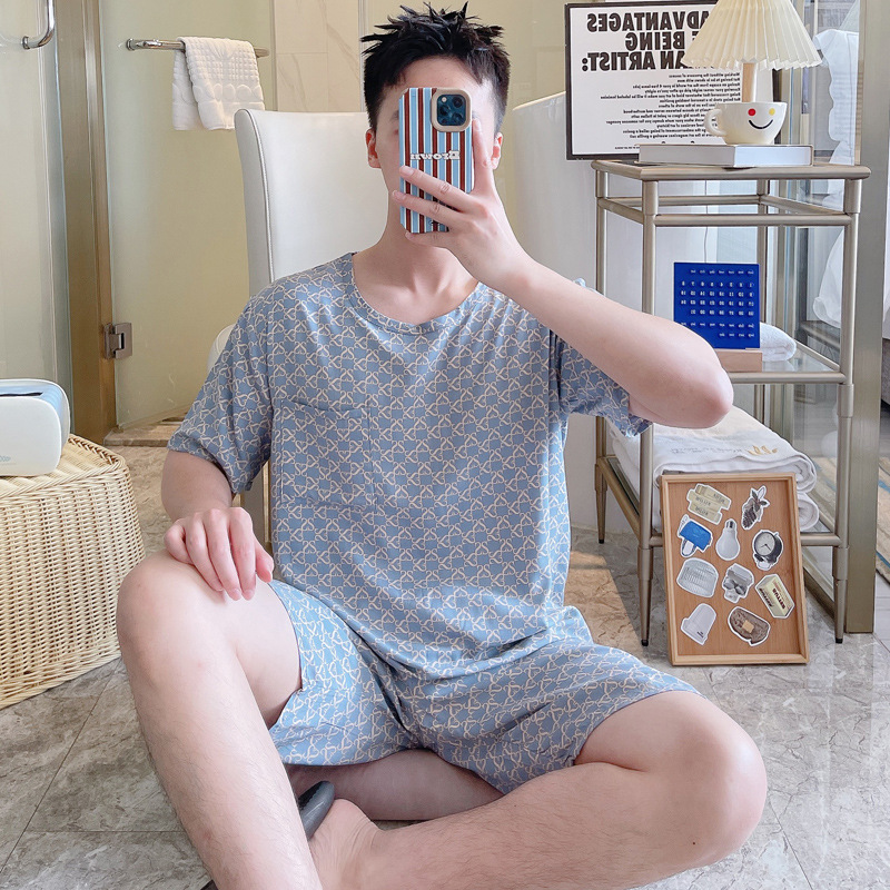 면 실크 잠옷 남성 여름 정장 반팔 투피스 양복 면 실크 면 가정복 캐주얼 플러스 사이즈 외부 착용 가능