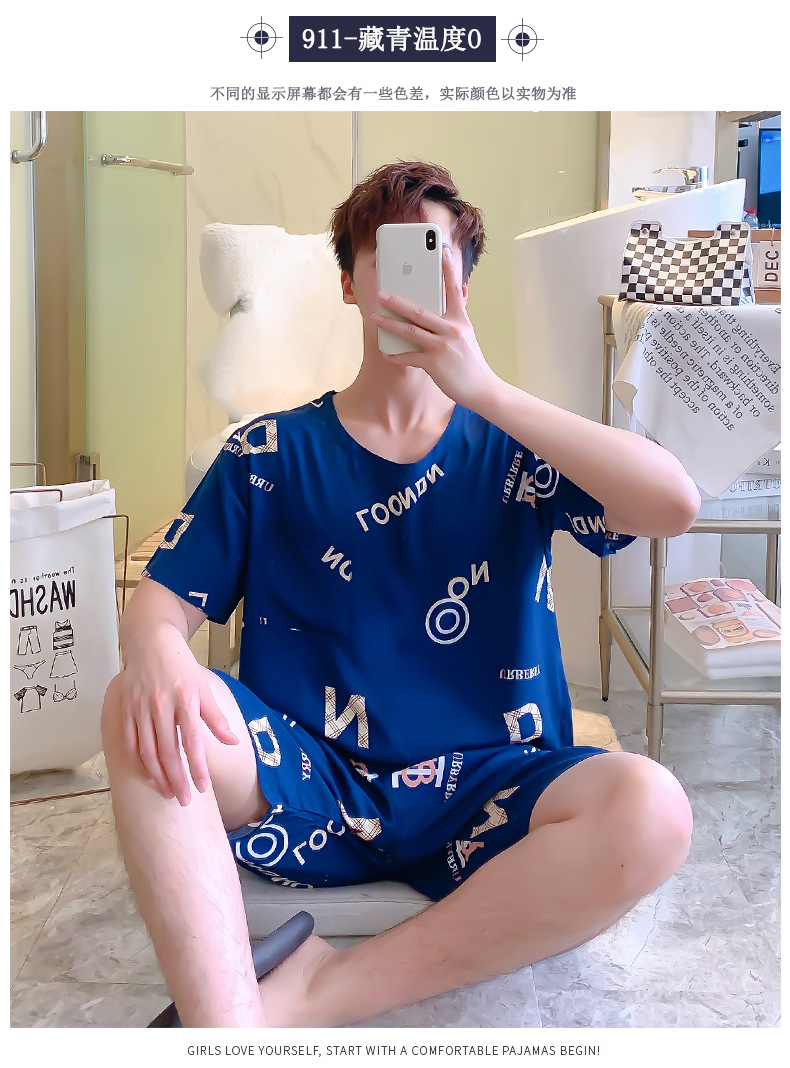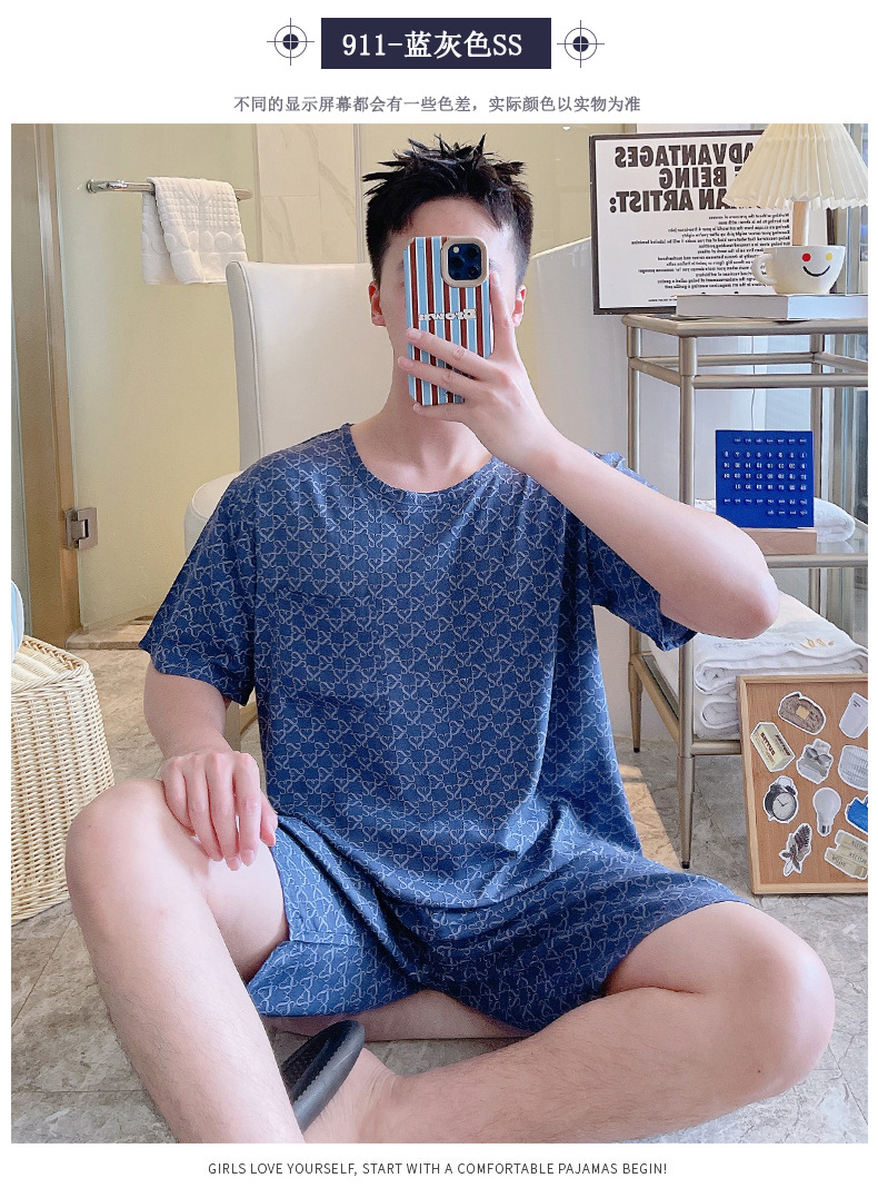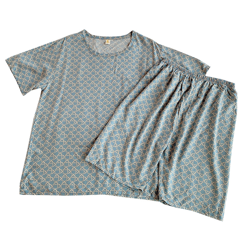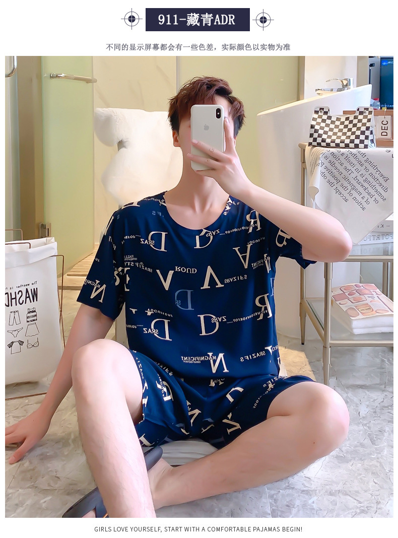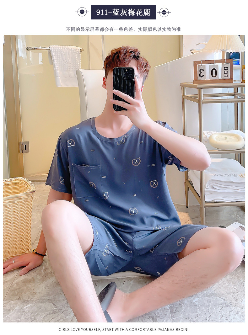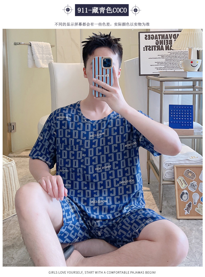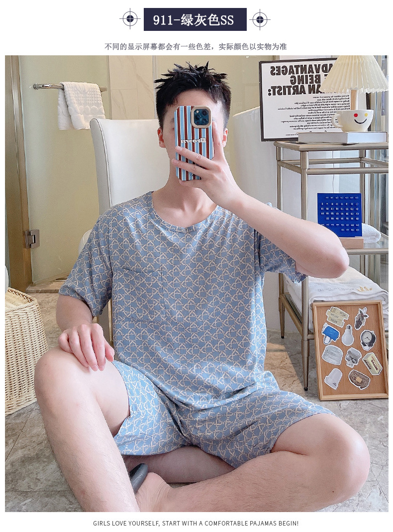 면 실크 잠옷 남성 여름 정장 반팔 투피스 양복 면 실크 면 가정복 캐주얼 플러스 사이즈 외부 착용 가능