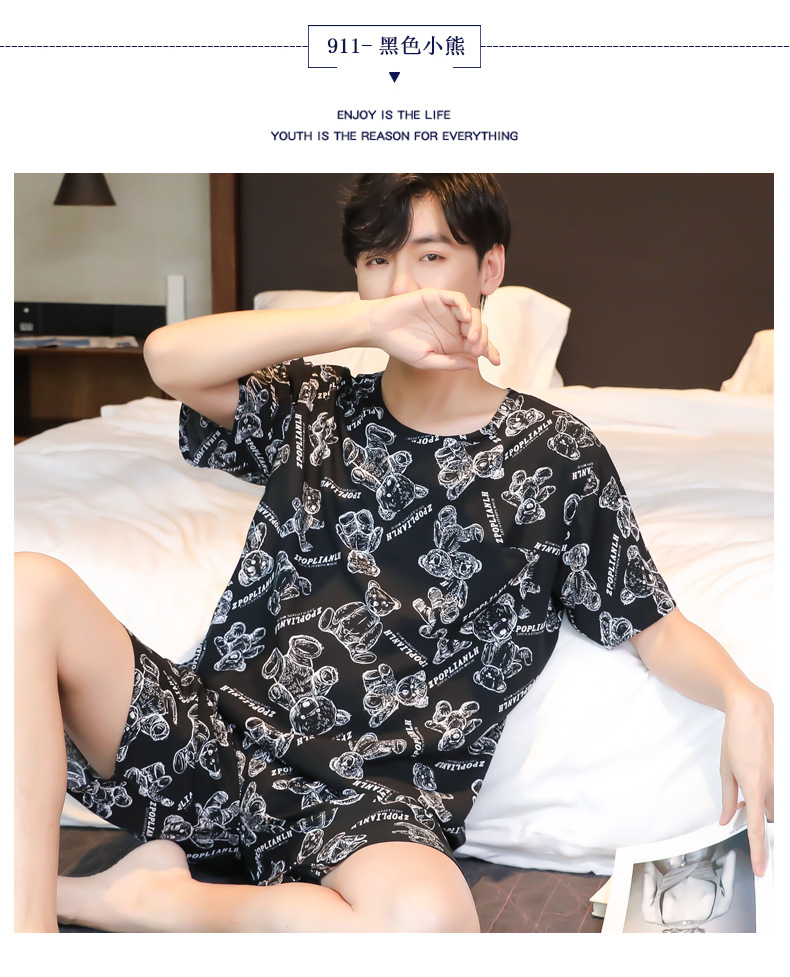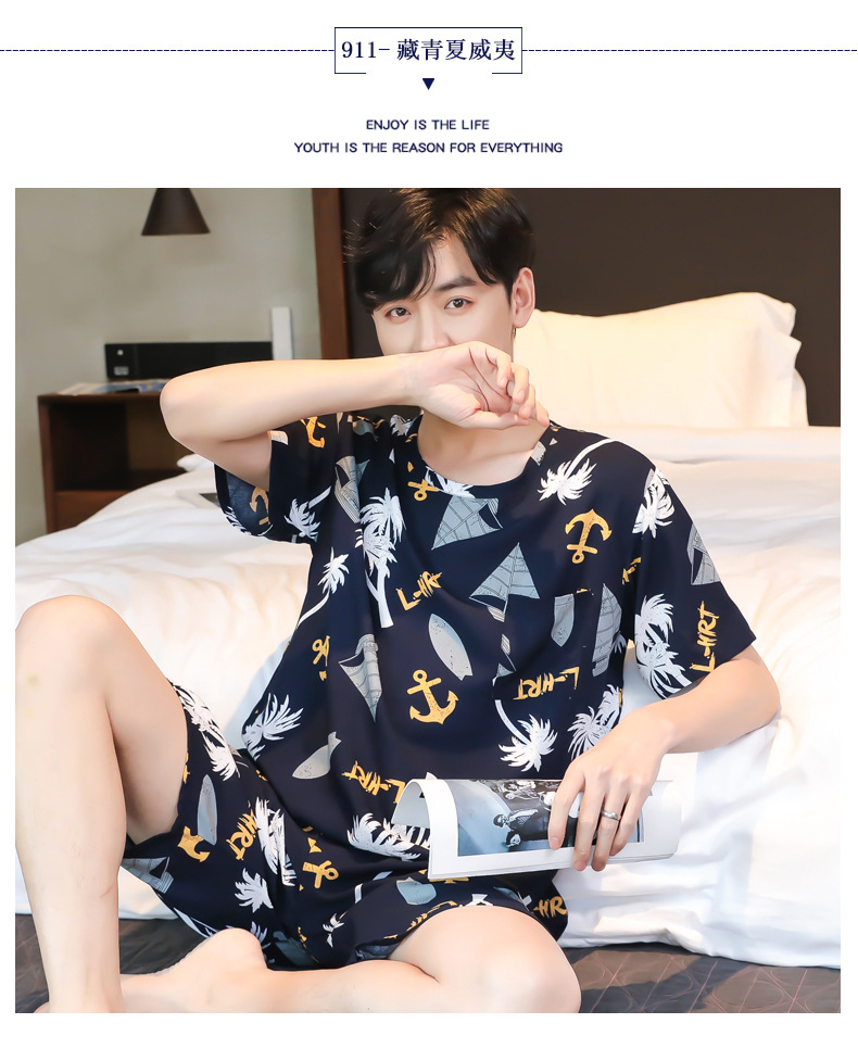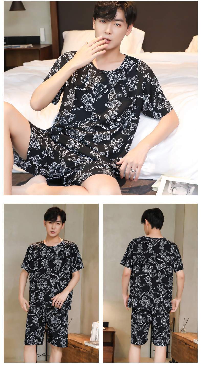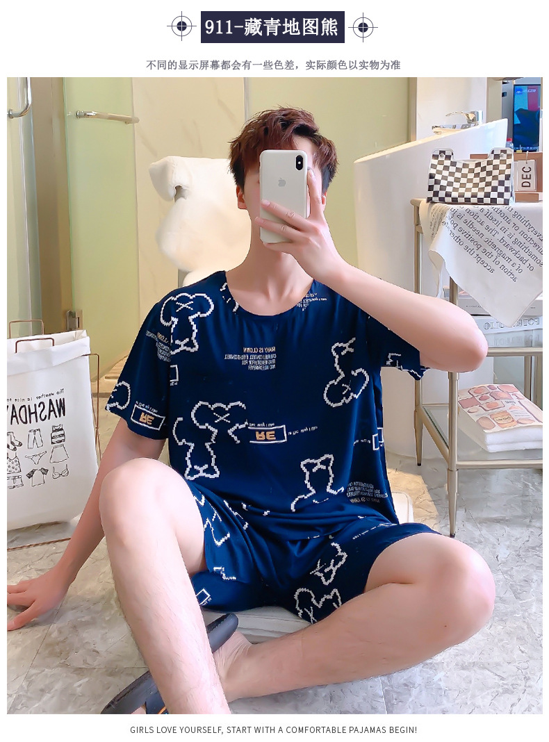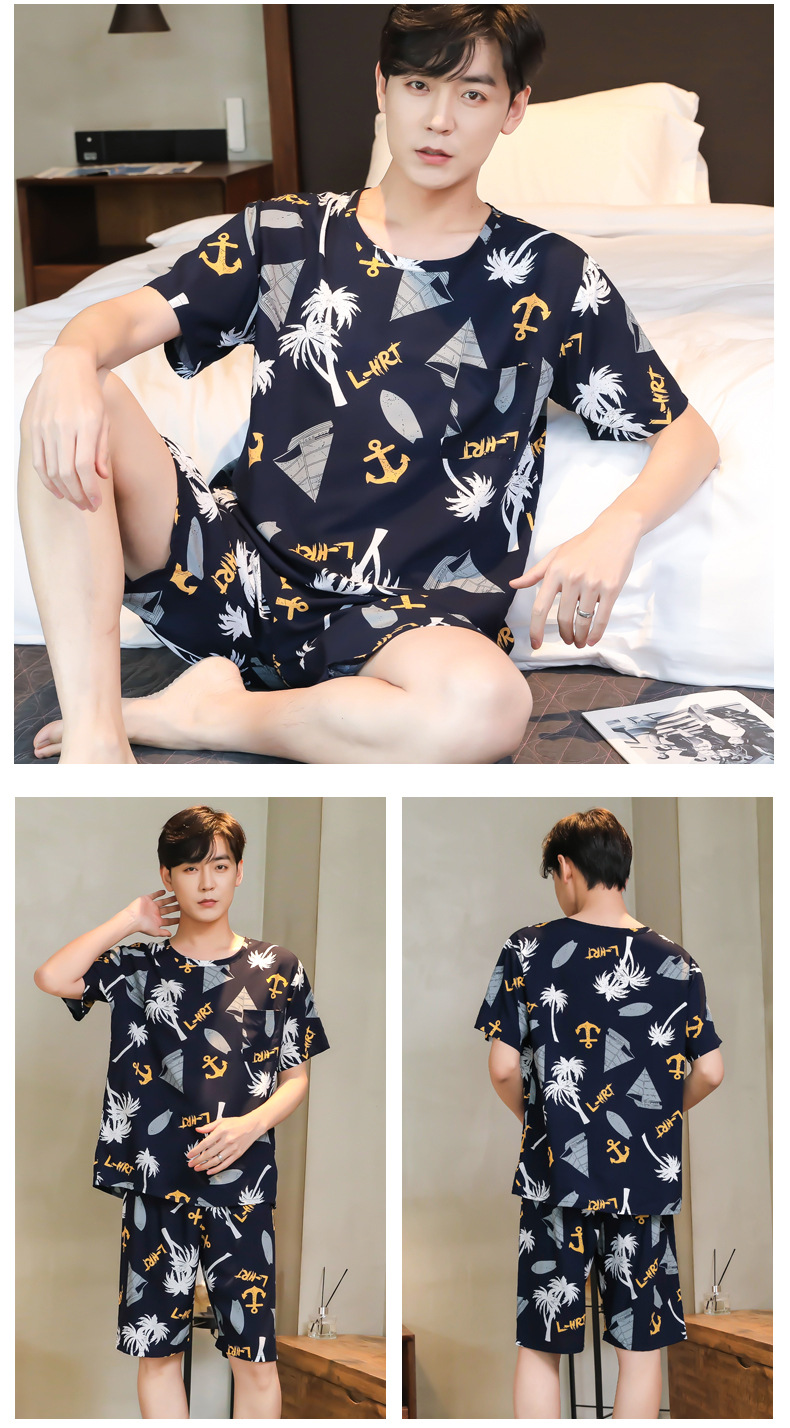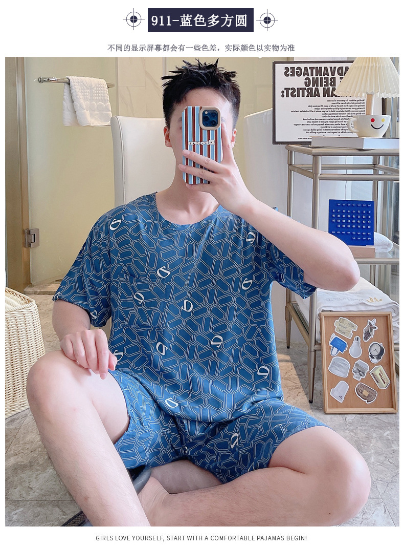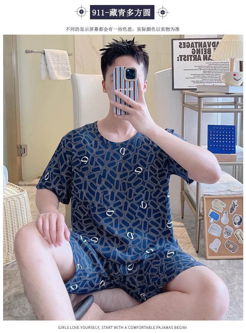 면 실크 잠옷 남성 여름 정장 반팔 투피스 양복 면 실크 면 가정복 캐주얼 플러스 사이즈 외부 착용 가능